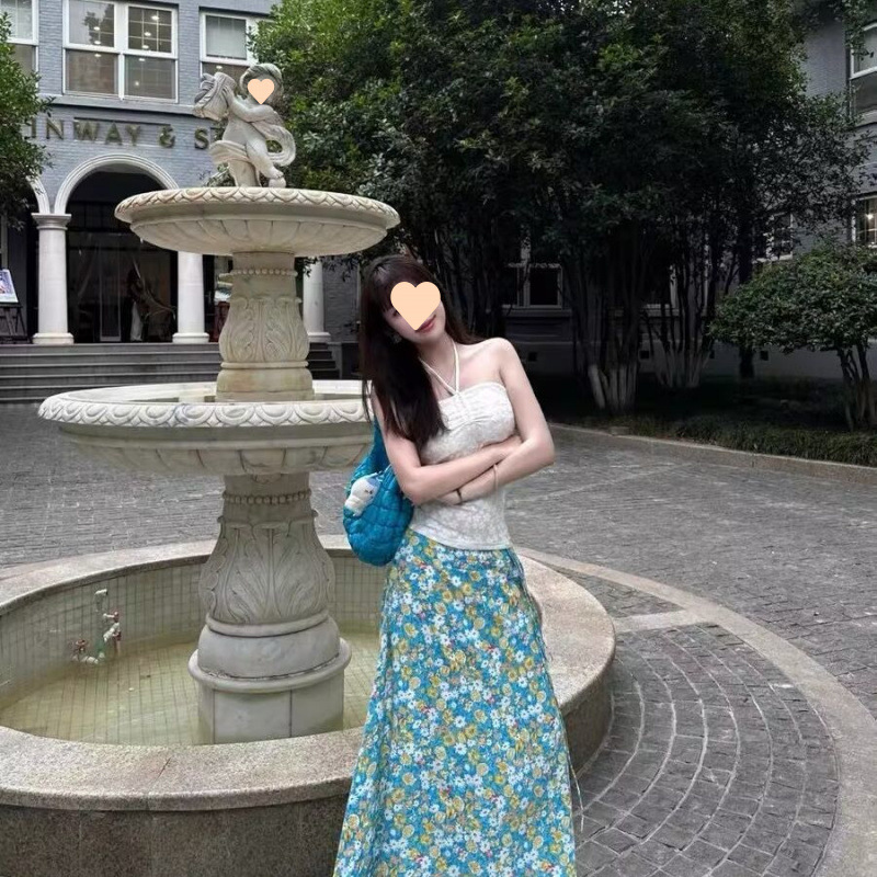 Топ + юбка [костюм]; Кружевной топ [цельный]; Юбка с цветочным принтом [цельная вещь]