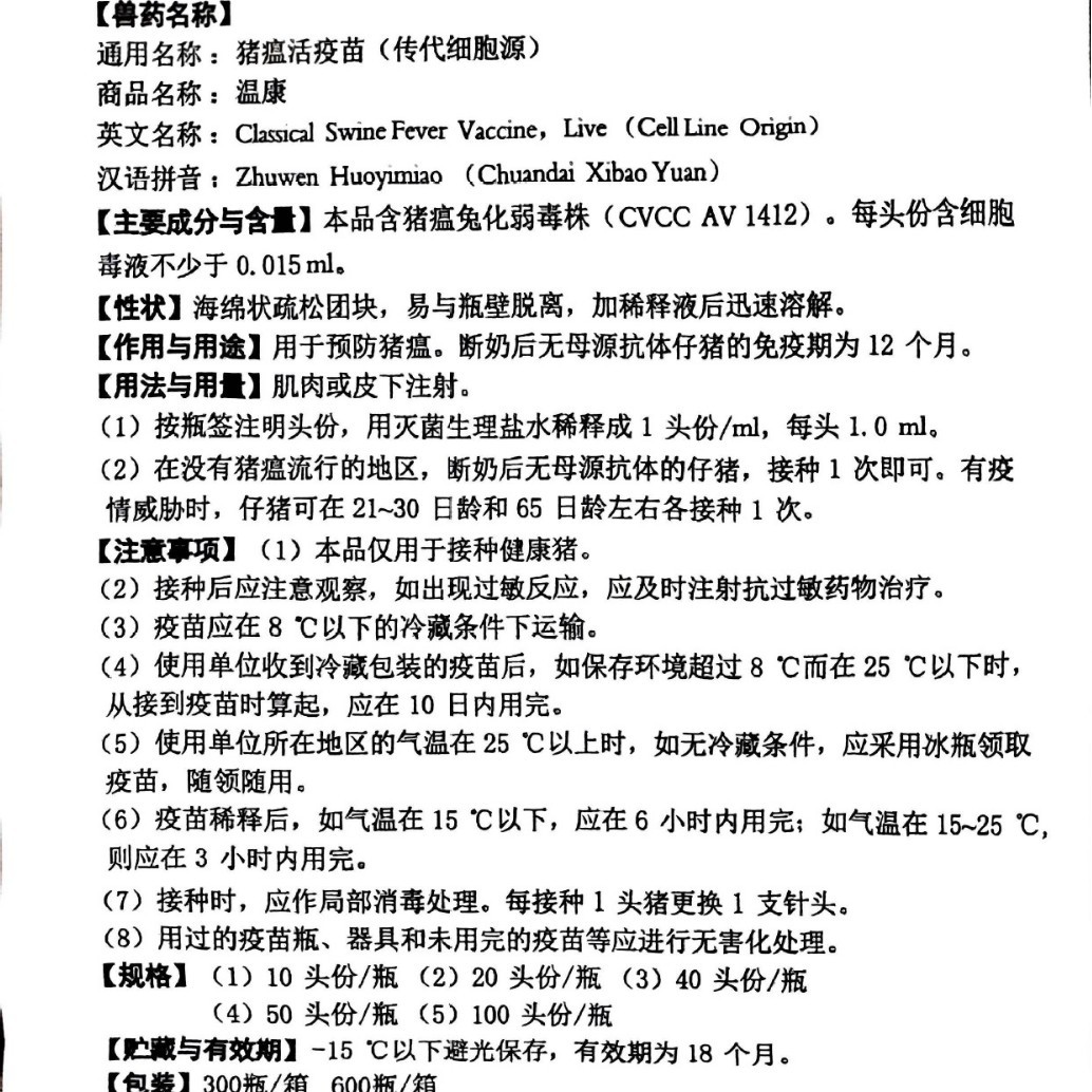Вакцина от свиной лихорадки Wen Kang Jin Yu Yi Kang Live, вакцина от свиной лихорадки на основе клеток, 10 доз для свиней.