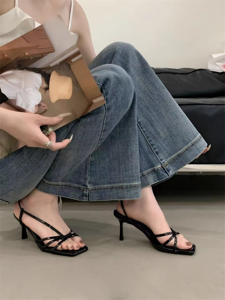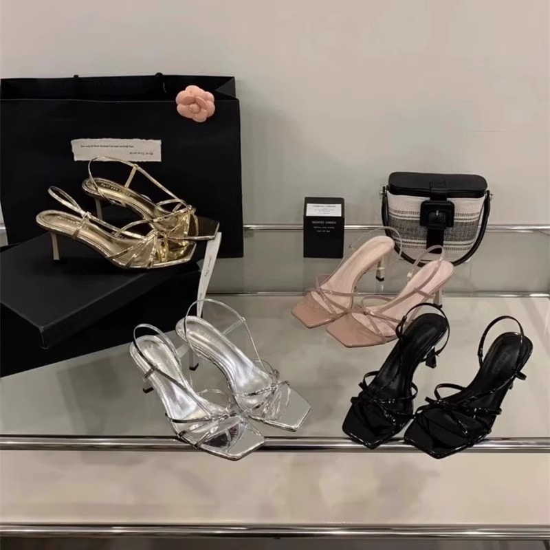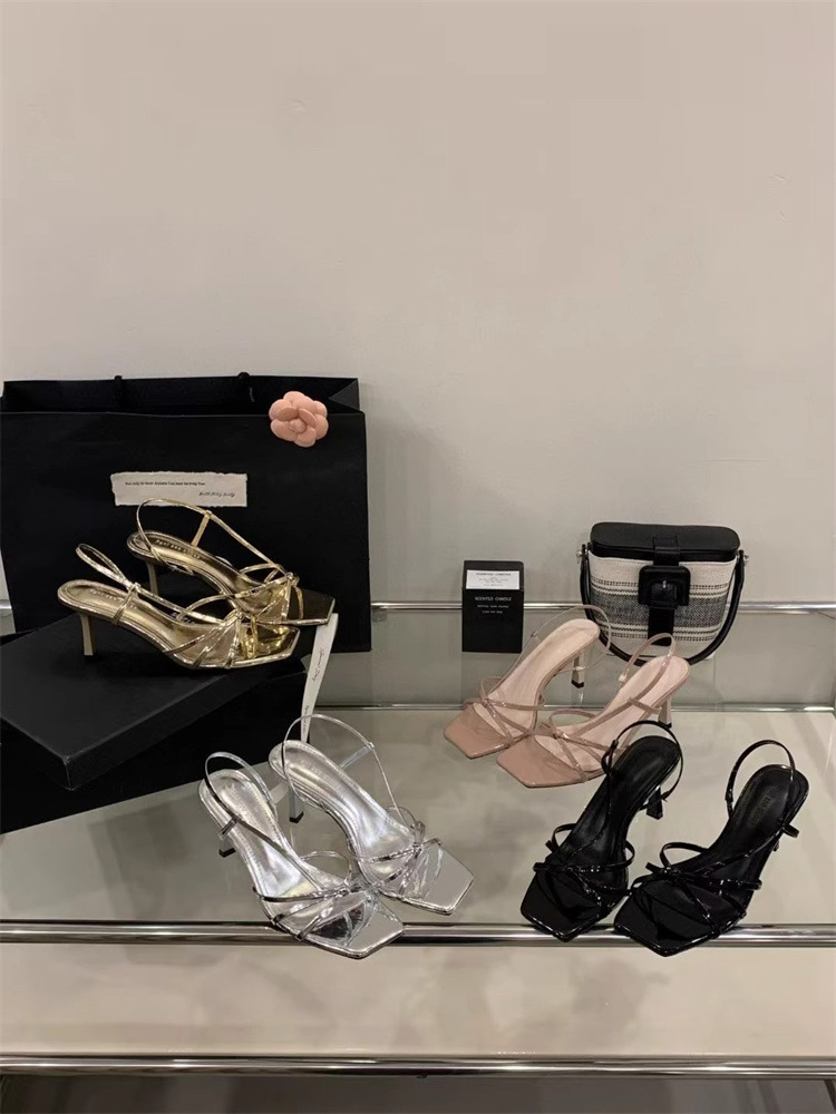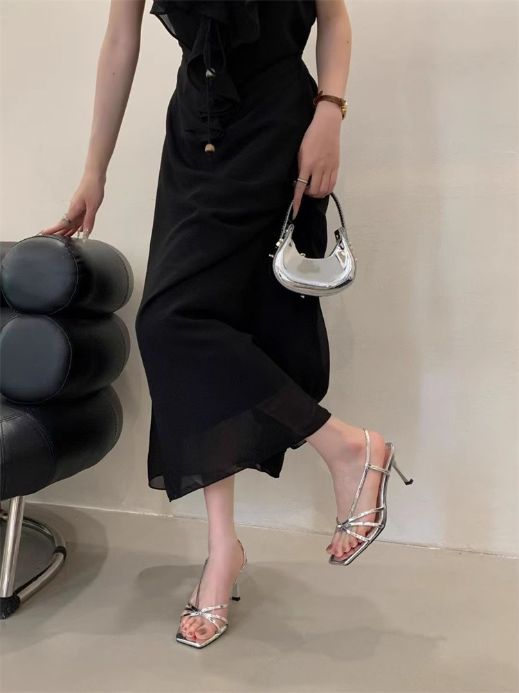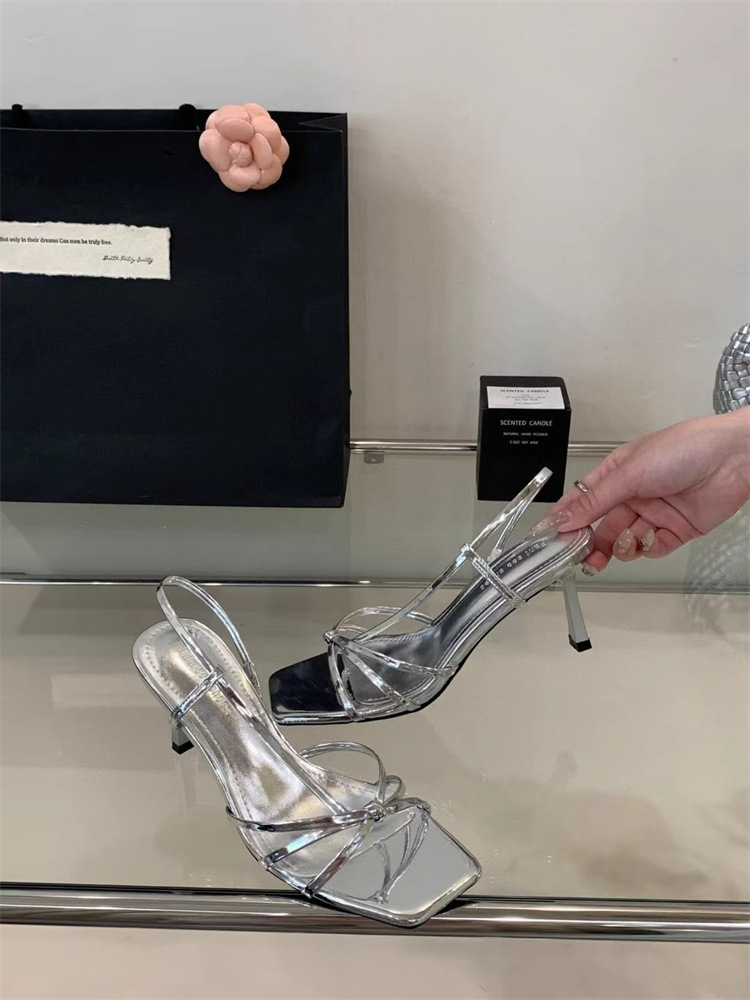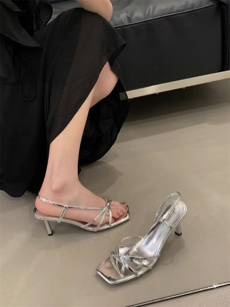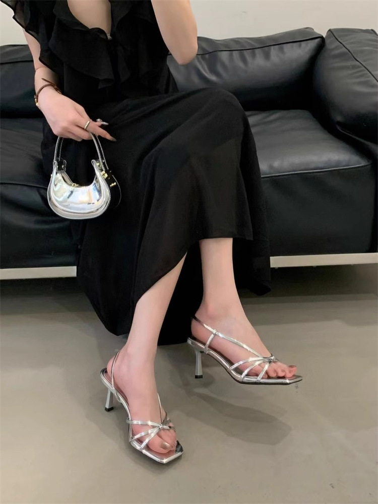 Французские босоножки на высоком каблуке 2025, новые элегантные с квадратным носком, боковыми вырезами, стилетто, серебряные, с тонкими ремешками, открытые, для женщин, лето