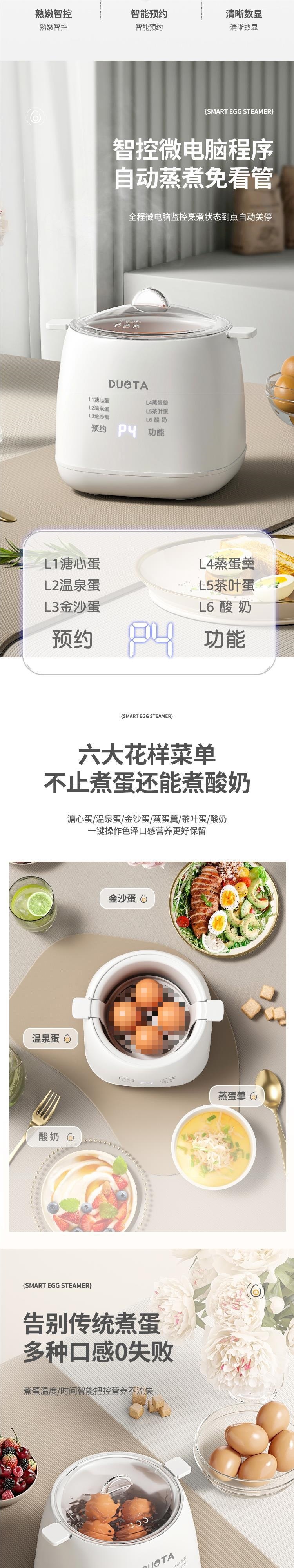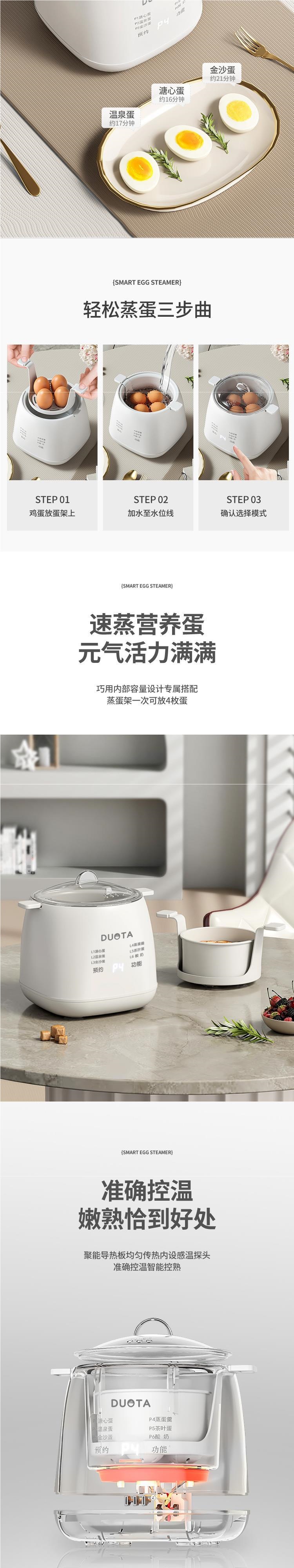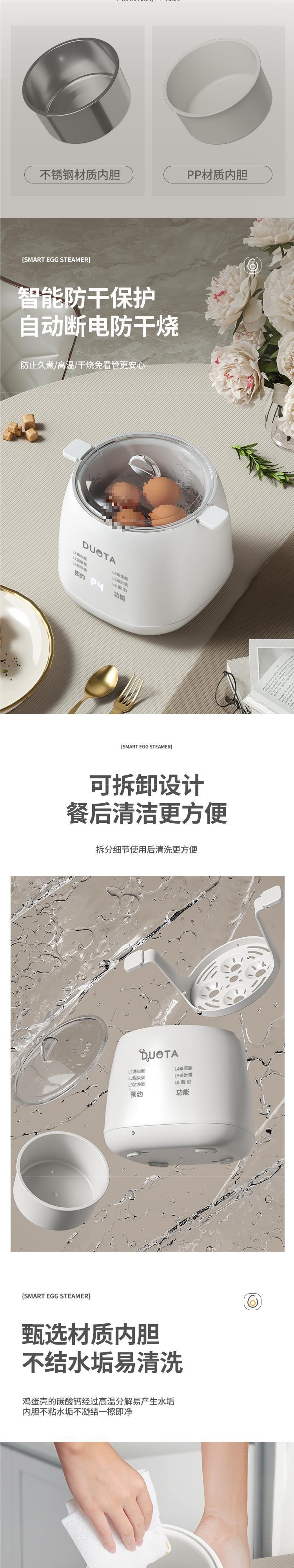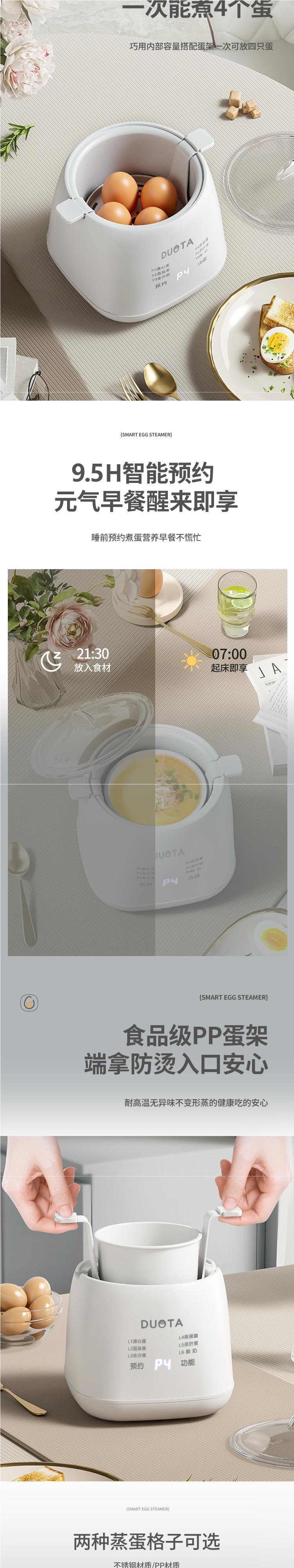 Яйцеварка + яйцевоз, стандартная версия; Яйцеварка + подставка для яиц + миска из полипропилена, средняя версия; Яйцеварка + подставка для яиц + высококачественная версия чаши 304; Яйцеварка + подставка для яиц + чаша 304 + пароварка, роскошная версия