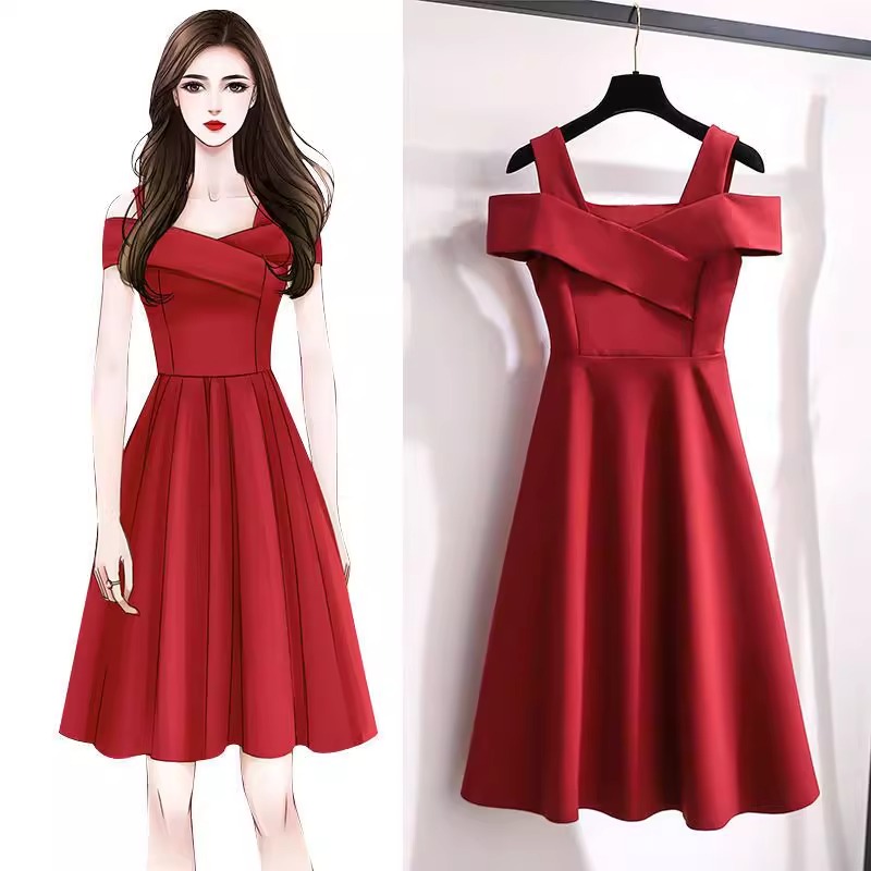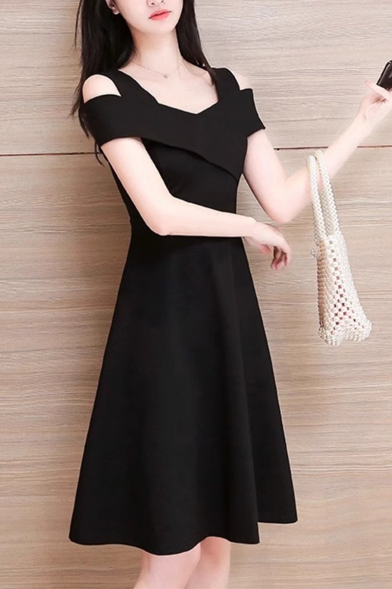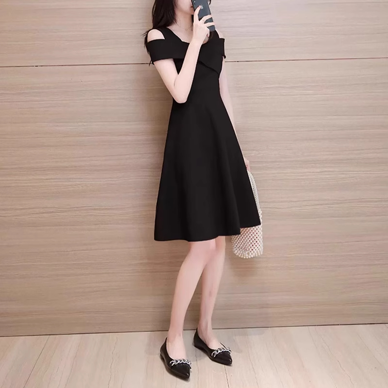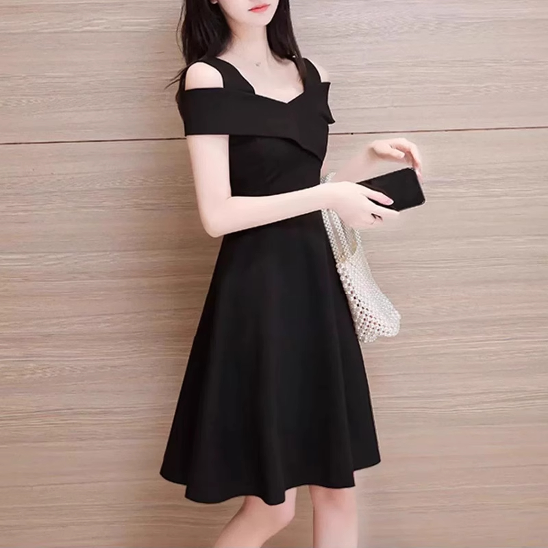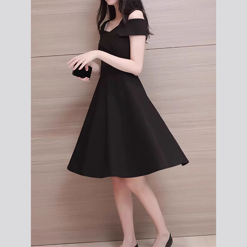Женское платье с открытыми плечами и завышенной талией, лето 2025, новинка плюс-сайз, стройнящее платье в стиле Хепберн, маленькое черное платье.