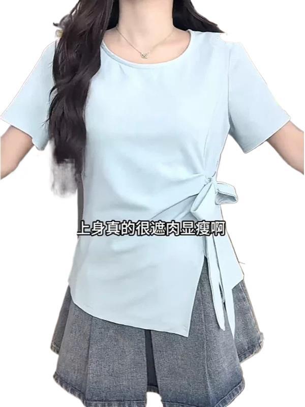 Повседневная женская футболка нестандартной формы с короткими рукавами больших размеров, новый летний стиль 2025 года для пышных женщин, закрывающих и стройнящих.