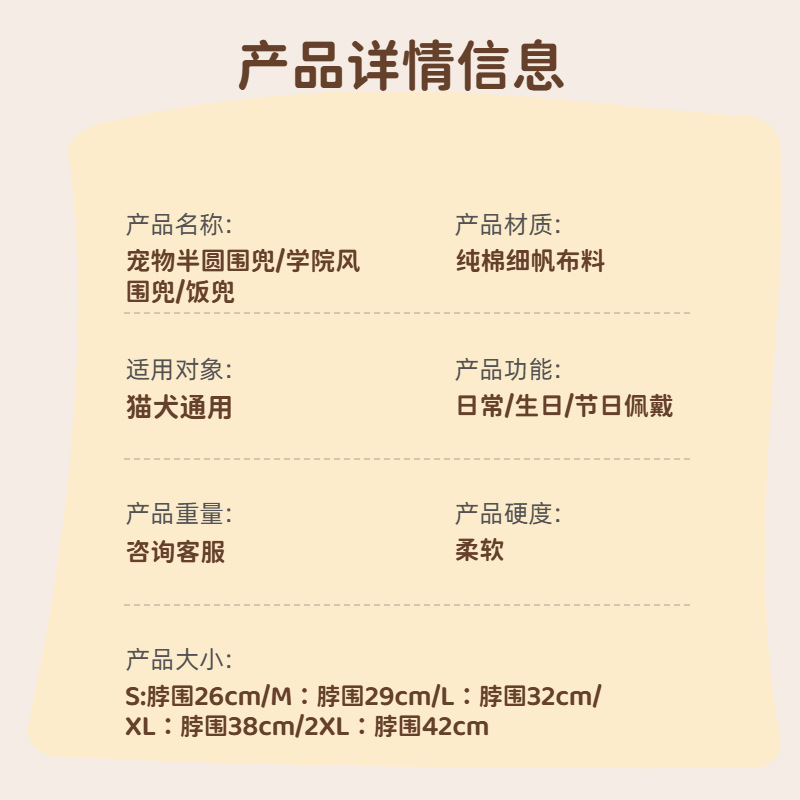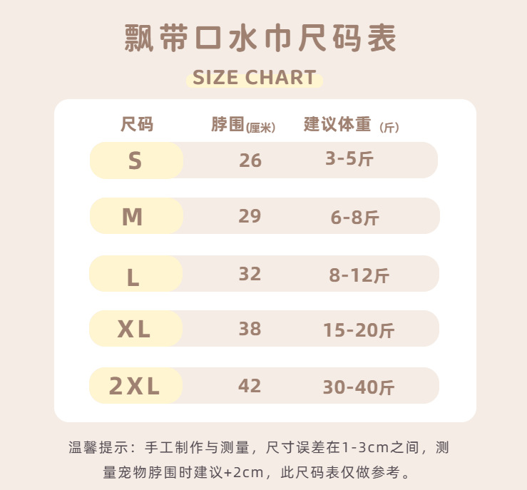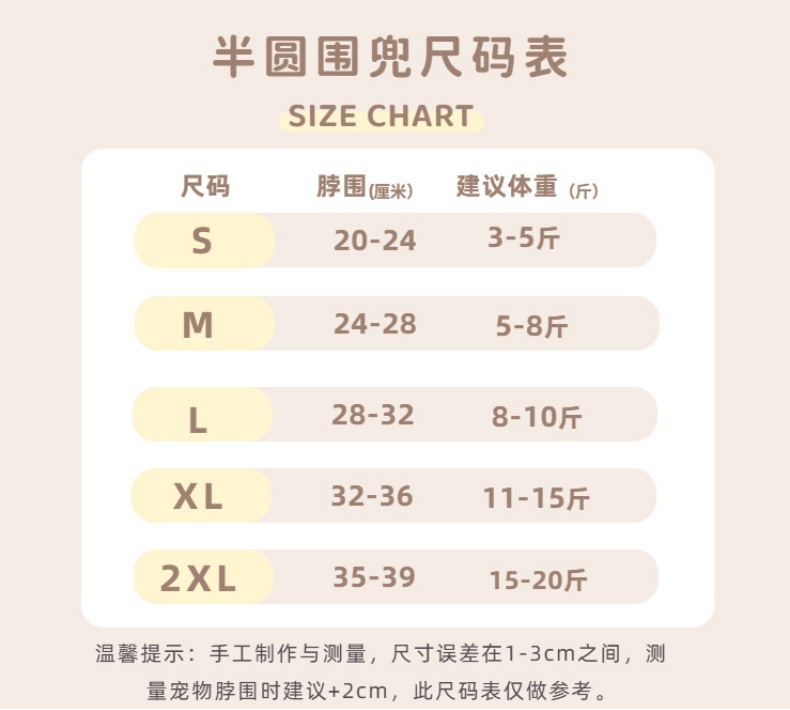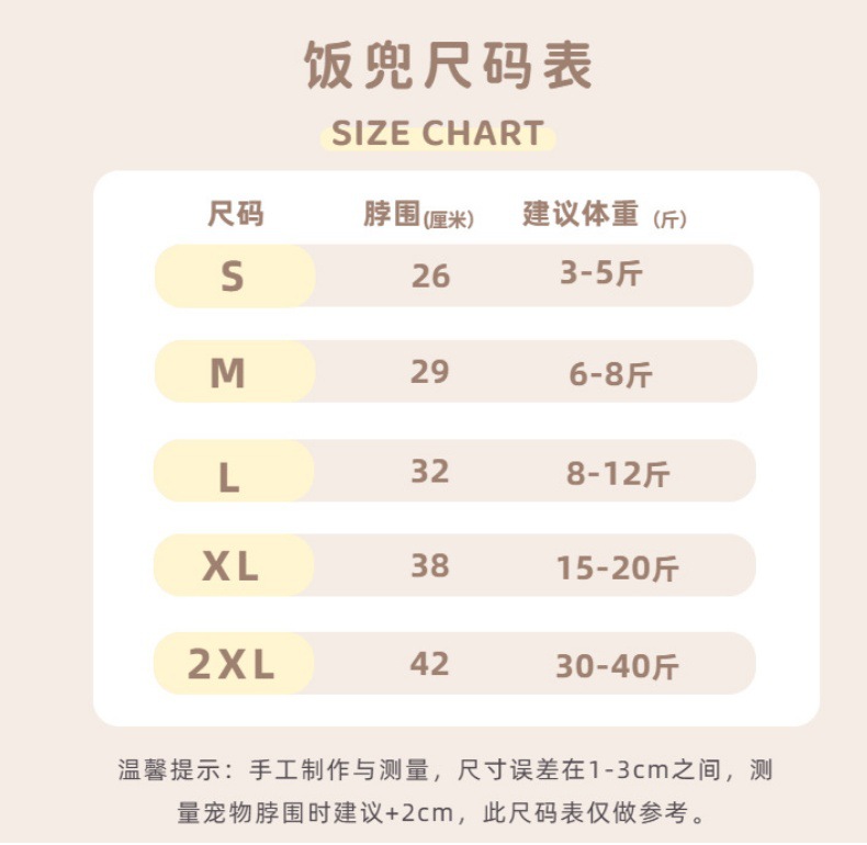 Нагрудник: S (подходит для окружности шеи 26 см); Нагрудник: M (подходит для окружности шеи 29 см).; Нагрудник: L (подходит для окружности шеи 32 см); Нагрудник: XL (подходит для окружности шеи 38 см).; Нагрудник: 2XL (подходит для окружности шеи 41 см).; Рисовый мешок: S (подходит для окружности шеи 20-24 см); Мешок для риса: M (подходит для окружности шеи 24-28 см); Карман для риса: L (подходит для окружности шеи 28-32 см); Рисовый мешок: XL (подходит для окружности шеи 32-36 см); Рисовый мешок: 2XL (подходит для окружности шеи 35-39 см); Полотенце со слюной-стримером: S (обхват шеи 26 см); Полотенце для слюны-стримера: M (обхват шеи 29 см); Полотенце со слюной-стримером: L (обхват шеи 32 см); Полотенце со слюной: XL (подходит для окружности шеи 38 см).; Полотенце со слюной: 2XL (подходит для окружности шеи 42 см); S: окружность шеи 26 см, M: окружность шеи 29 см, L: окружность шеи 32 см, XL: окружность шеи 38 см, 2XL: окружность шеи 41 см.