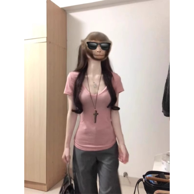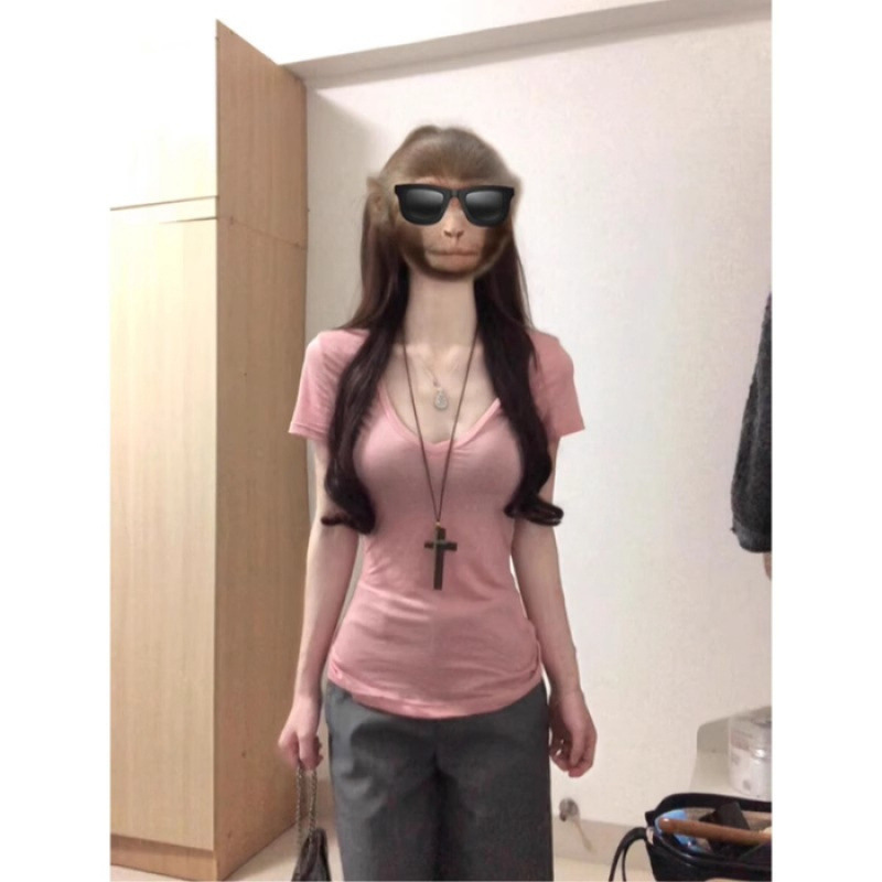 [Rayon Modal 1*1, разрез на ваш вкус] Летняя женская футболка в корейском стиле розового цвета с v-образным вырезом и правым плечом с короткими рукавами