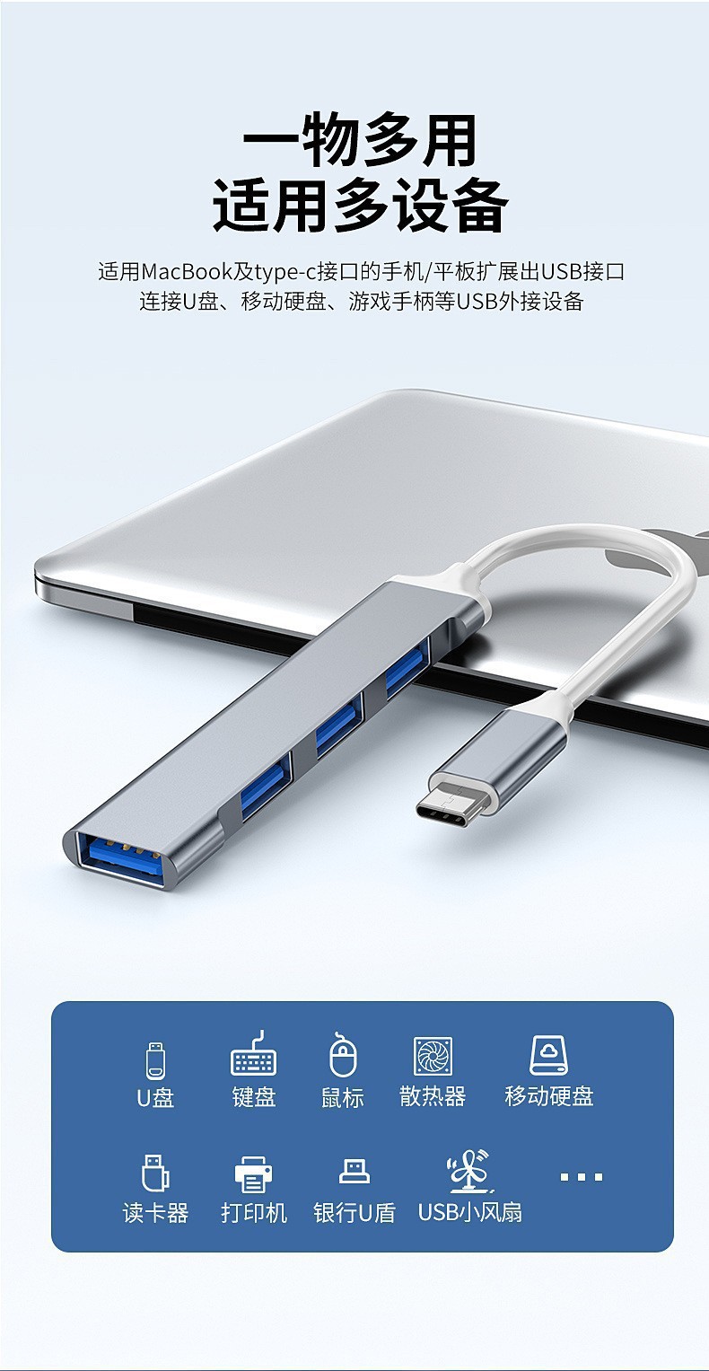 Разветвитель USB3.0 подходит для многопортового концентратора 2.0 типа C с одной на четыре порта, внешней мыши, клавиатуры, многопортового диска U.
