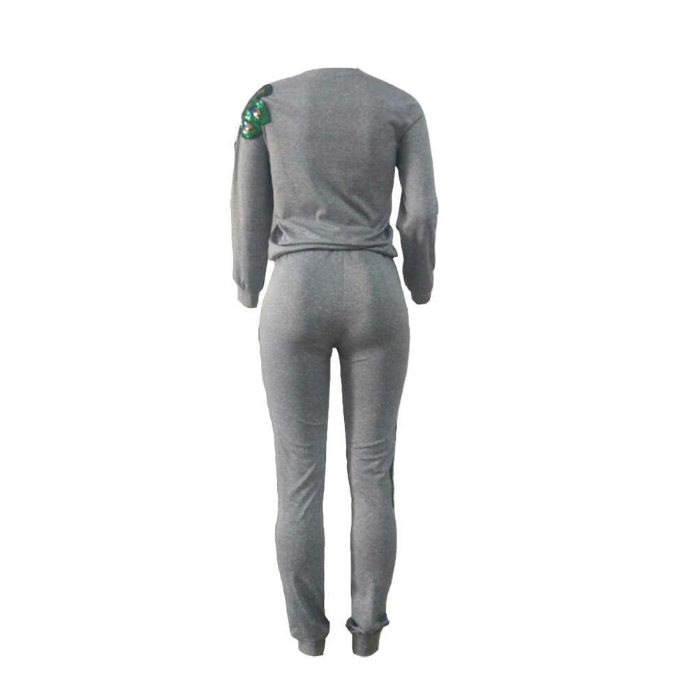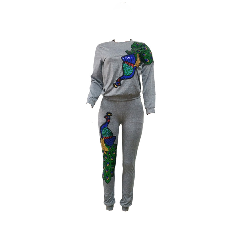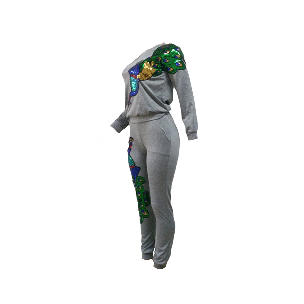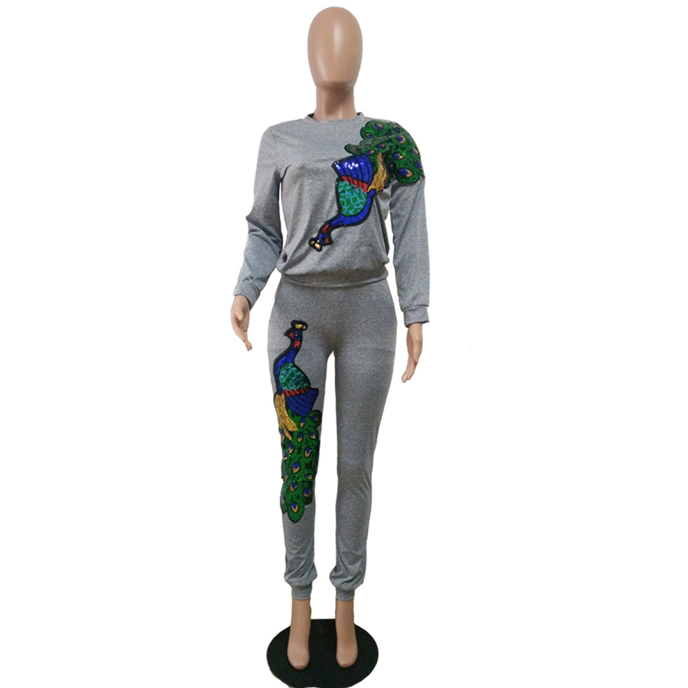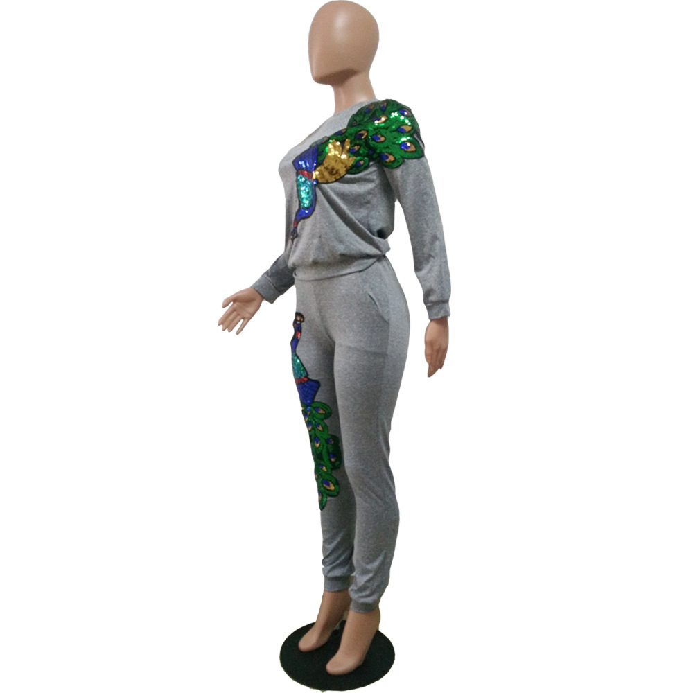 B9056 Женский осенне-зимний модный комплект из двух предметов с пайетками и павлином (брюки с карманами)