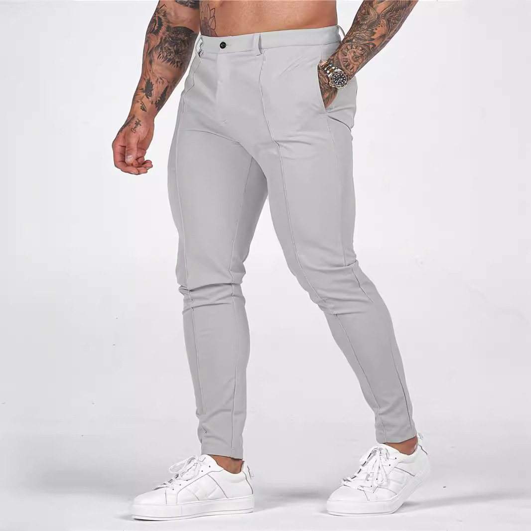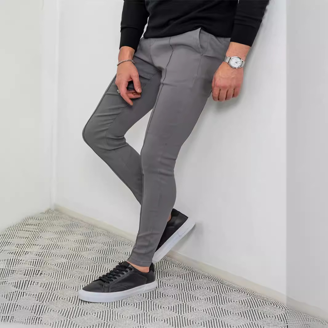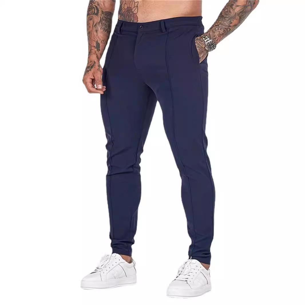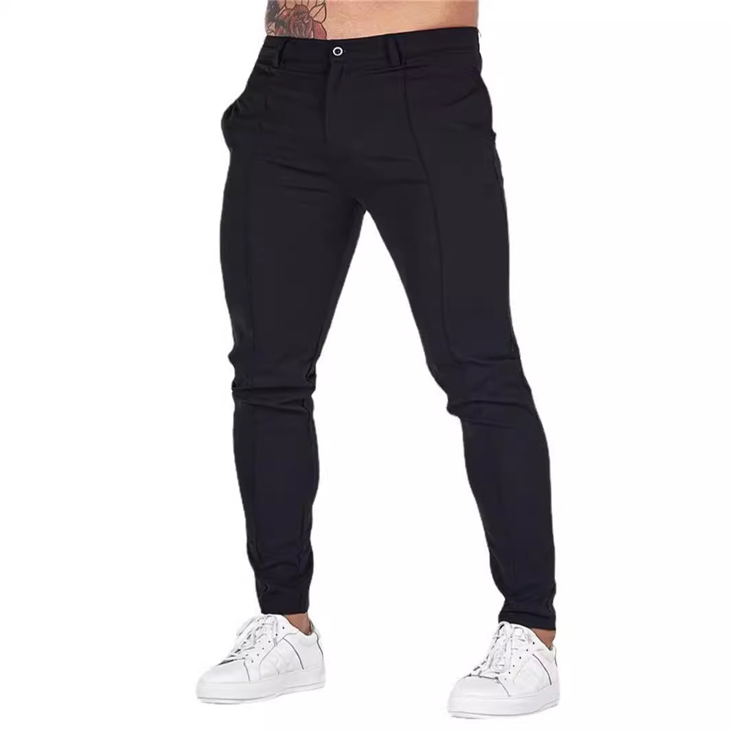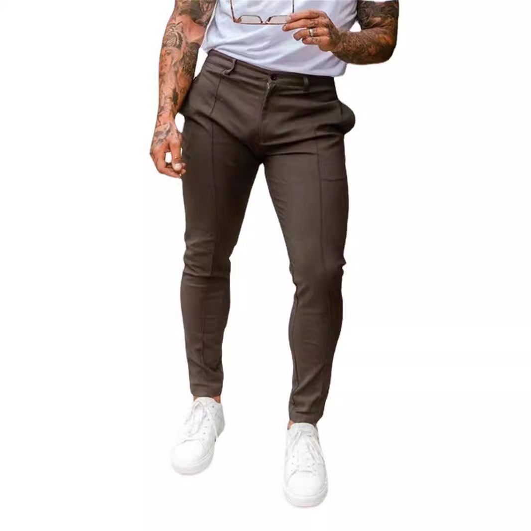 Европейские и американские трансграничные популярные мужские однотонные облегающие брюки с карманами на молнии, деловые повседневные узкие брюки с небольшими манжетами.