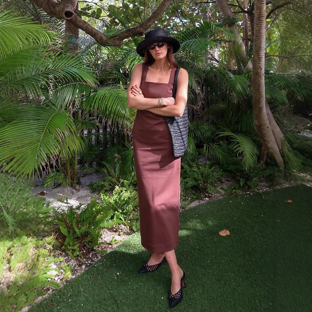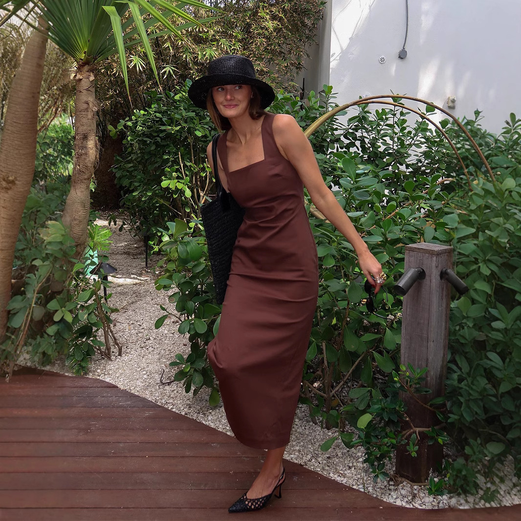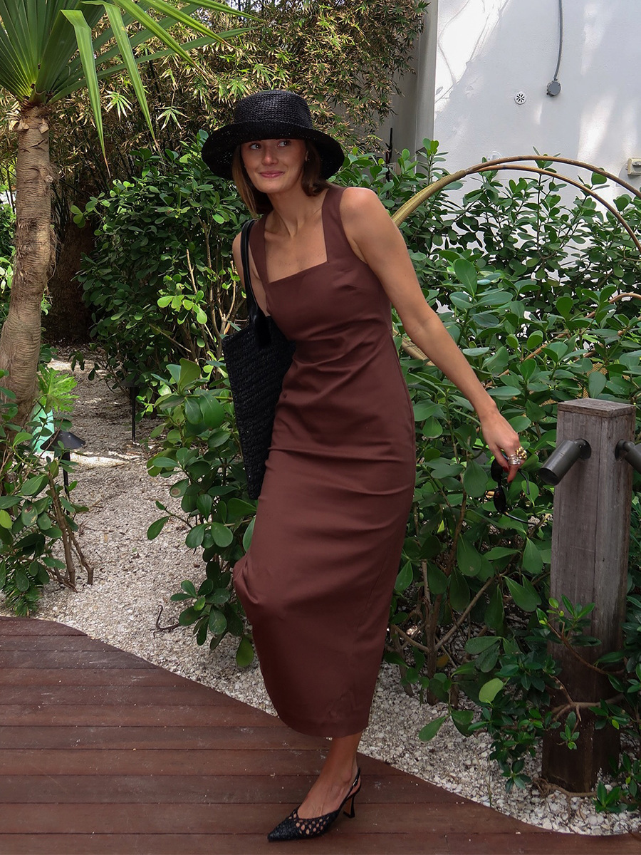 Летнее платье-миди из хлопка и льна, квадратный вырез, на бретелях, однотонное, приталенное, в европейском и американском стиле, коллекция 2025 года.