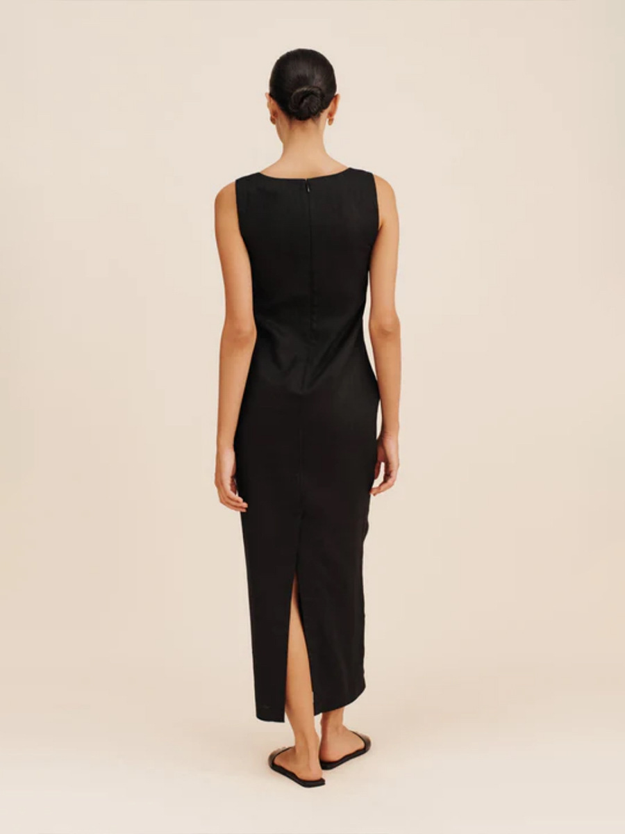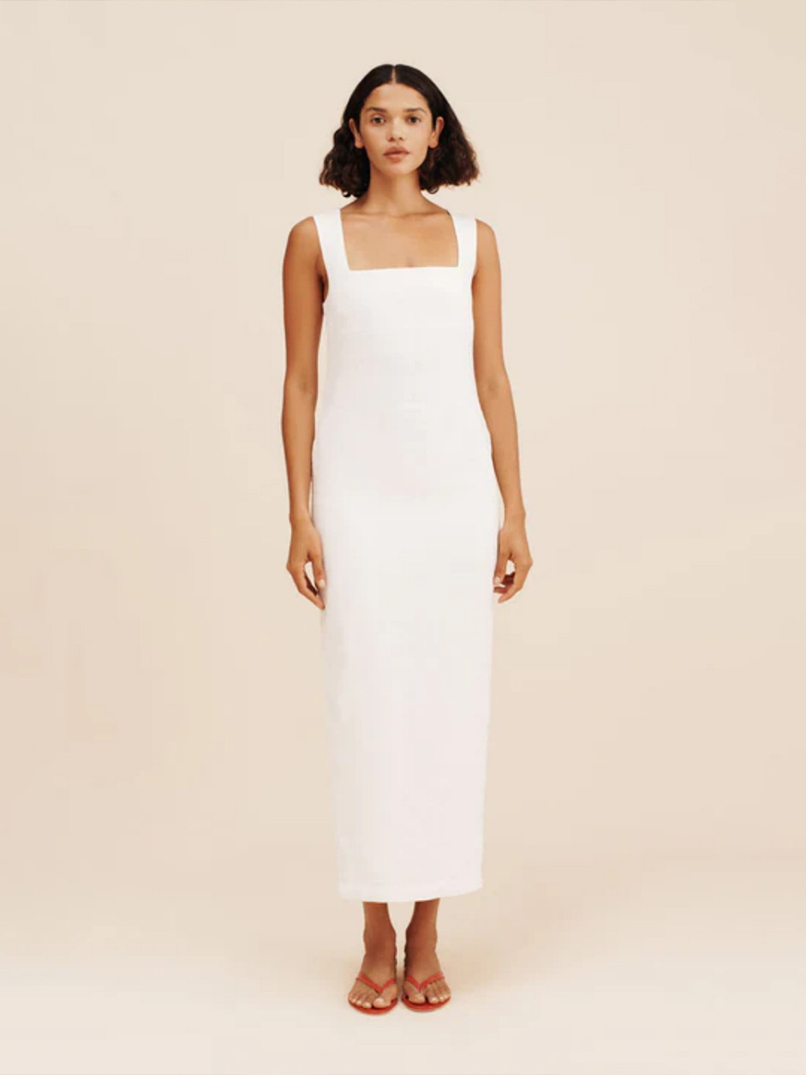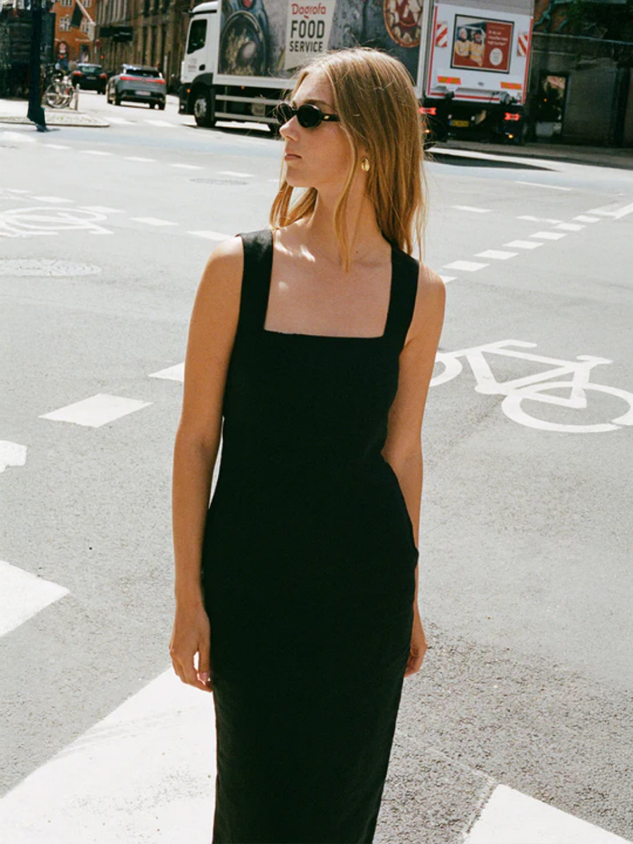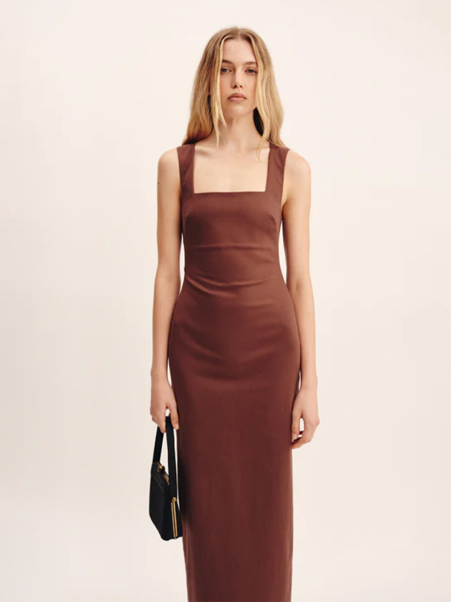 Летнее платье-миди из хлопка и льна, квадратный вырез, на бретелях, однотонное, приталенное, в европейском и американском стиле, коллекция 2025 года.