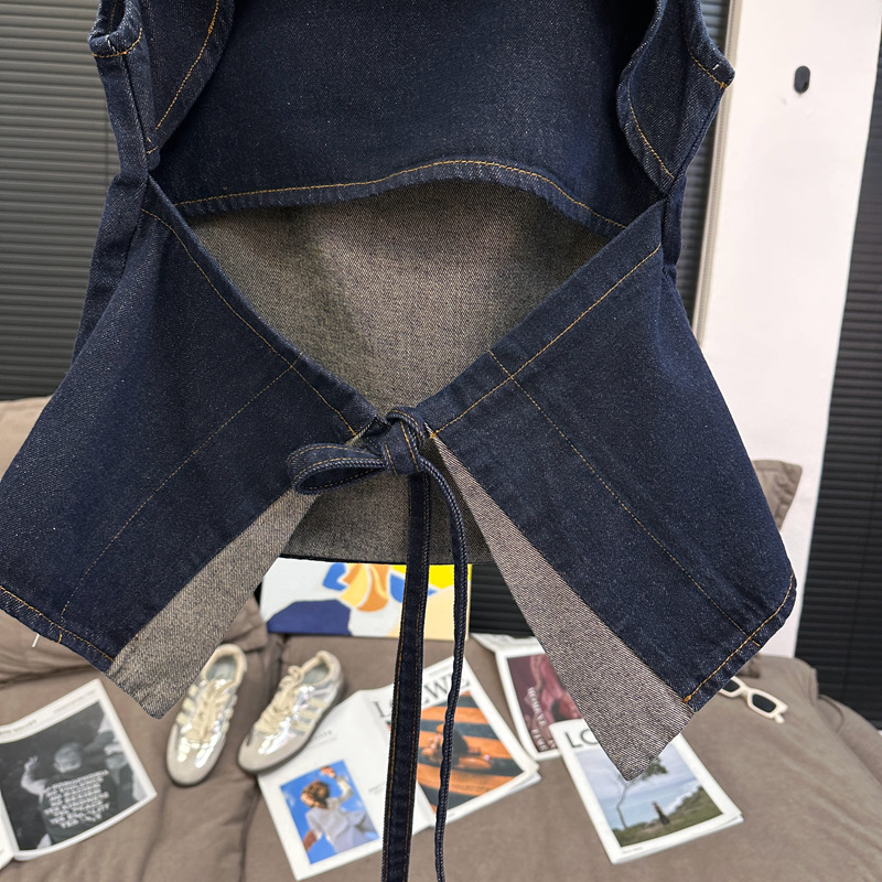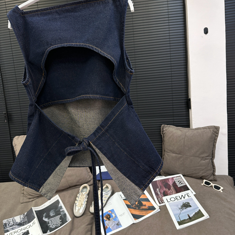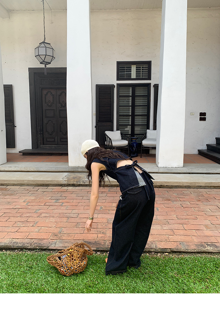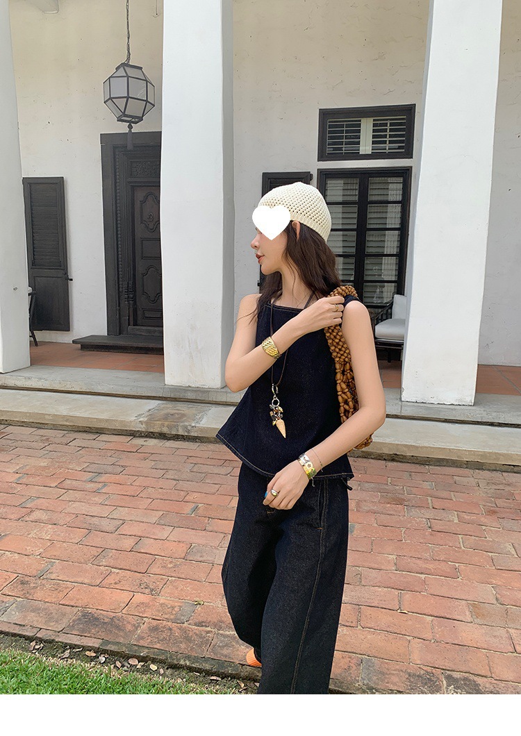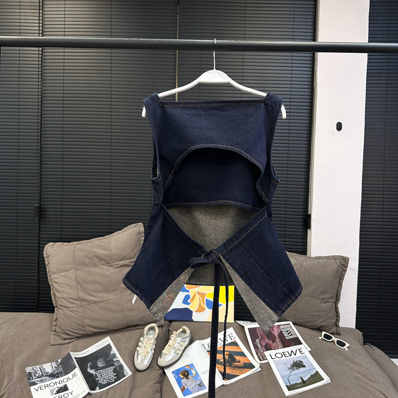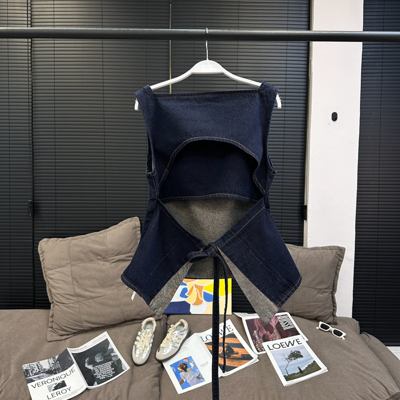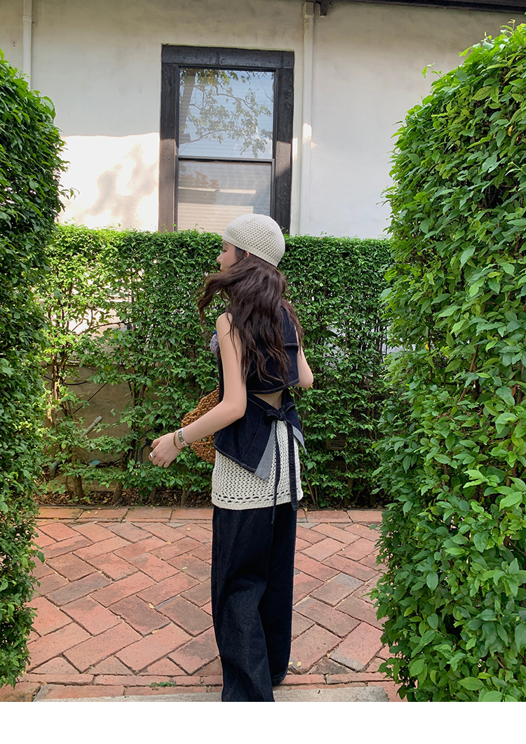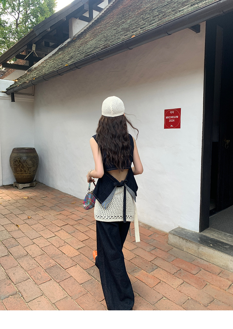 Красивый и простой уличный стиль, жилет с вырезом на спине и строчкой, джинсовый костюм оригинального цвета.