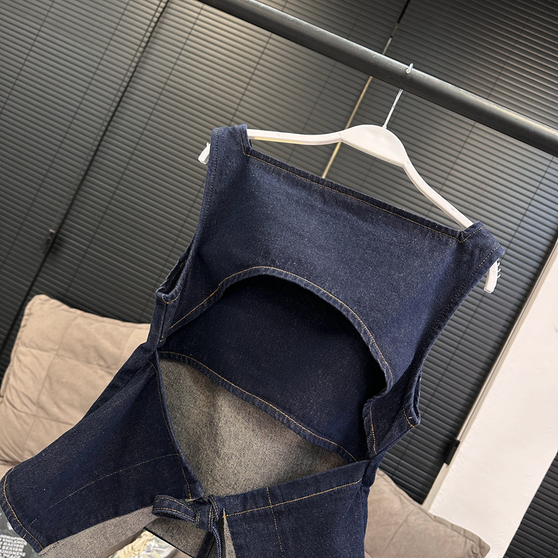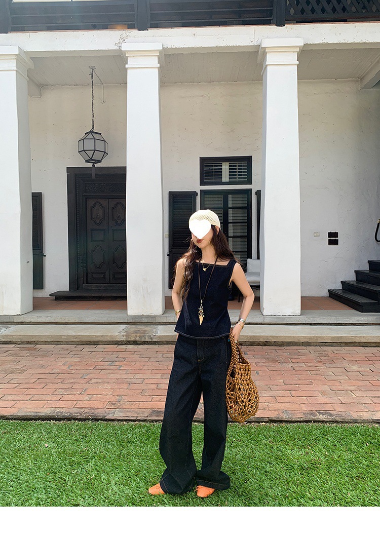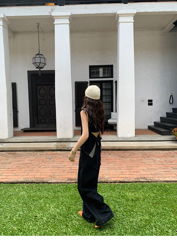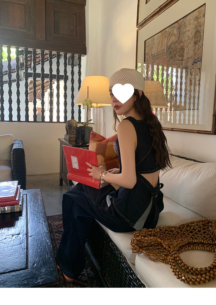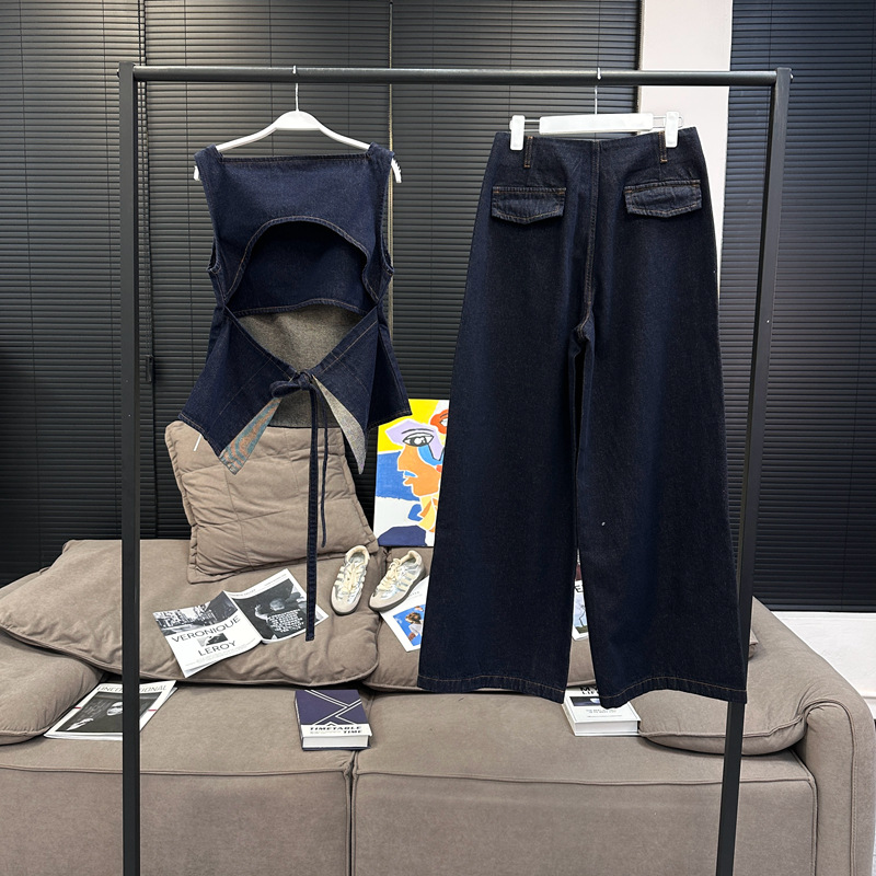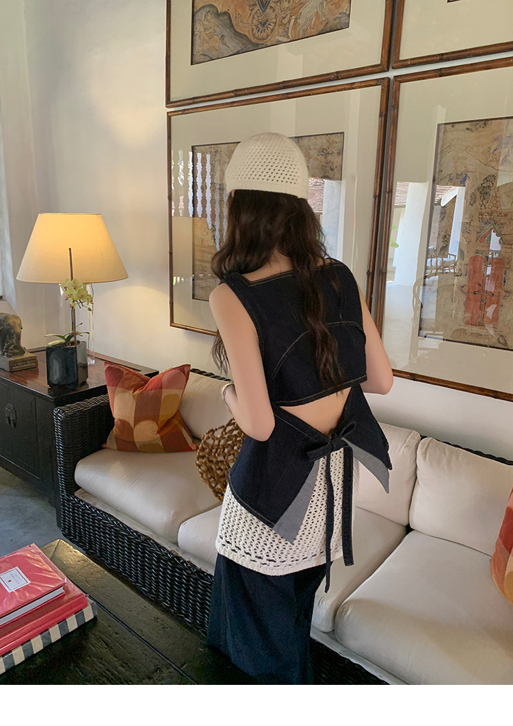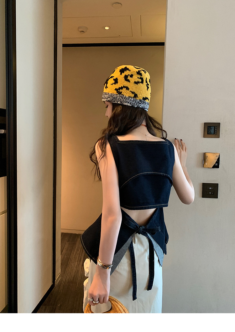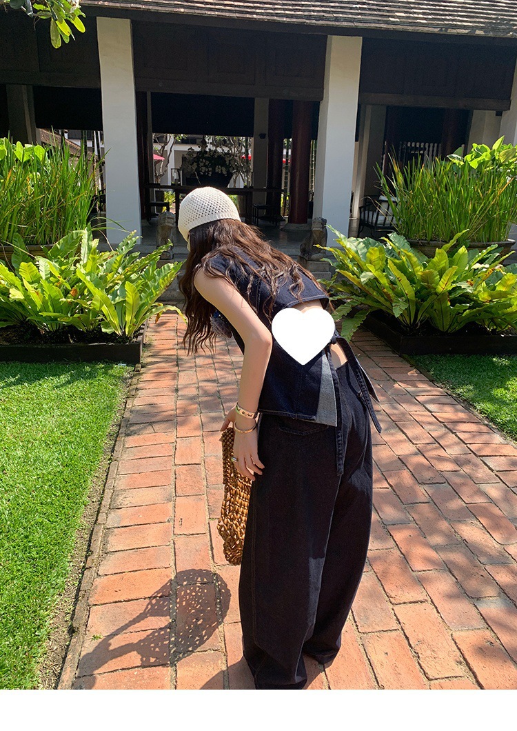 Красивый и простой уличный стиль, жилет с вырезом на спине и строчкой, джинсовый костюм оригинального цвета.