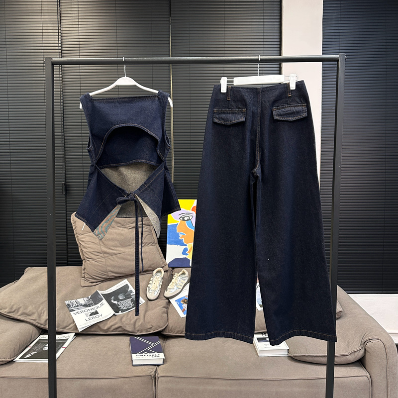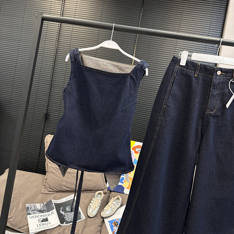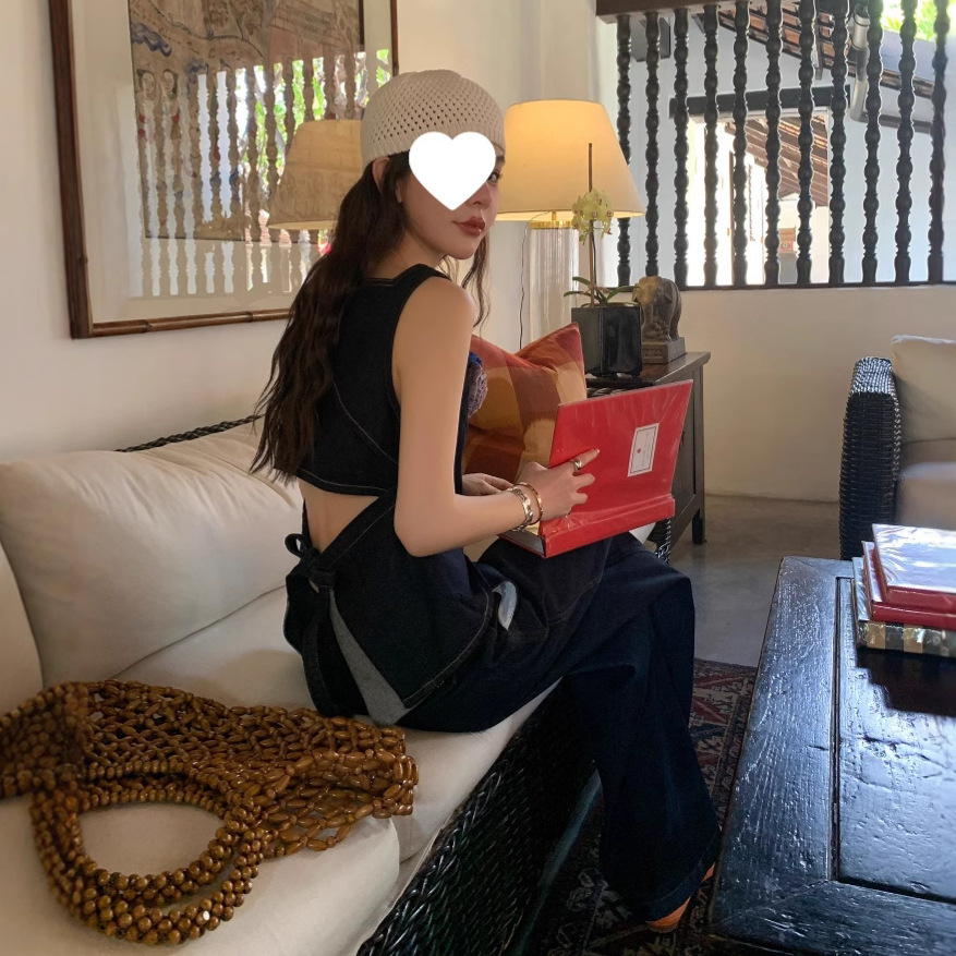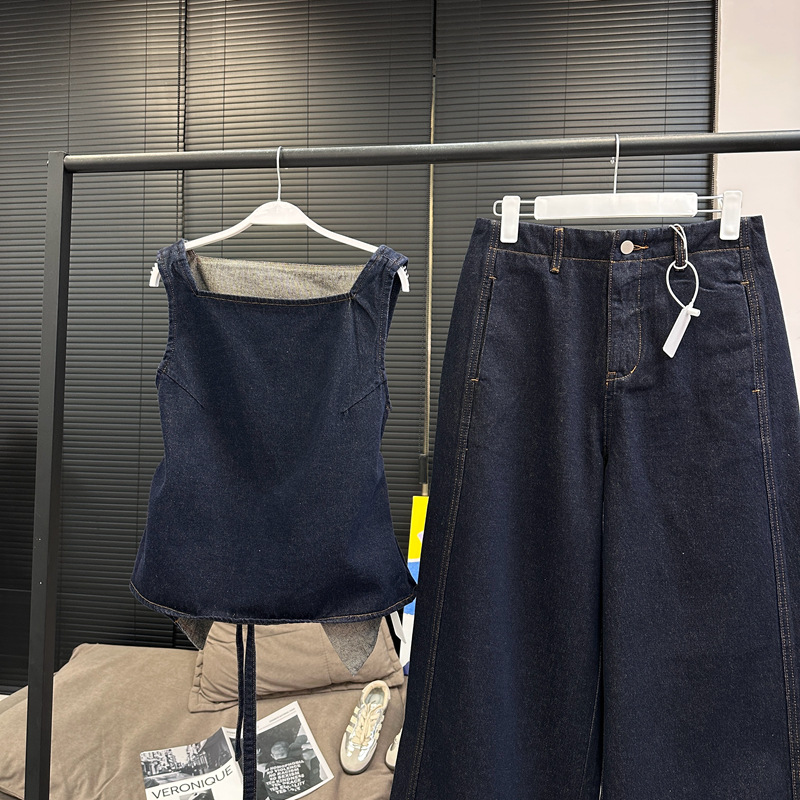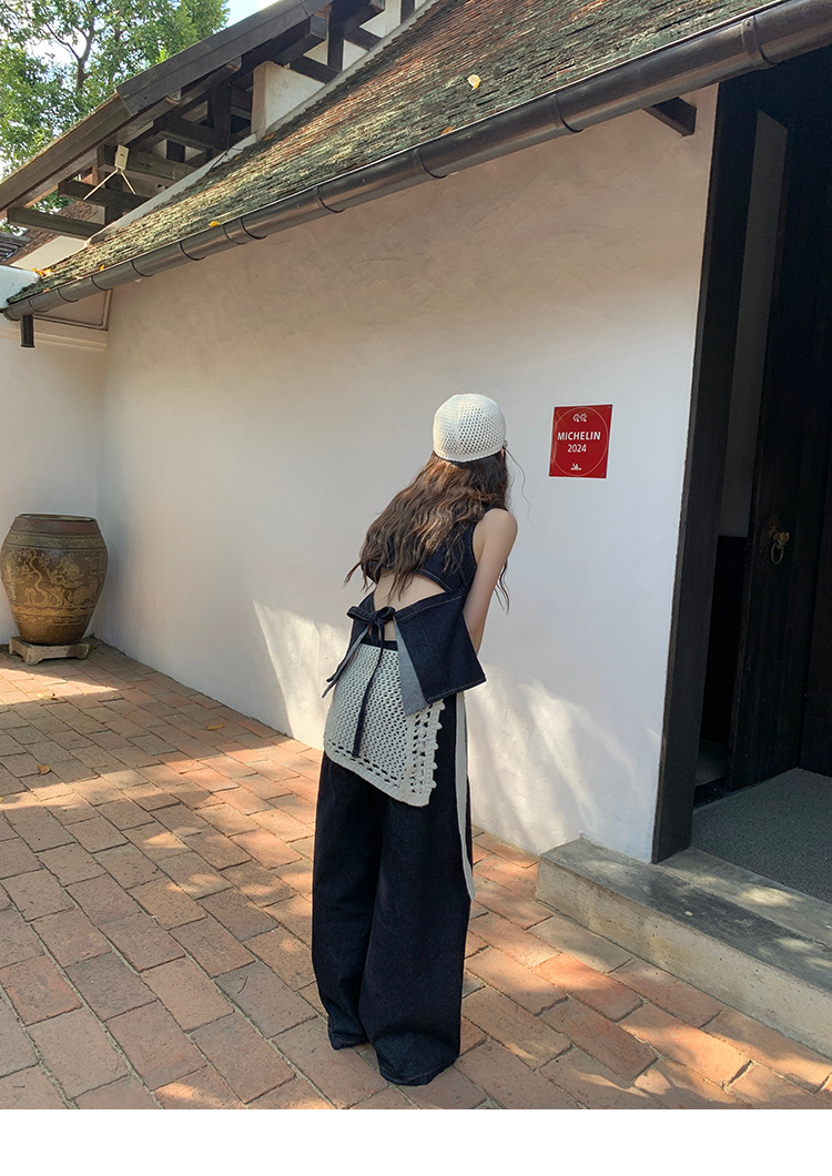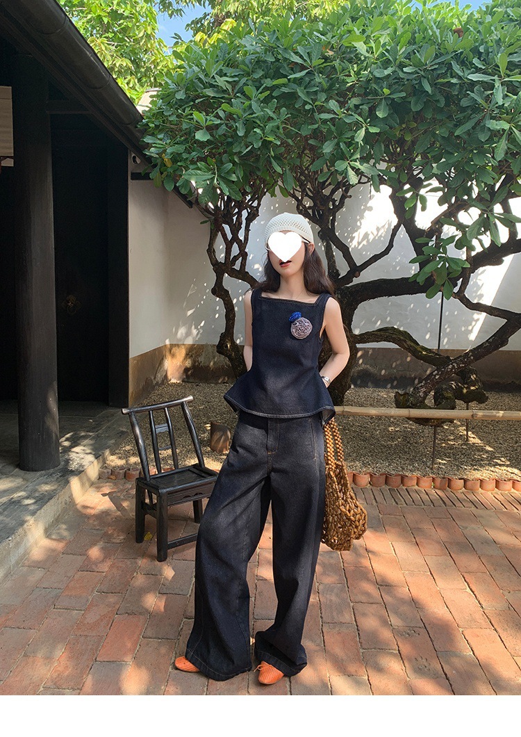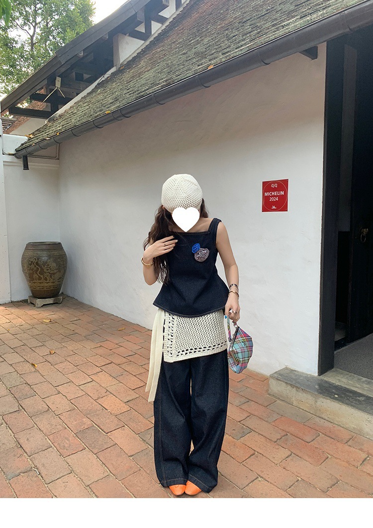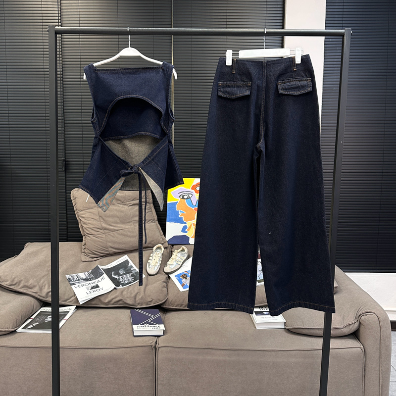 Красивый и простой уличный стиль, жилет с вырезом на спине и строчкой, джинсовый костюм оригинального цвета.