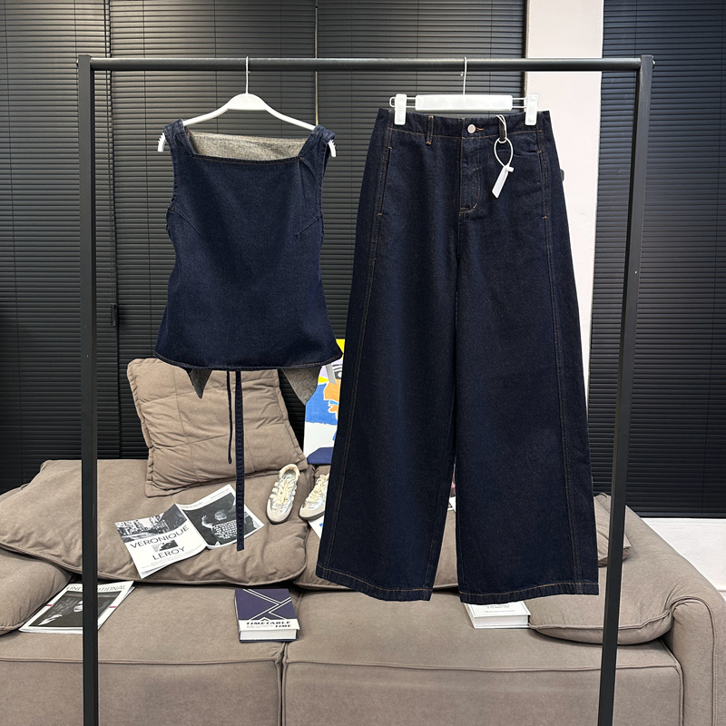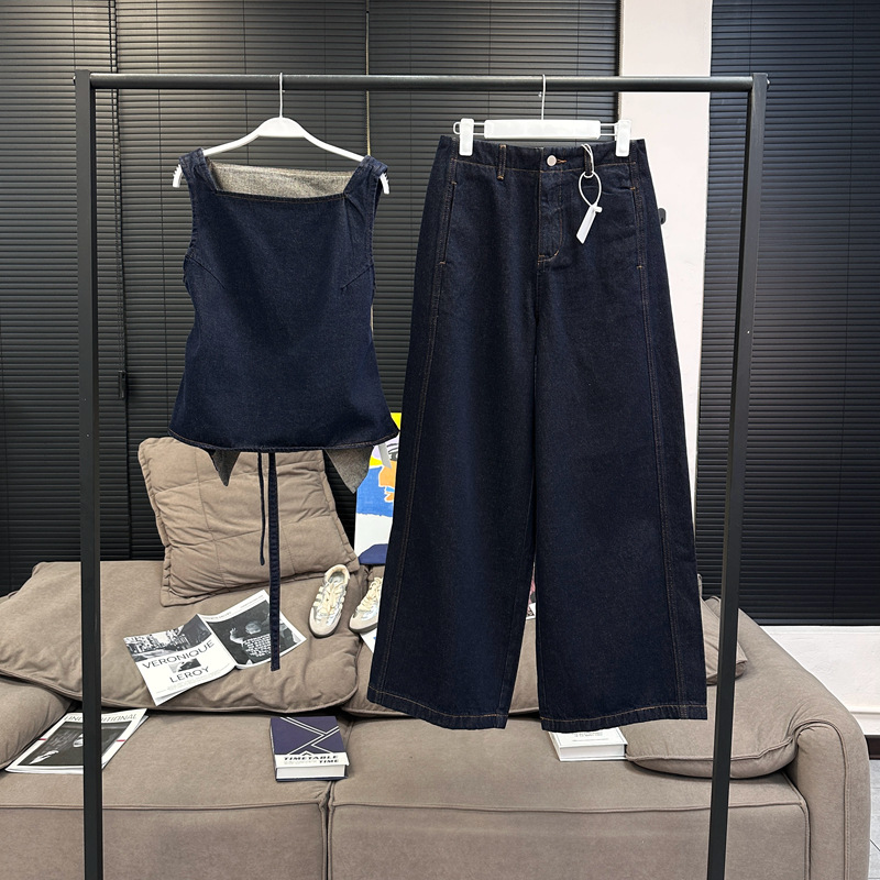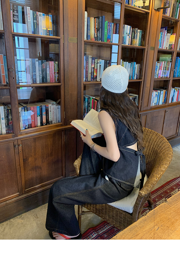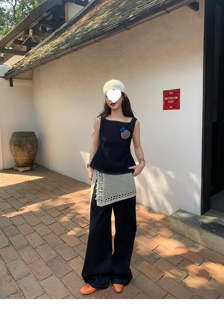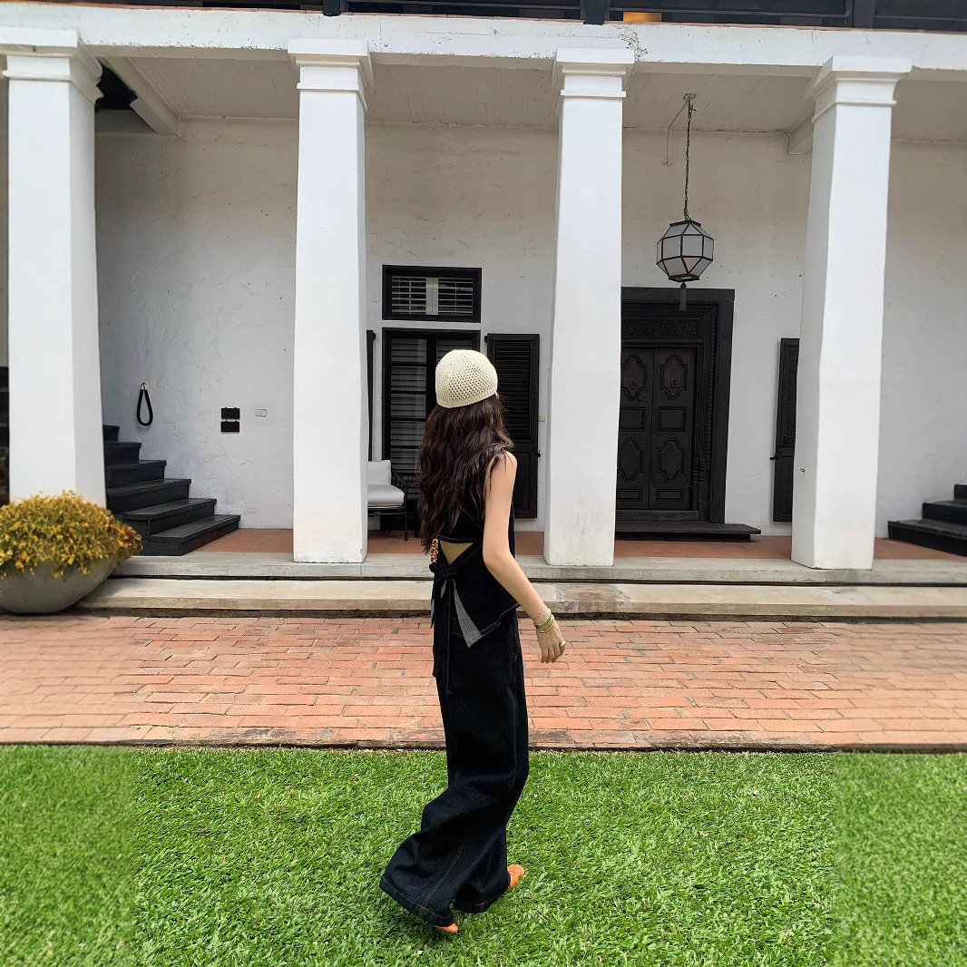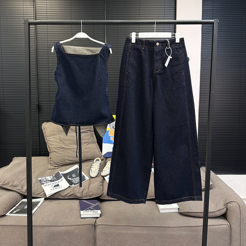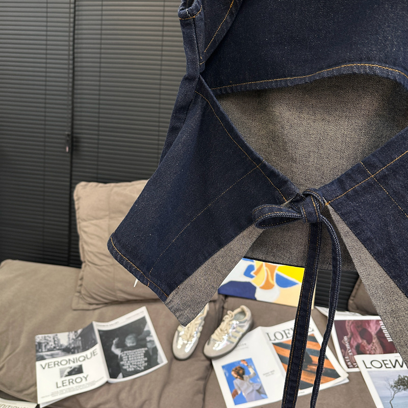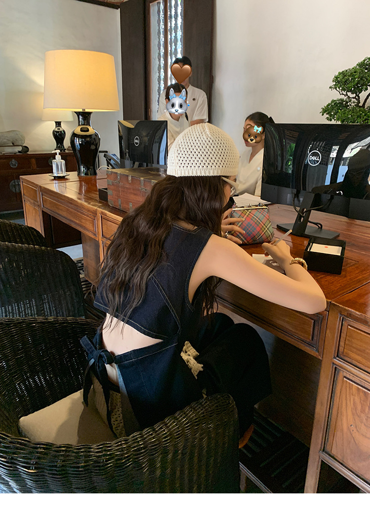 Красивый и простой уличный стиль, жилет с вырезом на спине и строчкой, джинсовый костюм оригинального цвета.
