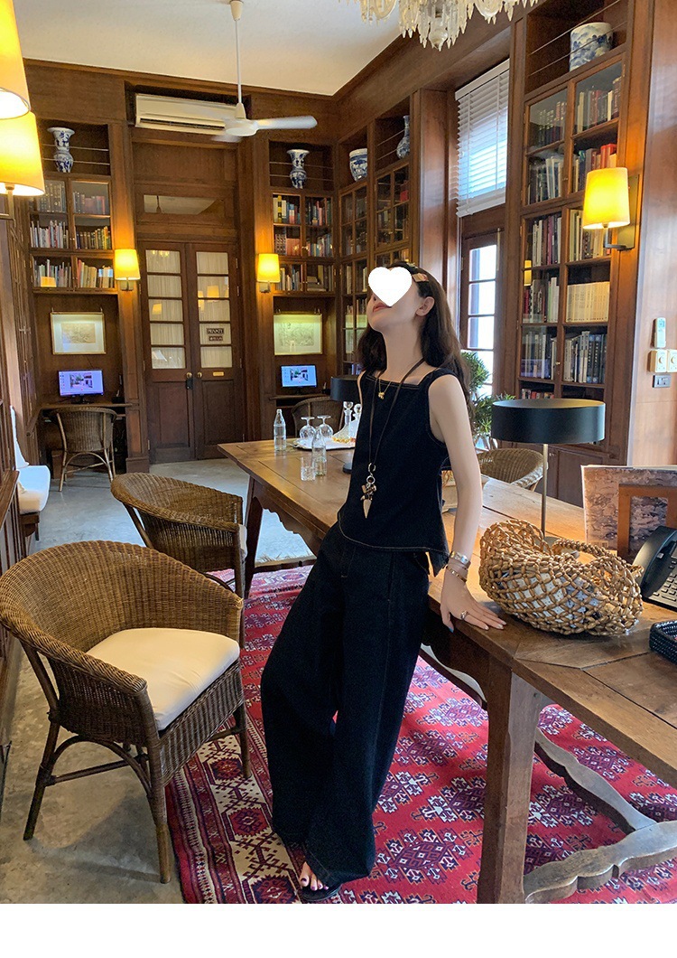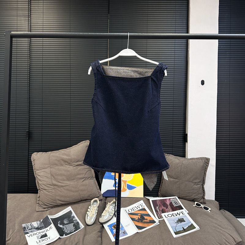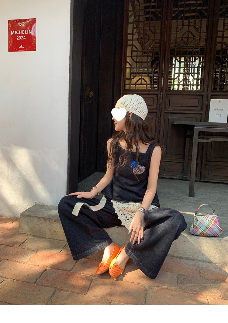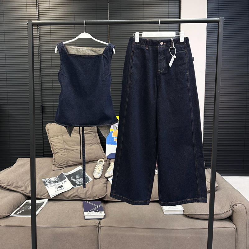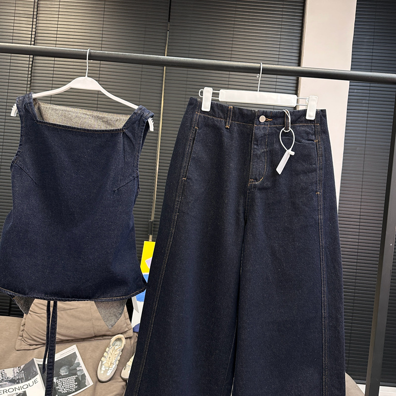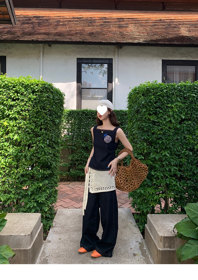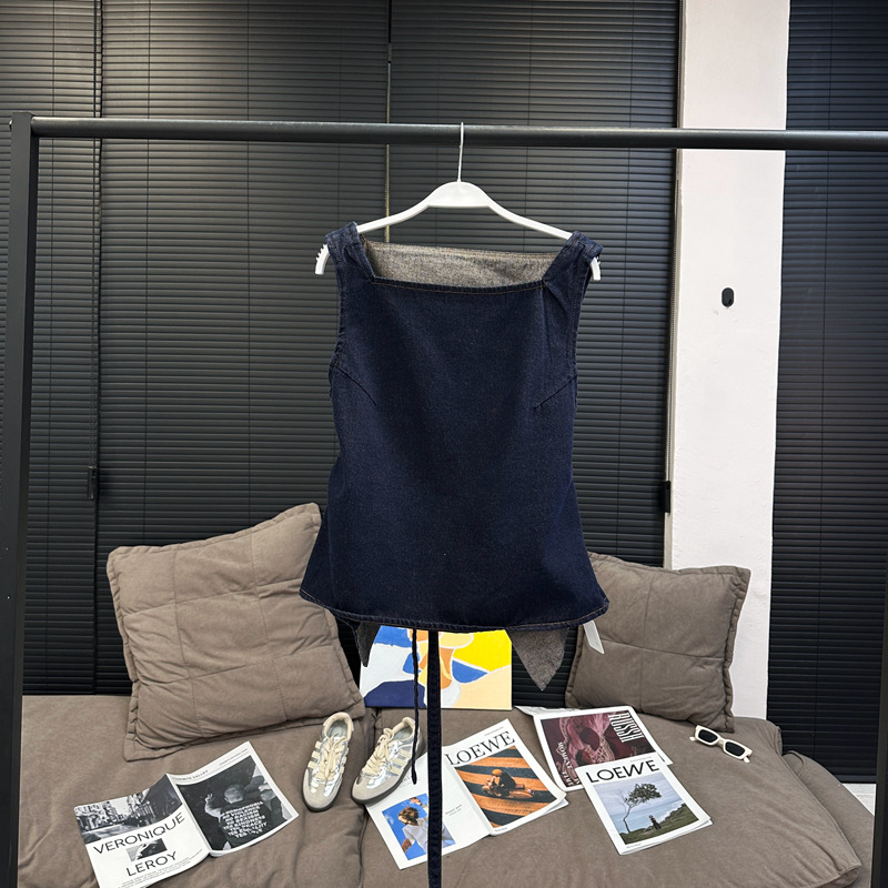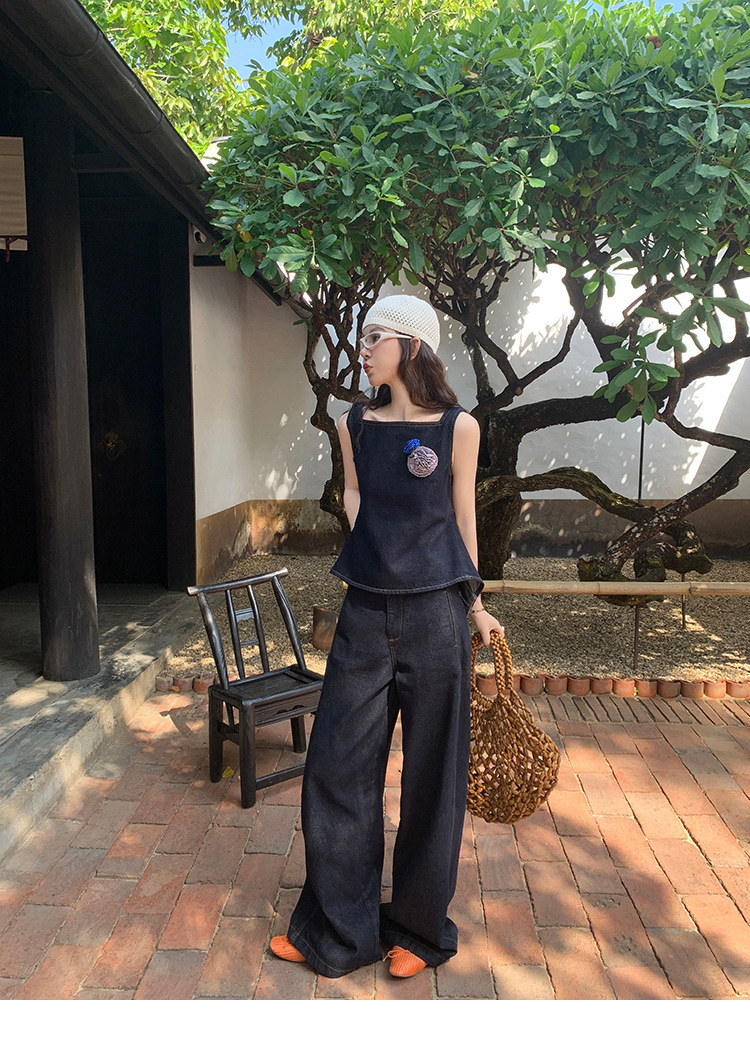 Красивый и простой уличный стиль, жилет с вырезом на спине и строчкой, джинсовый костюм оригинального цвета.