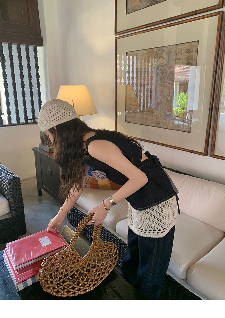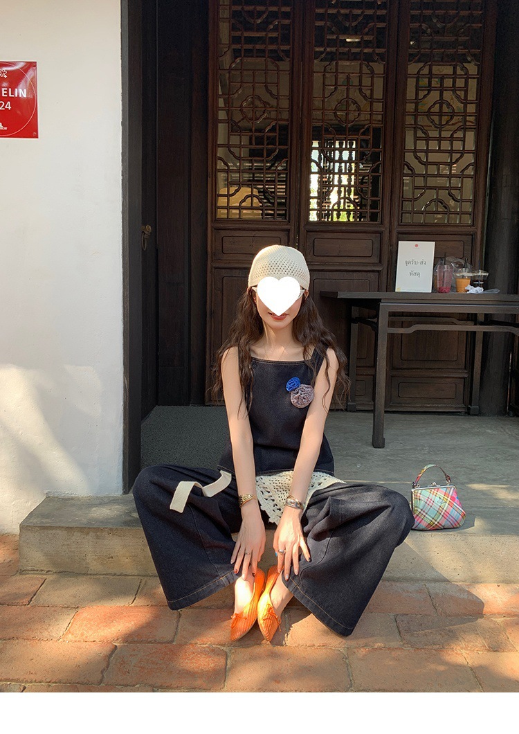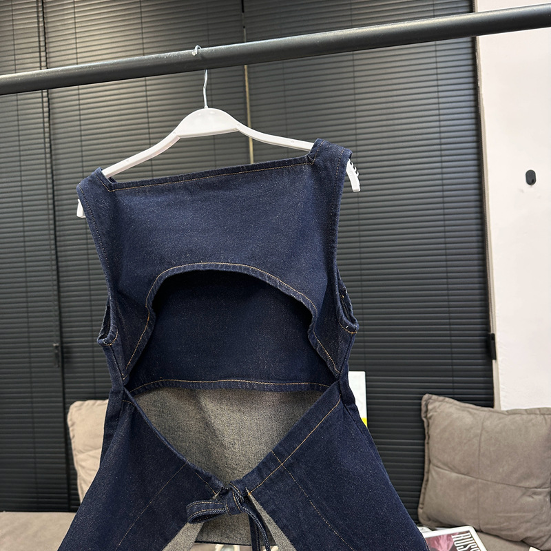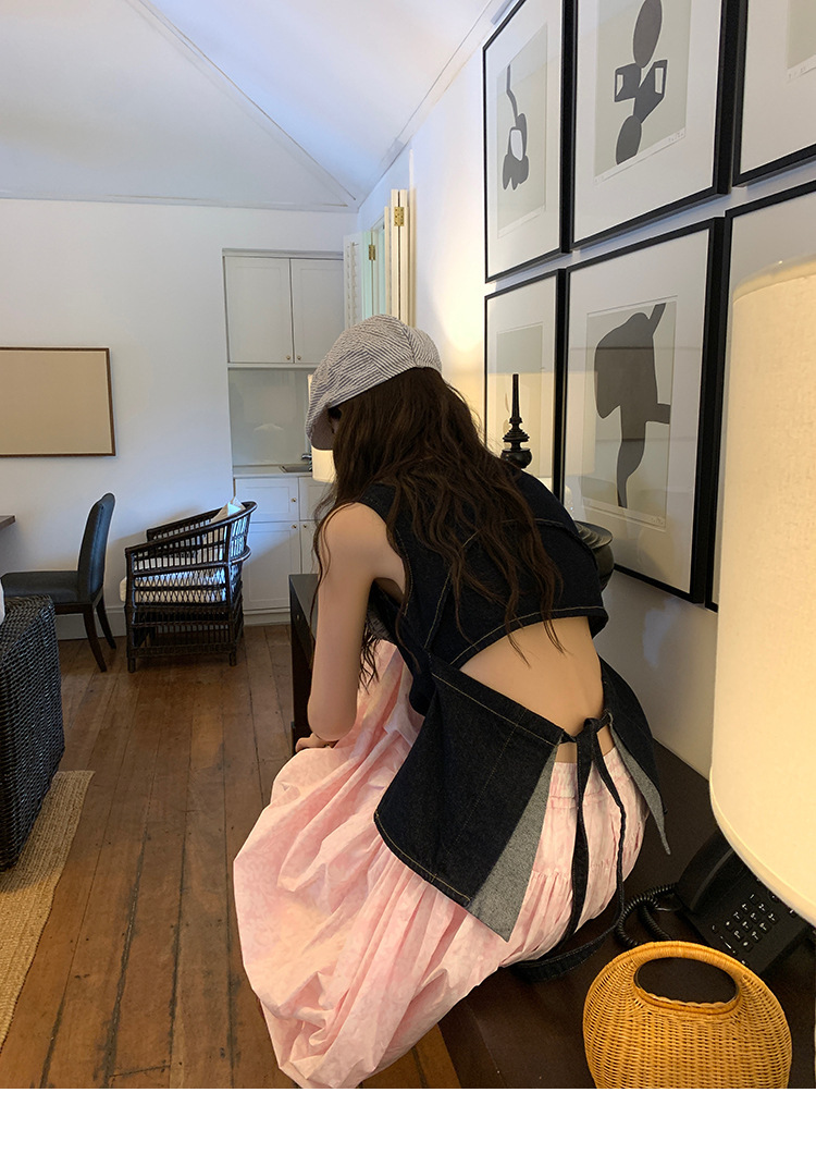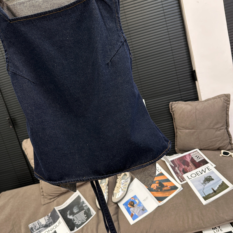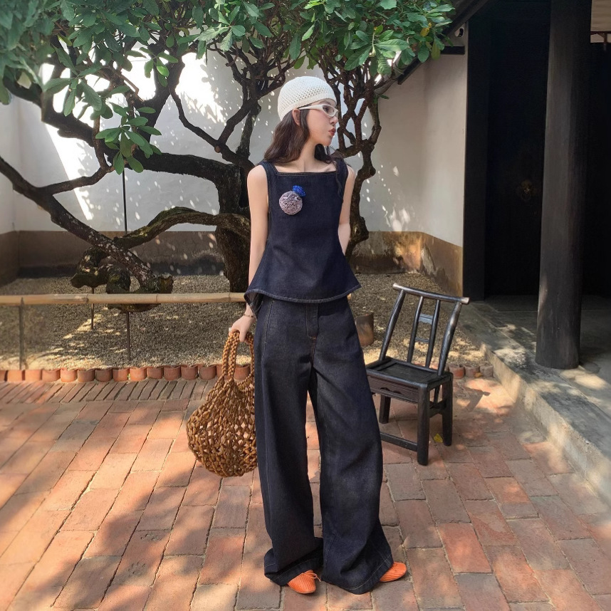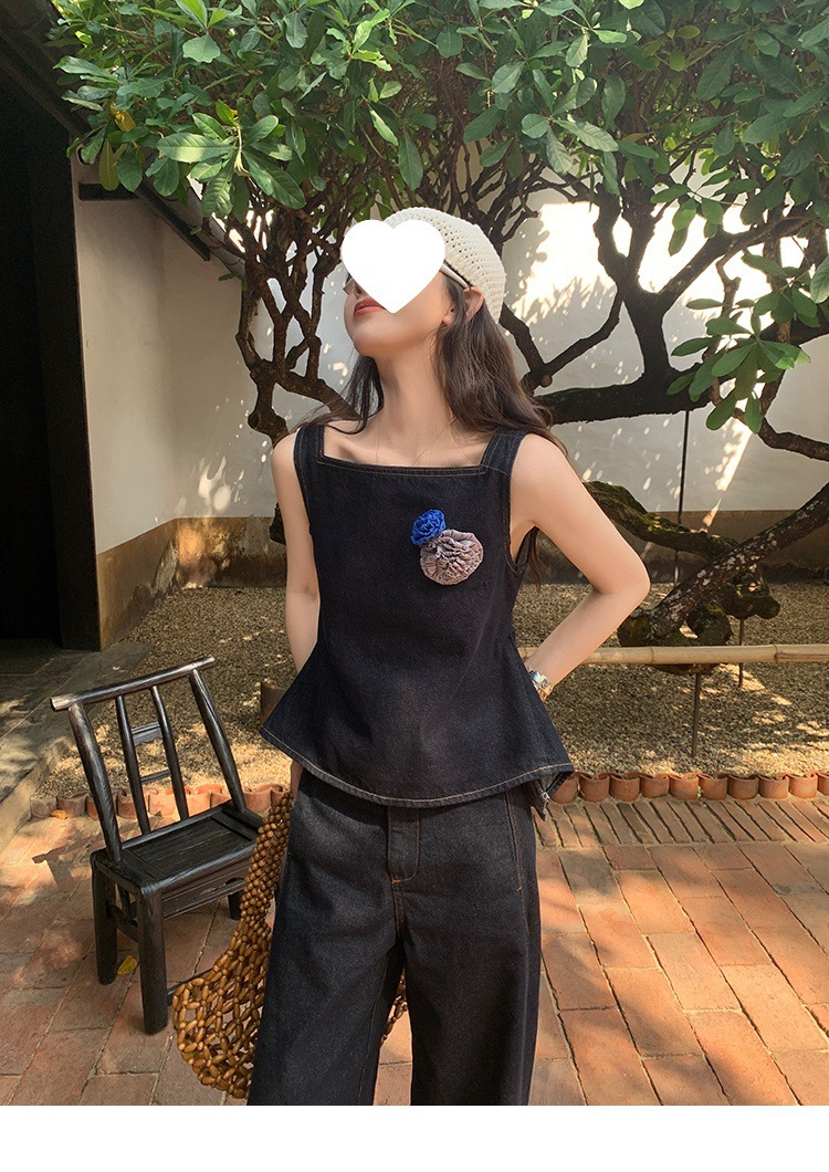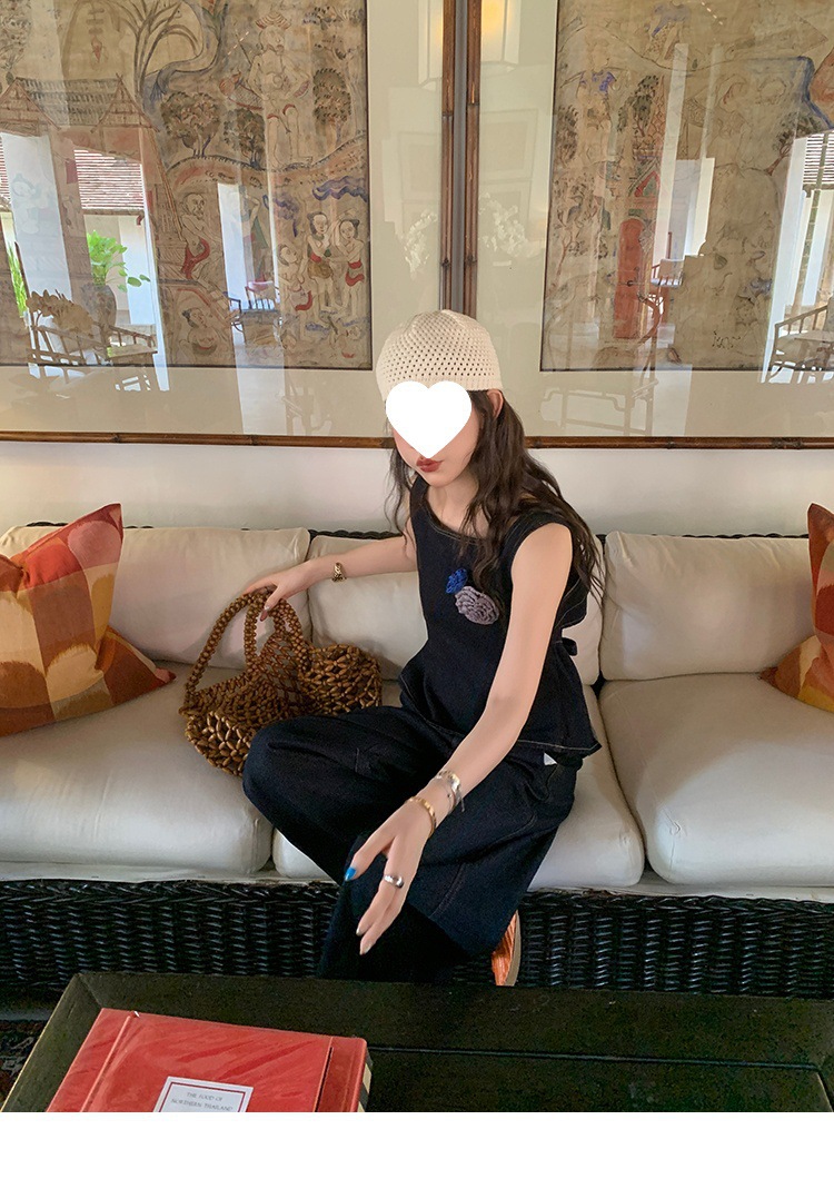 Красивый и простой уличный стиль, жилет с вырезом на спине и строчкой, джинсовый костюм оригинального цвета.