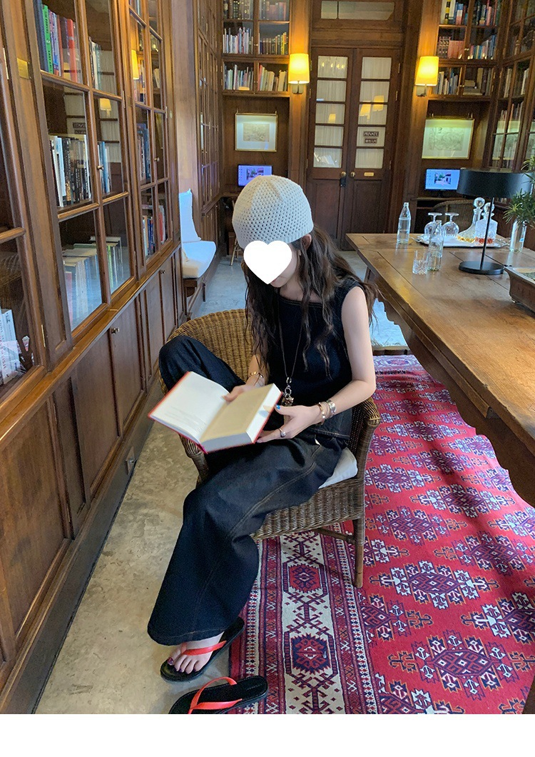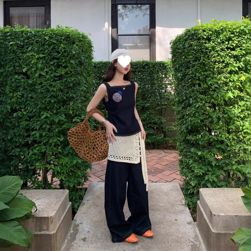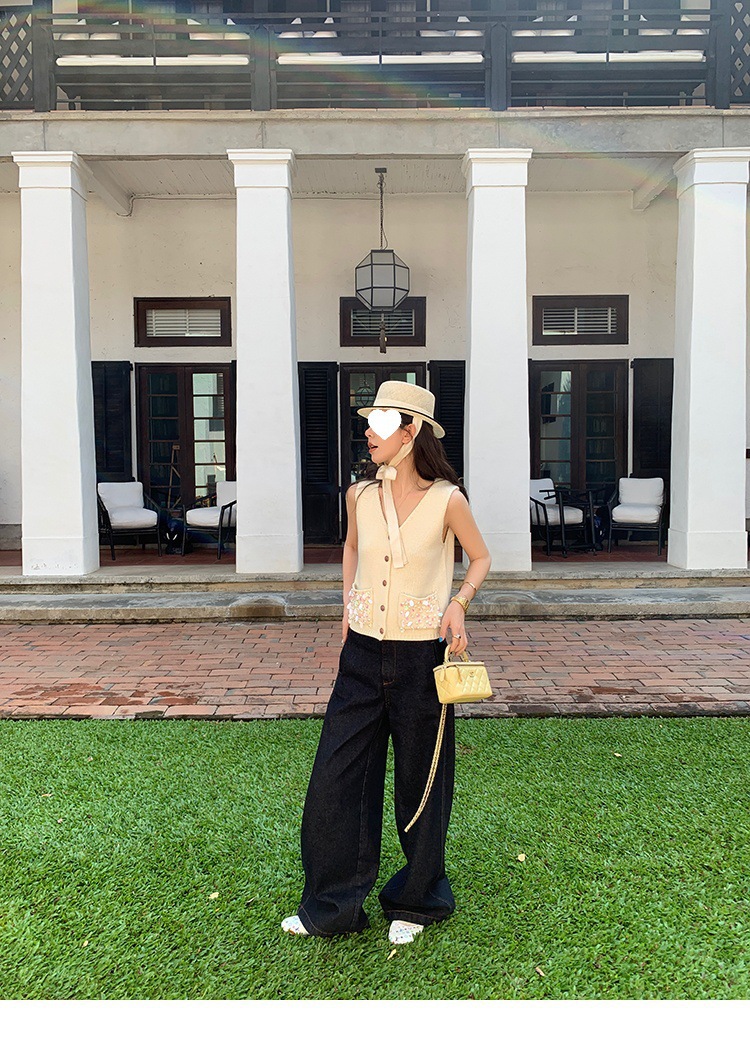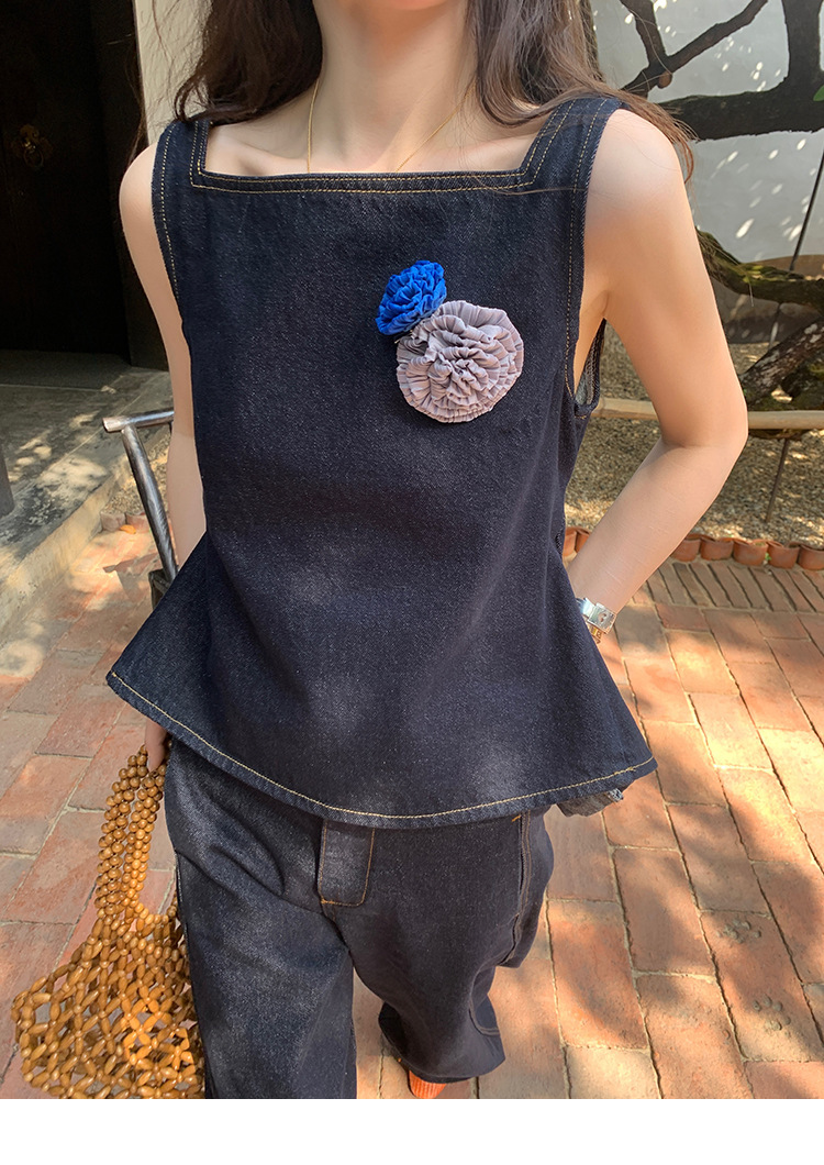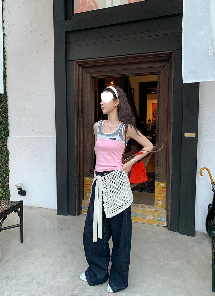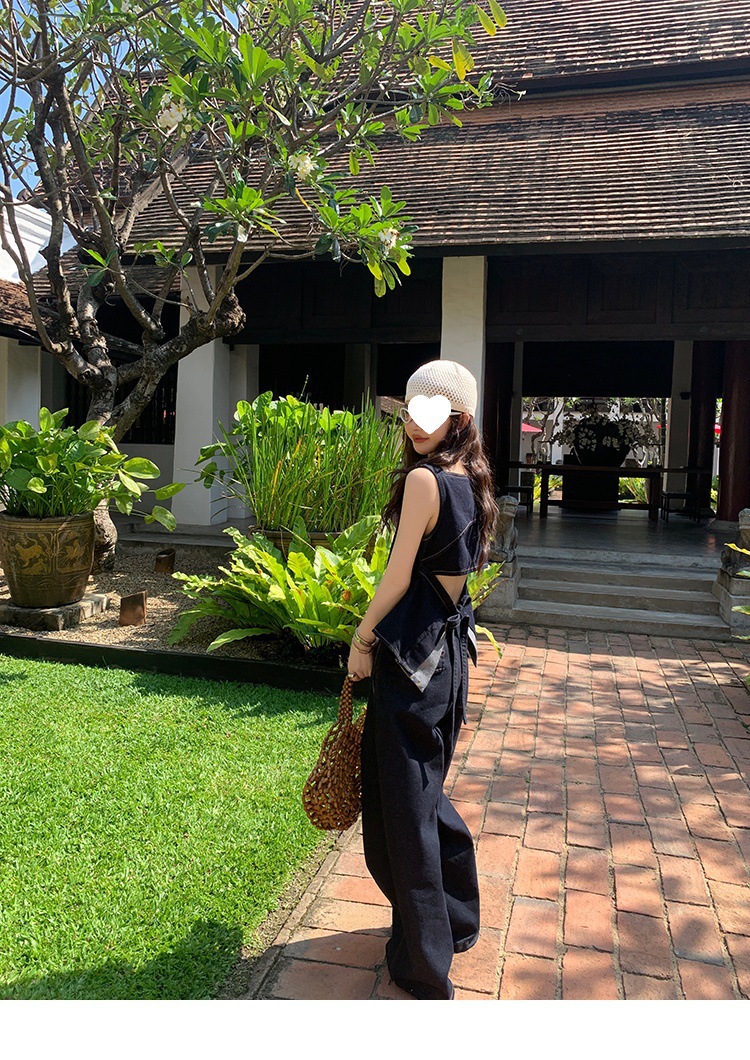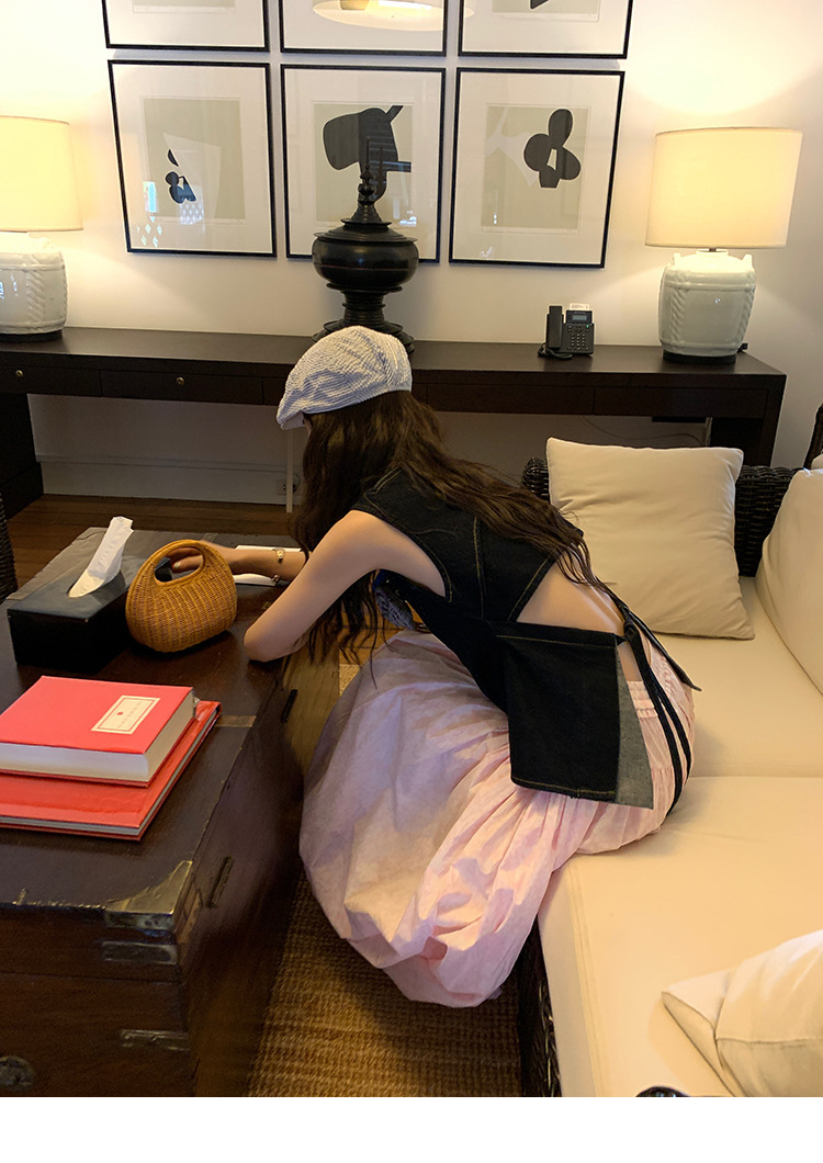 Красивый и простой уличный стиль, жилет с вырезом на спине и строчкой, джинсовый костюм оригинального цвета.