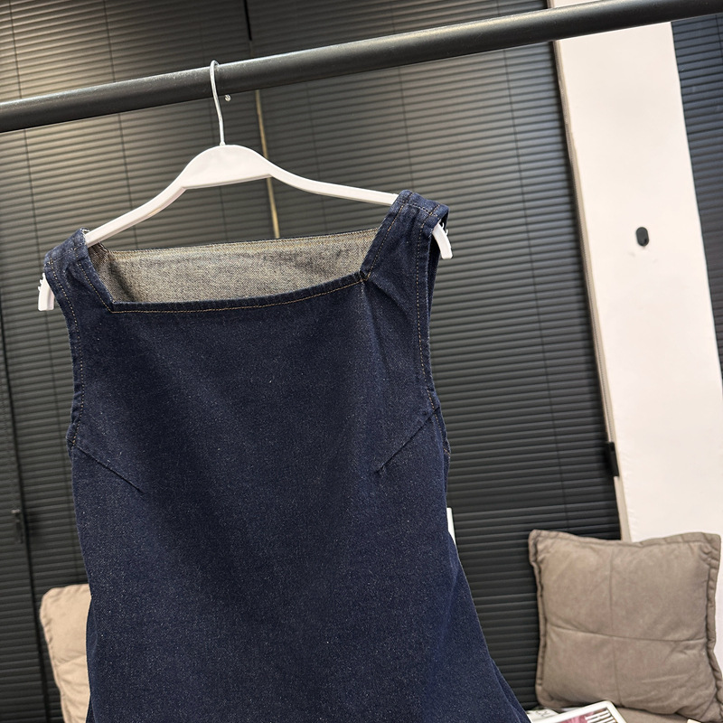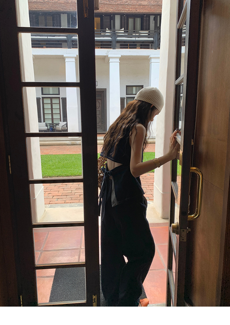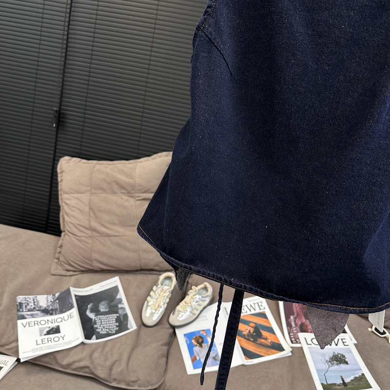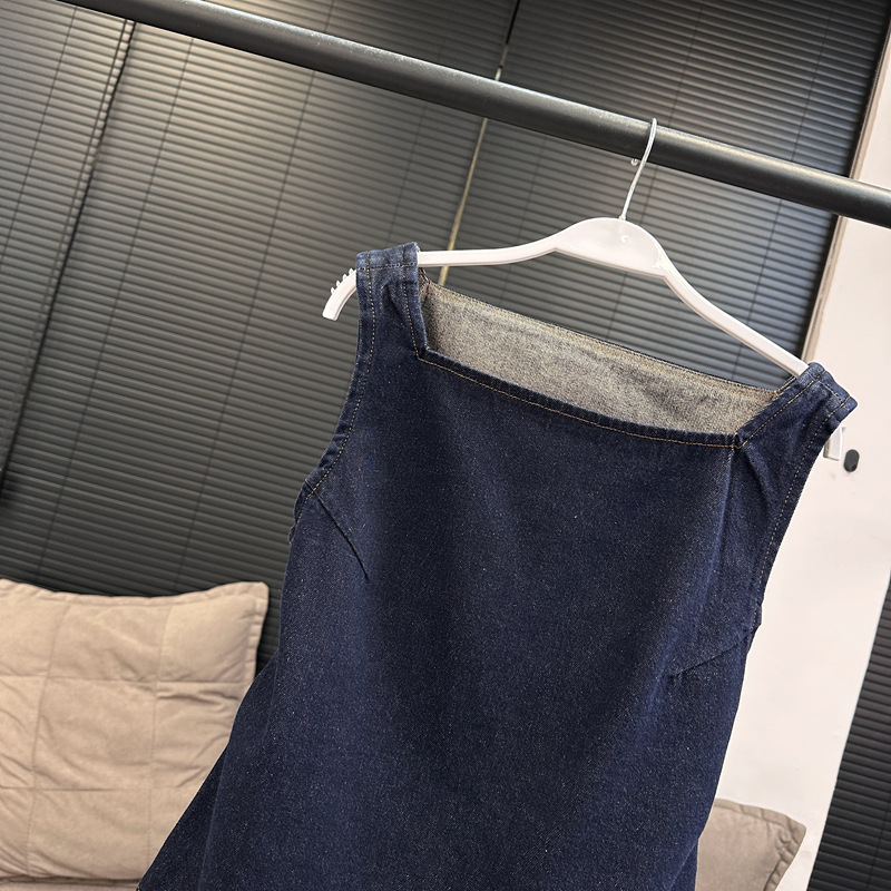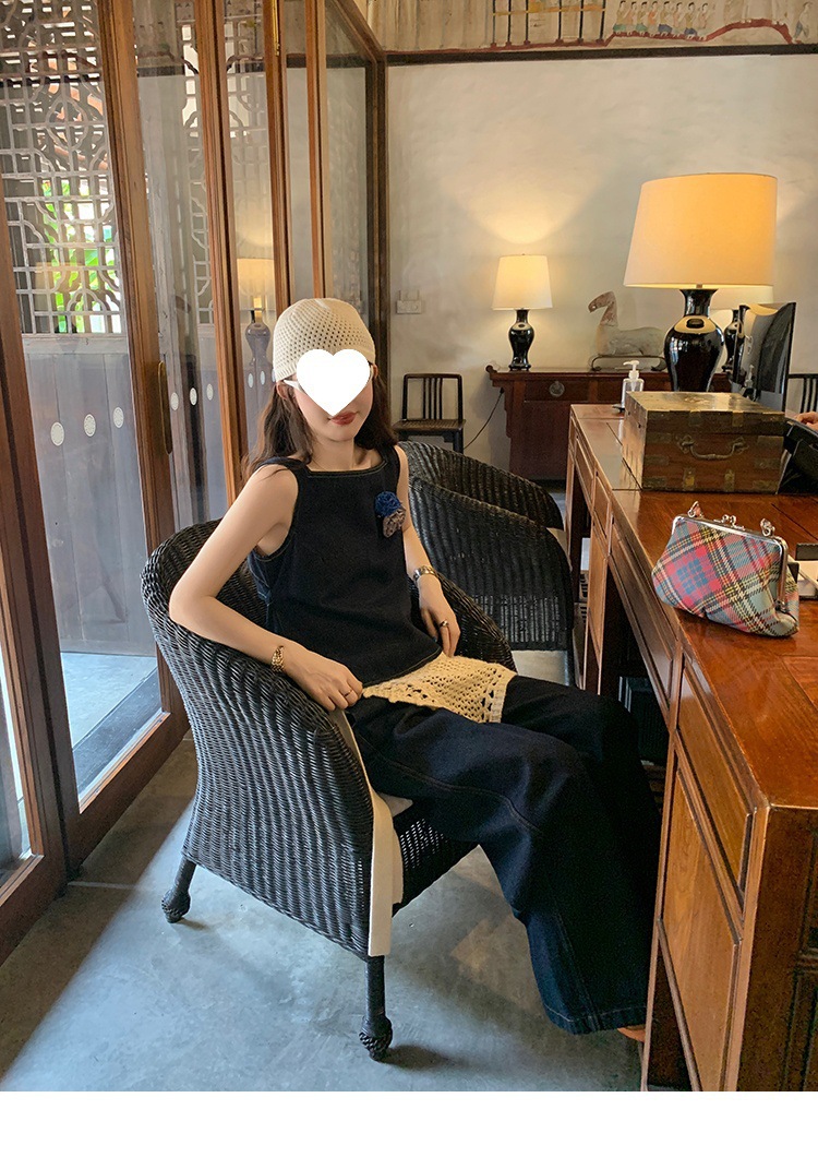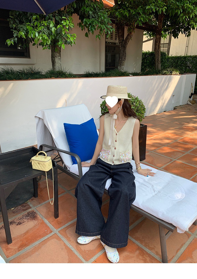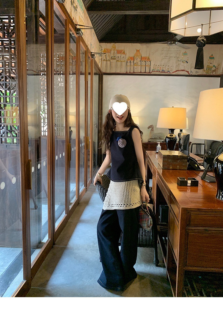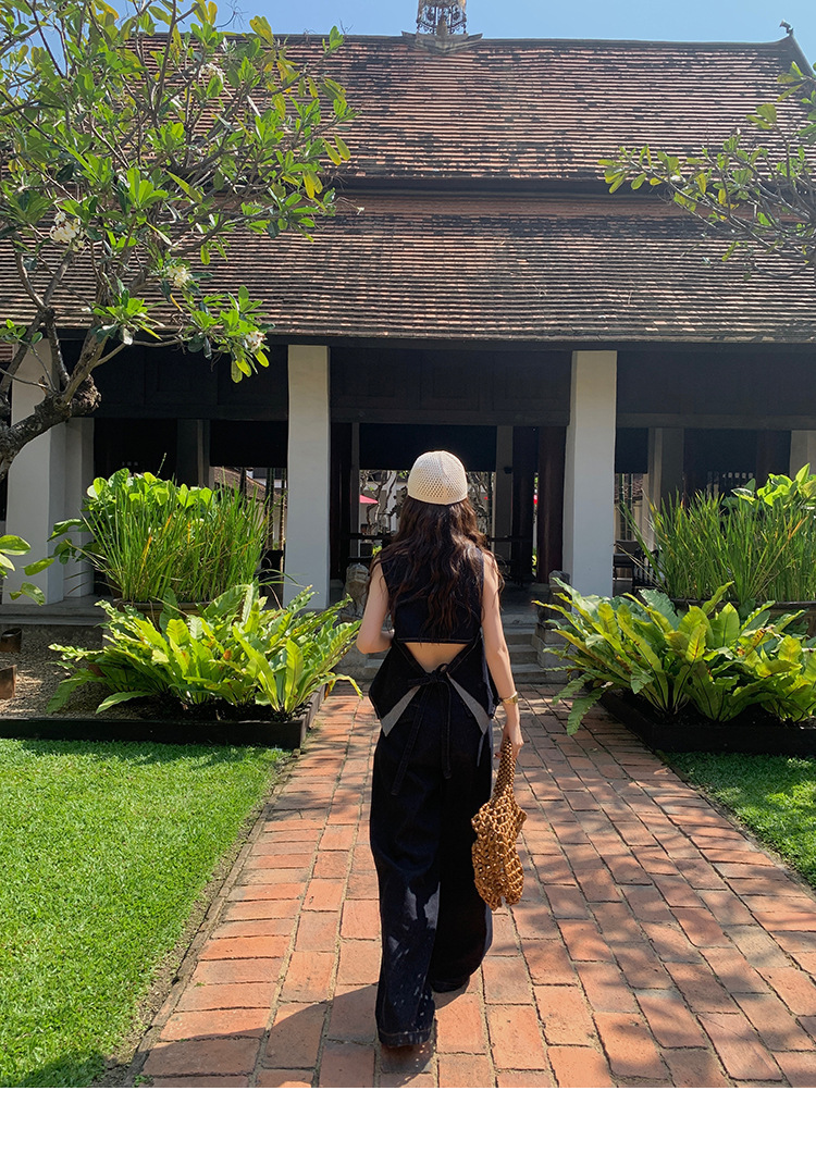 Красивый и простой уличный стиль, жилет с вырезом на спине и строчкой, джинсовый костюм оригинального цвета.