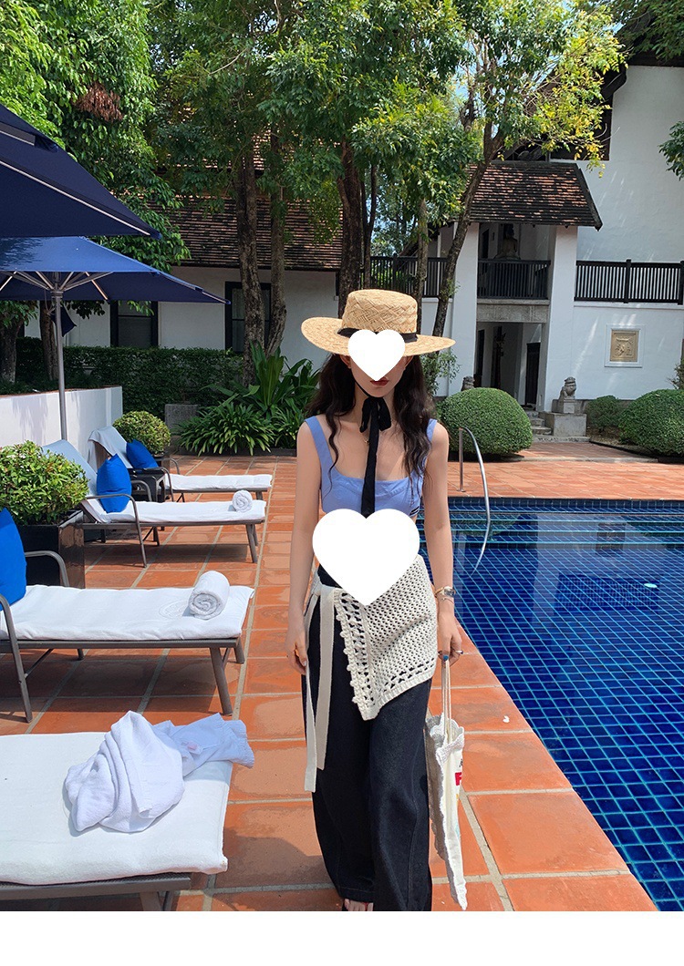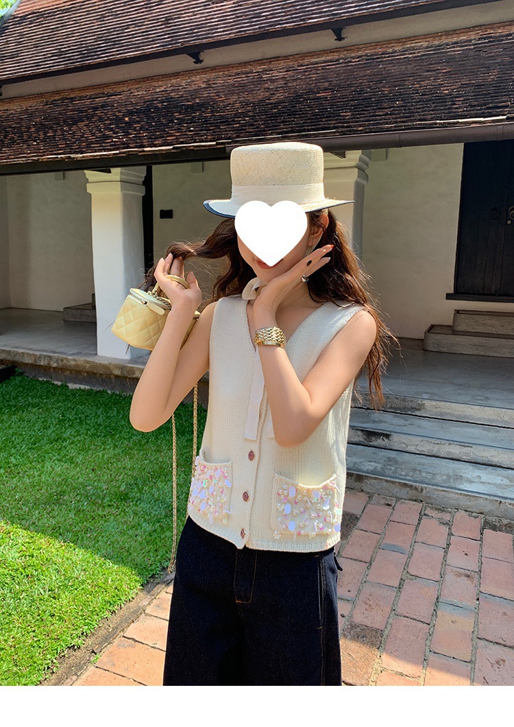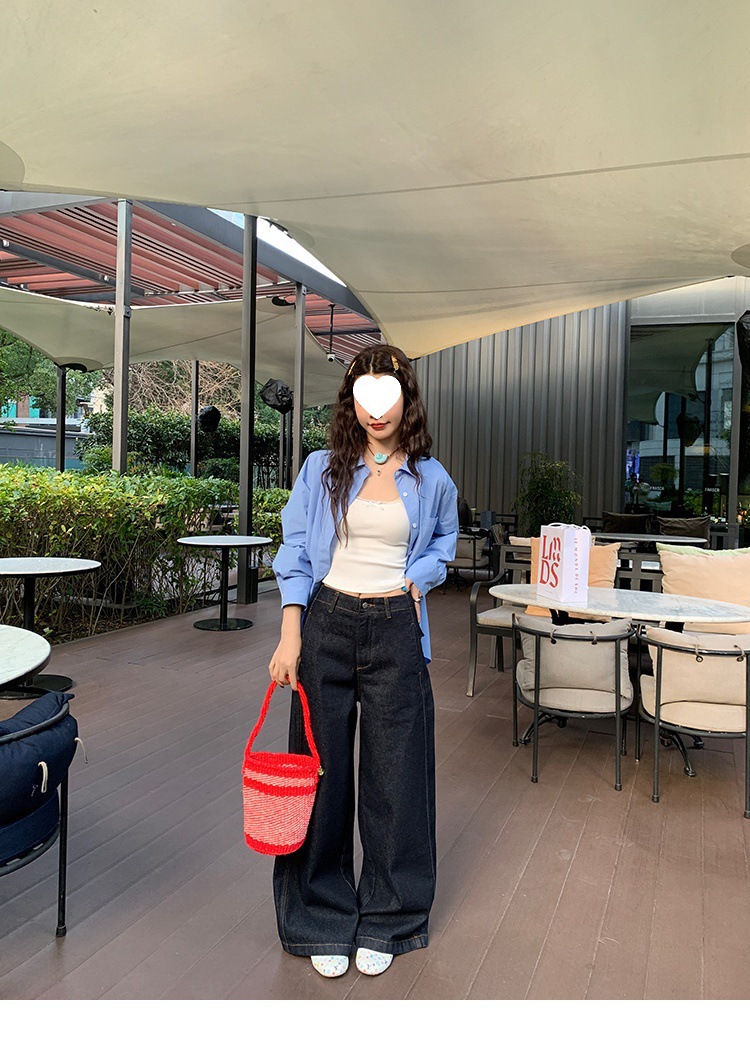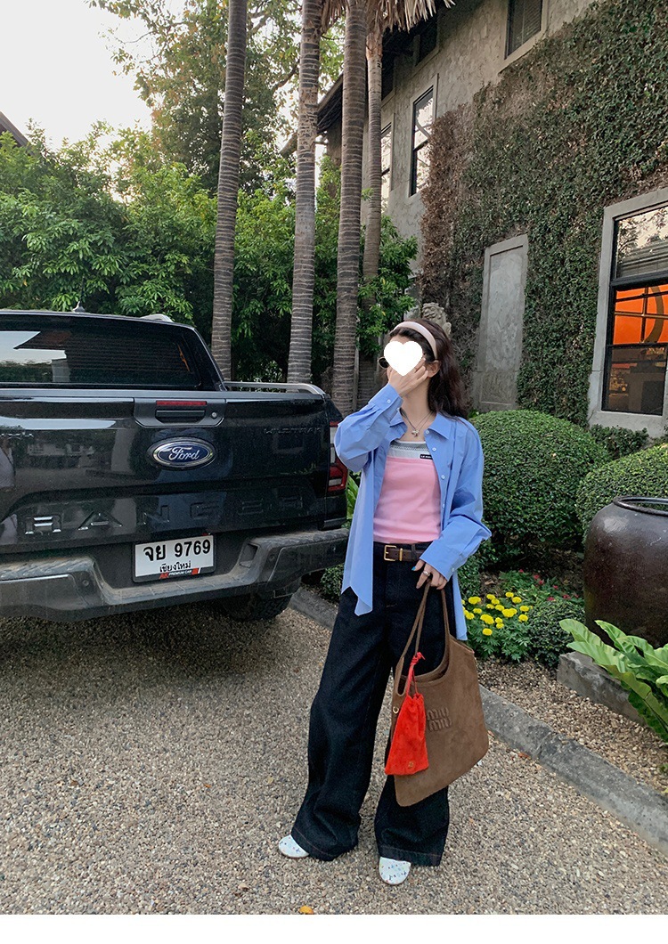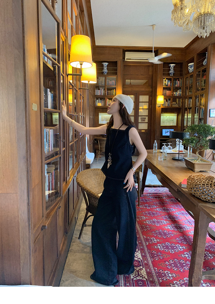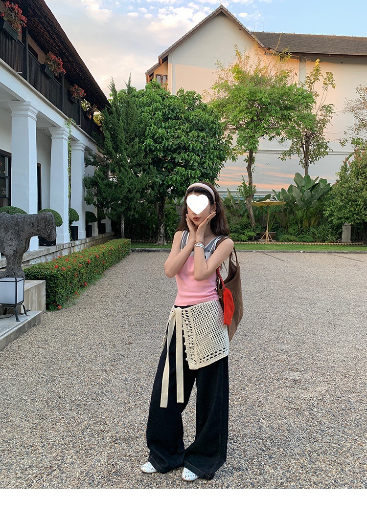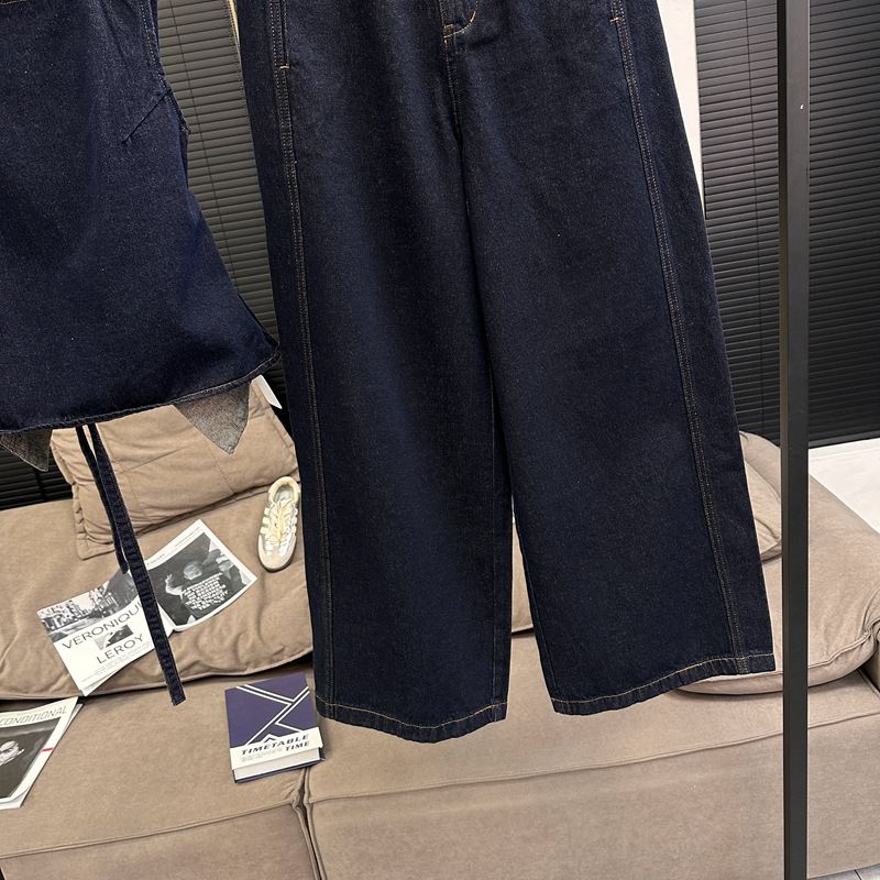 Красивый и простой уличный стиль, жилет с вырезом на спине и строчкой, джинсовый костюм оригинального цвета.