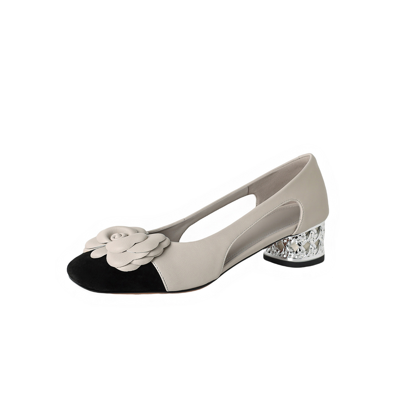 Французские туфли на среднем каблуке из воловьей кожи первого слоя с цветными блоками и острым носком на плоской подошве с камелией, весенне-осенние универсальные женские туфли на толстом каблуке с неглубоким носком, 25