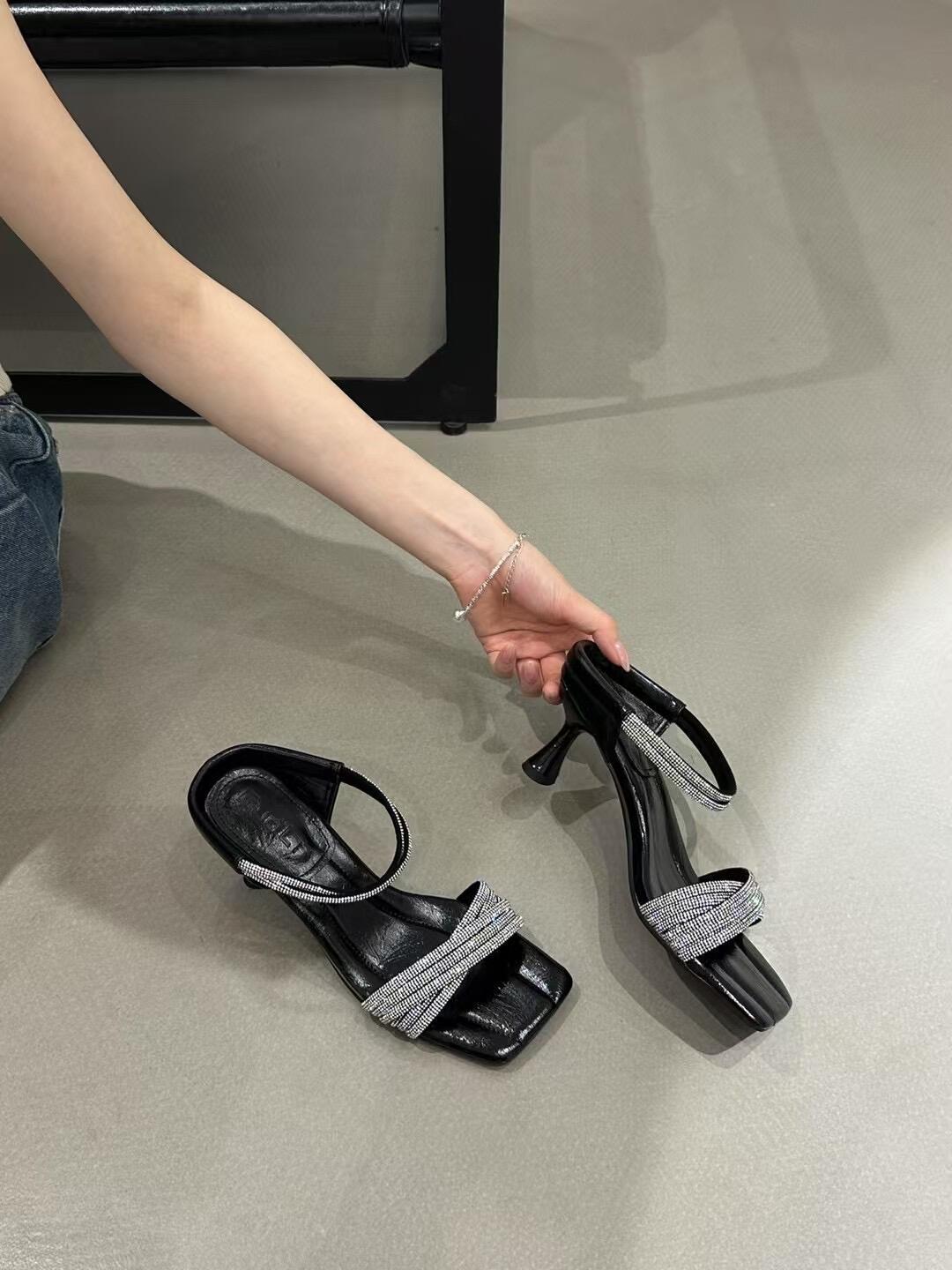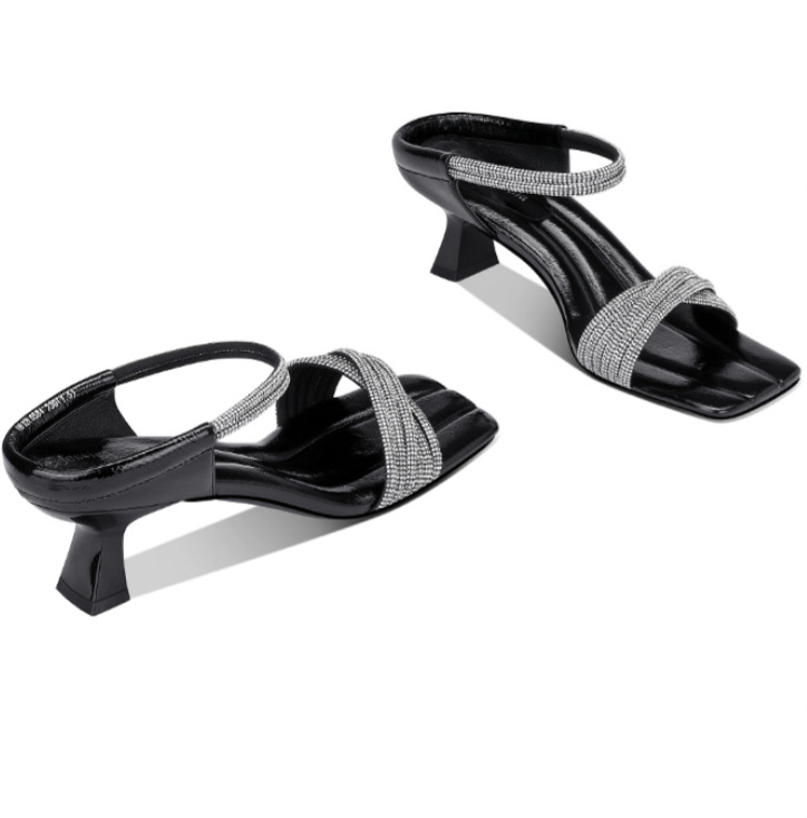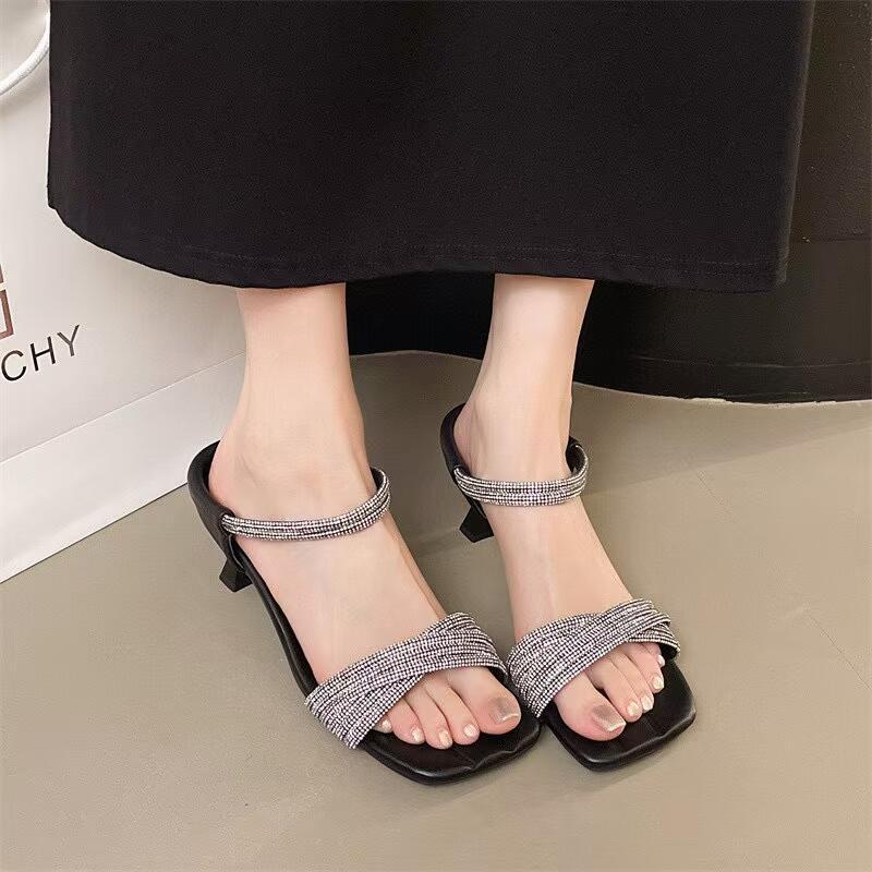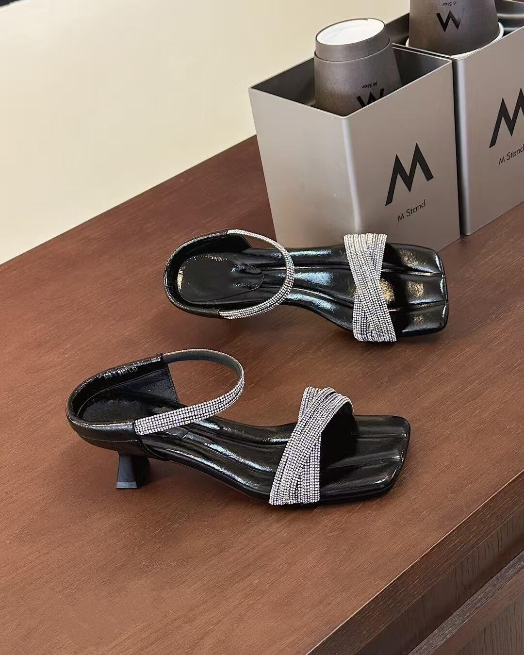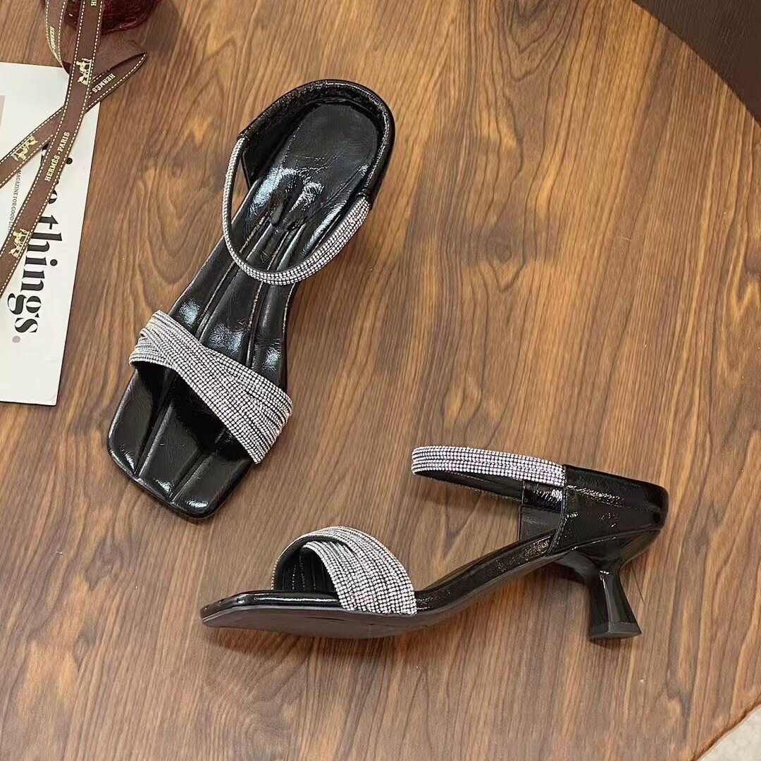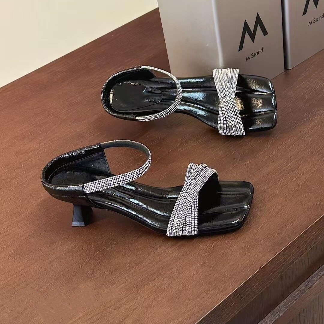 Женские летние босоножки 2025 года, квадратный носок, высокий каблук, модная новинка, с камнями, толстый каблук, к юбке, сказочные сандалии