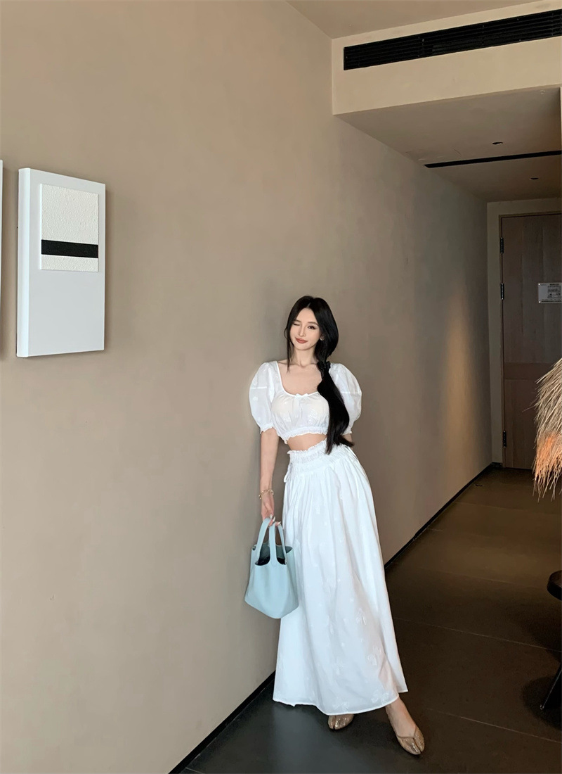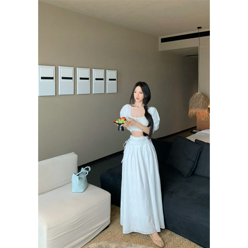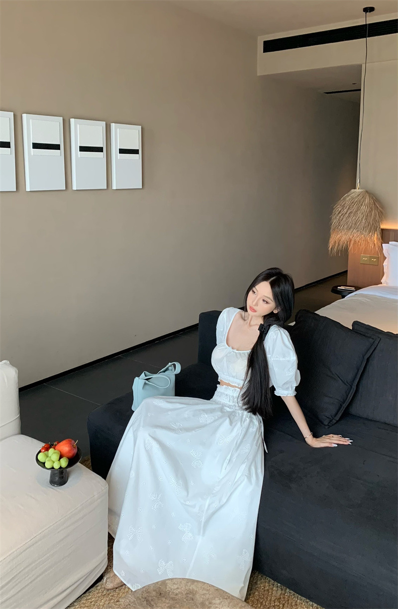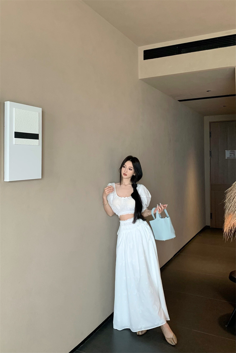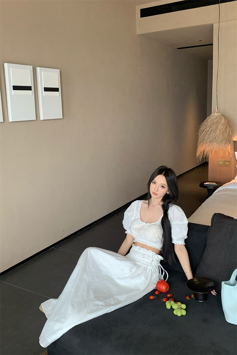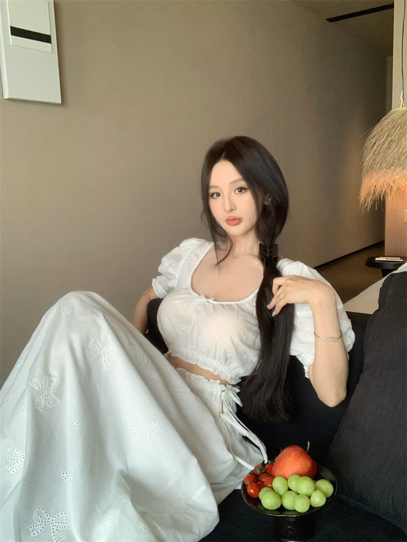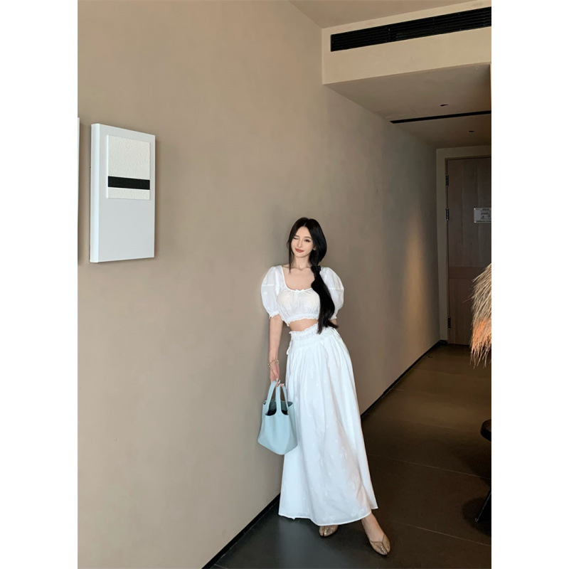 2025 Настоящая цена Блузка с пузырьковыми рукавами и большим U-образным вырезом Женский летний костюм с юбкой средней длины из жаккарда Женская одежда