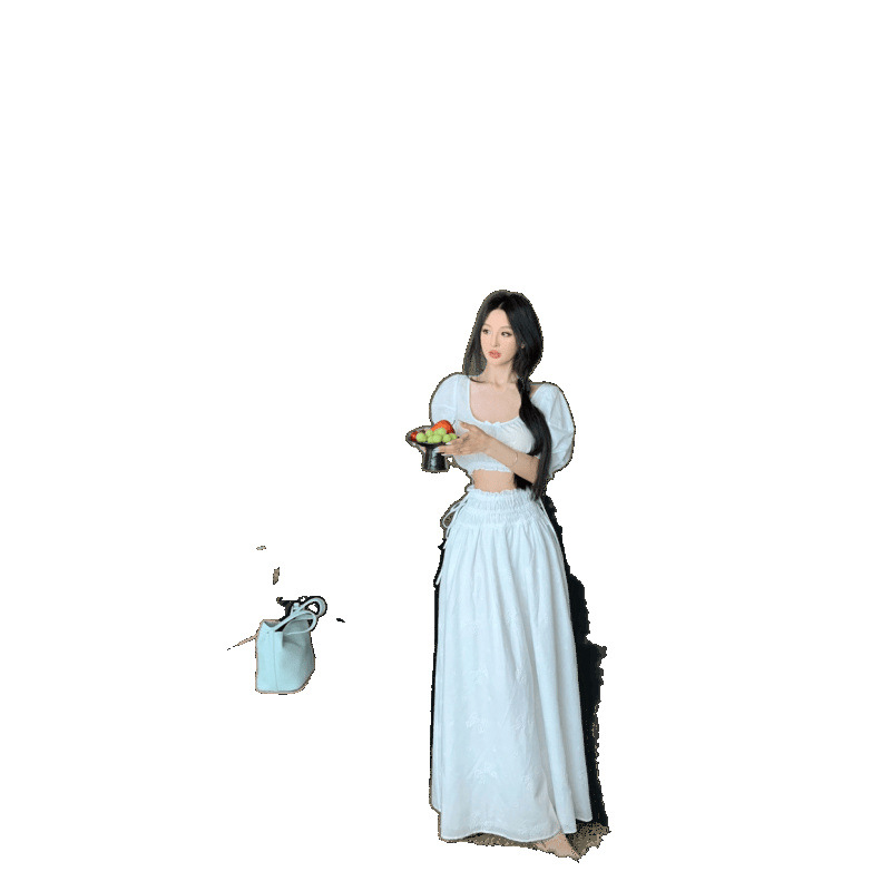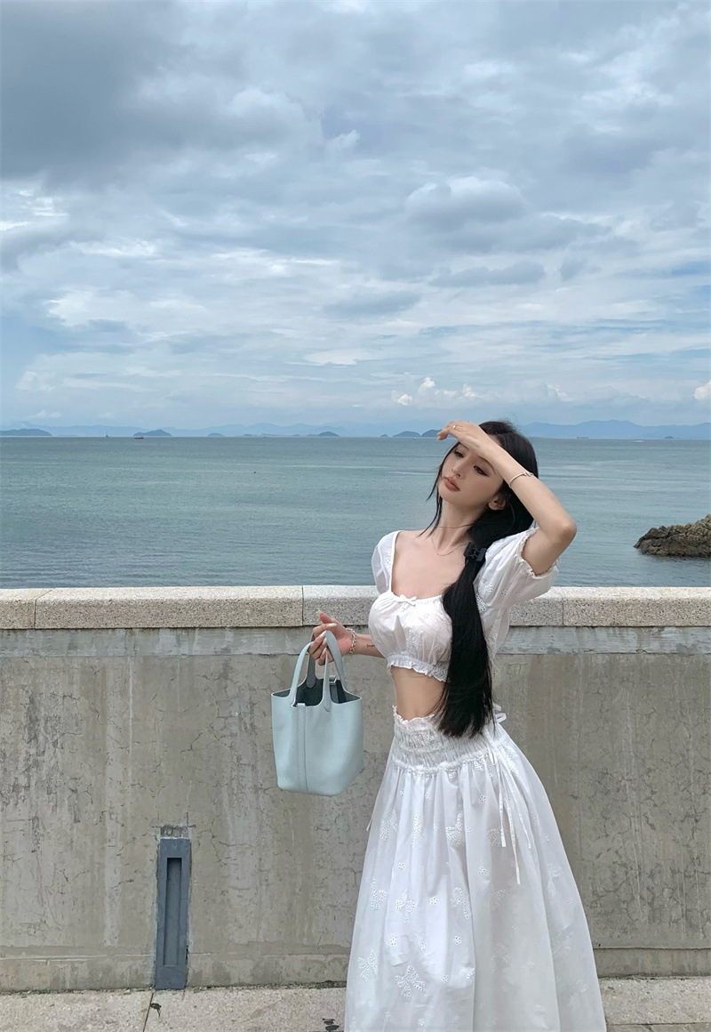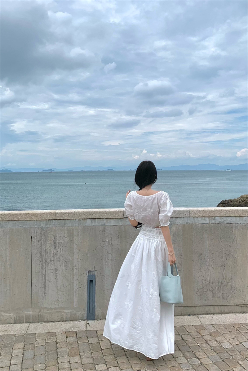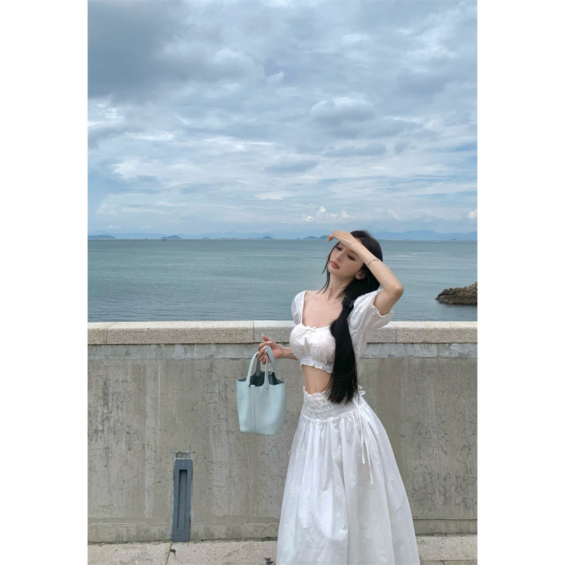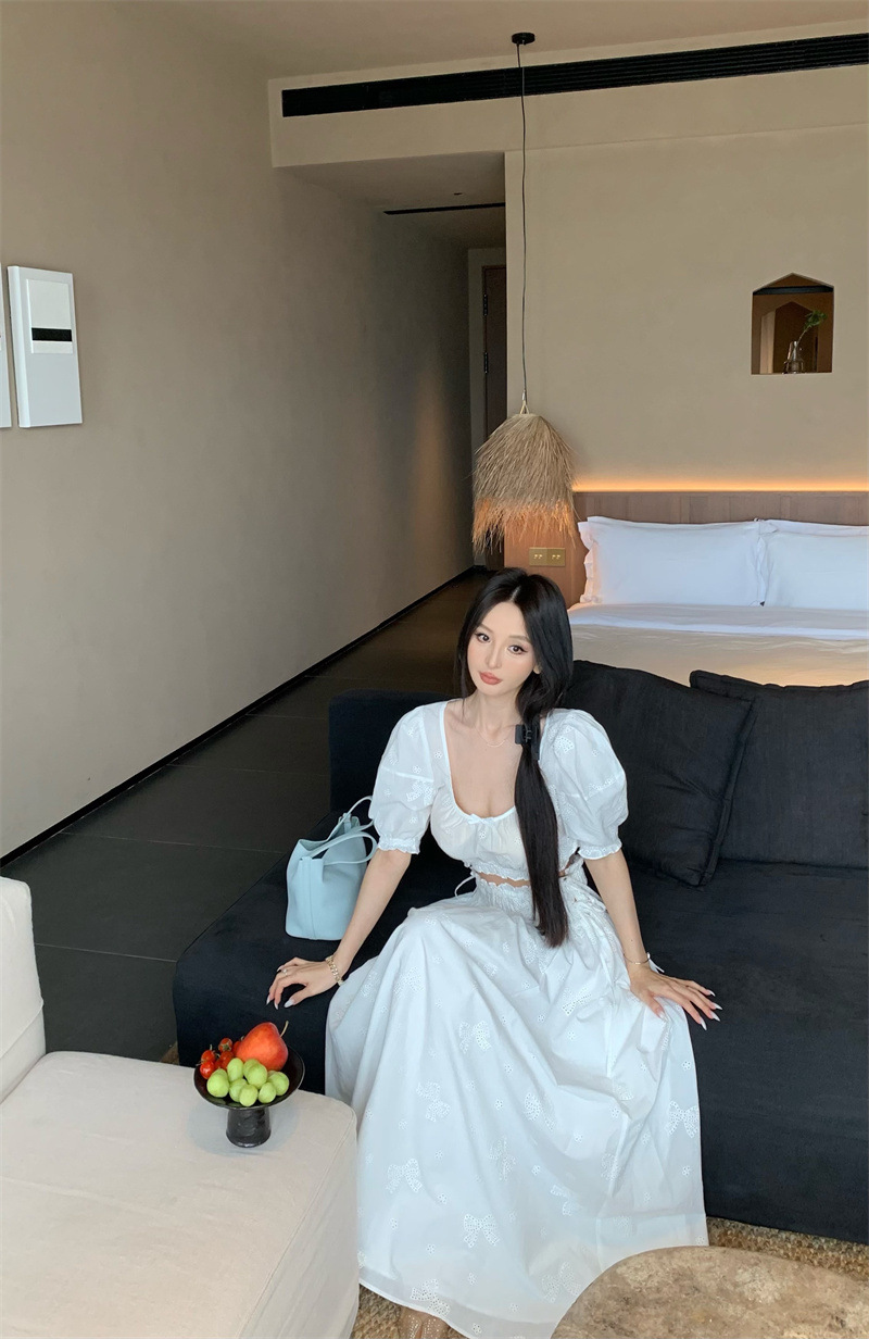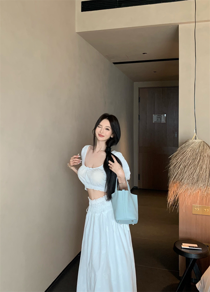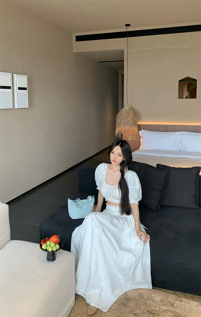 2025 Настоящая цена Блузка с пузырьковыми рукавами и большим U-образным вырезом Женский летний костюм с юбкой средней длины из жаккарда Женская одежда