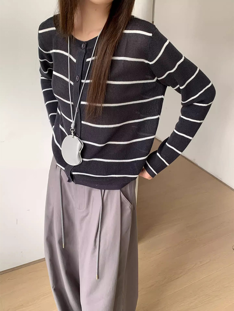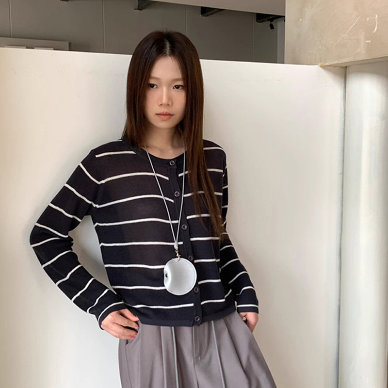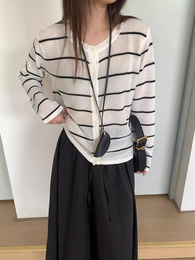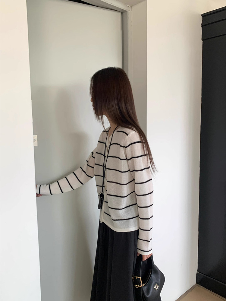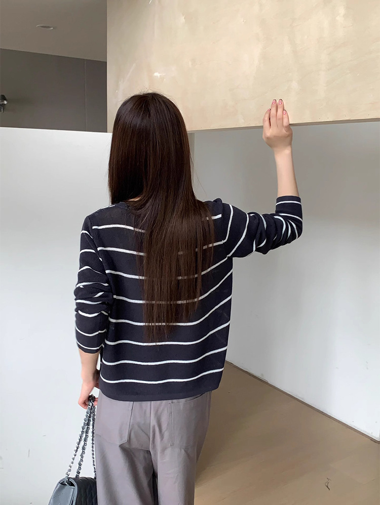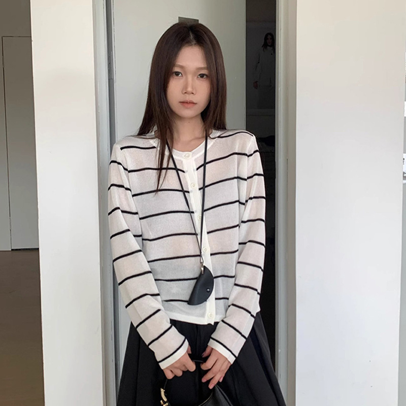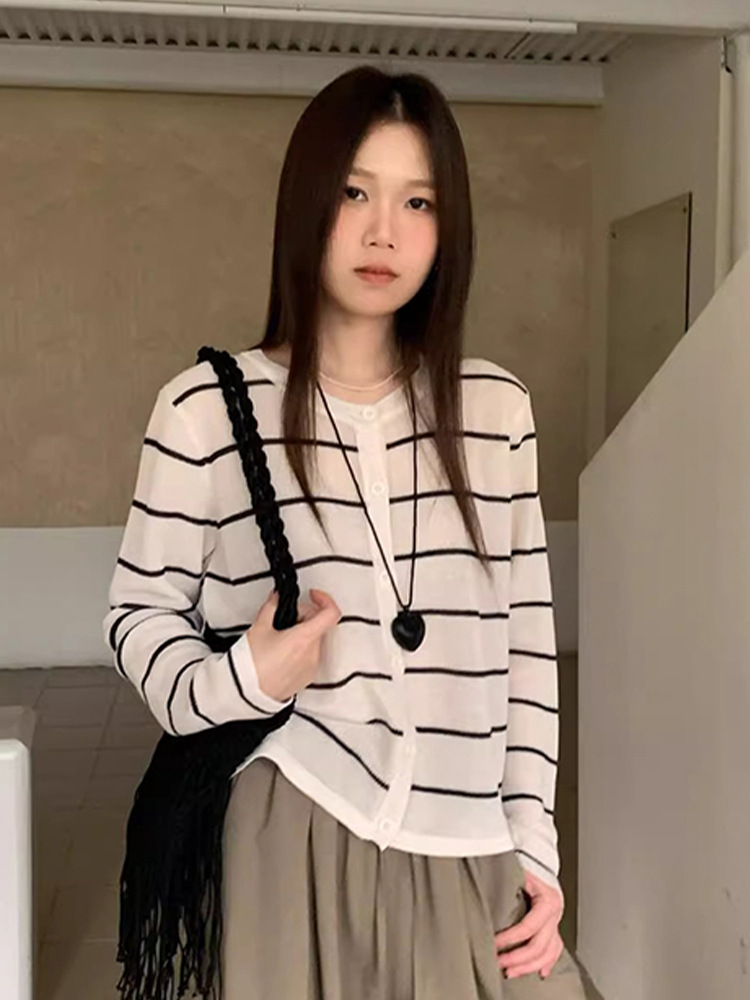 Летняя тонкая и супер приятная свободная верхняя одежда, солнцезащитный топ, слегка прозрачный полосатый вязаный кардиган в корейском стиле с длинными рукавами для женщин