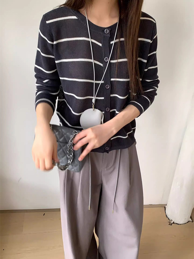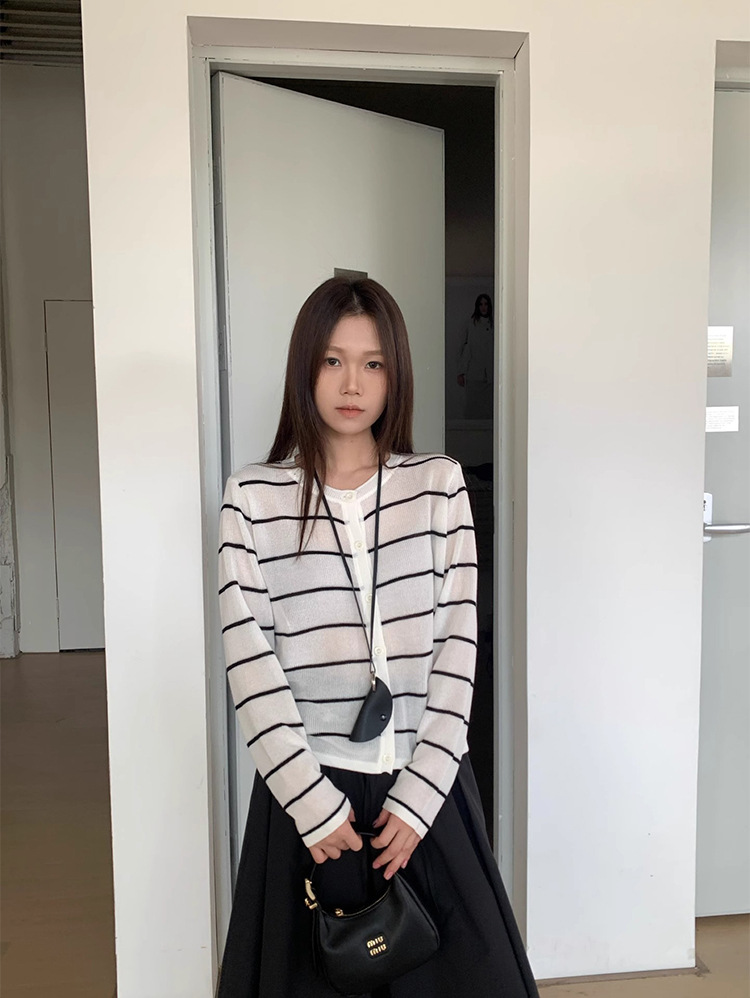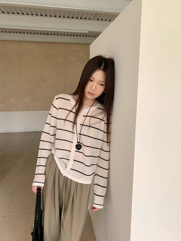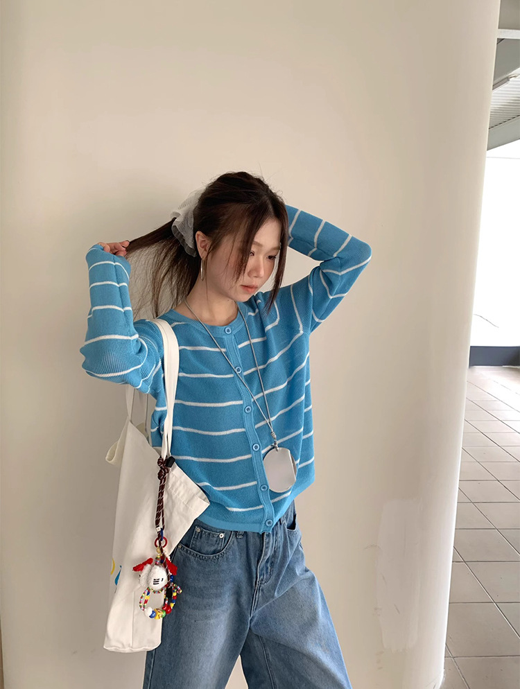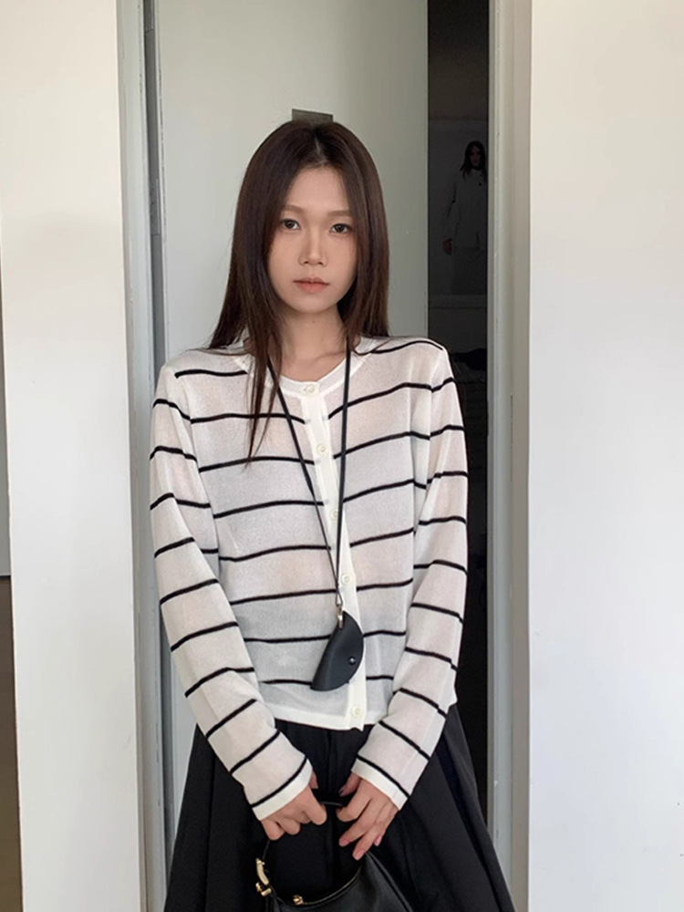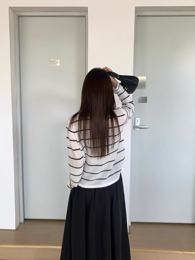 Летняя тонкая и супер приятная свободная верхняя одежда, солнцезащитный топ, слегка прозрачный полосатый вязаный кардиган в корейском стиле с длинными рукавами для женщин