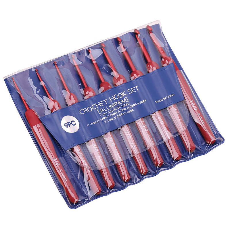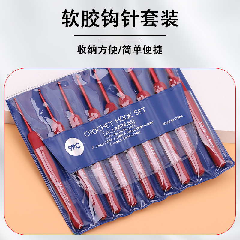 Набор из 9 крючков с красной ручкой, упаковка ПВХ, 122,6 г.; Набор из 9 крючков с синей ручкой, упаковка из ПВХ.; Набор из 9 крючков с черной ручкой, упаковка из ПВХ.; Набор из 9 разноцветных крючков для вязания головок в упаковке из ПВХ.; Набор из 9 крючков TPR, упаковка из ПВХ.