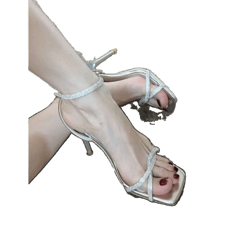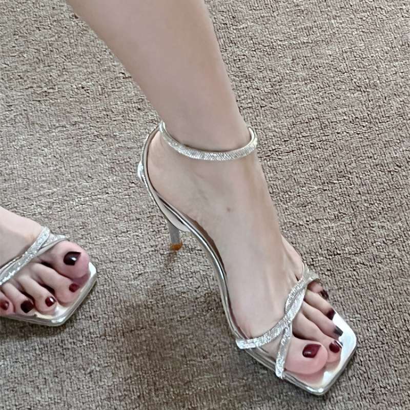 Французские босоножки на высоком каблуке для женщин, лето 2025, новый стиль, серебряные стразы, одноремешковые летние шпильки, римские сандалии