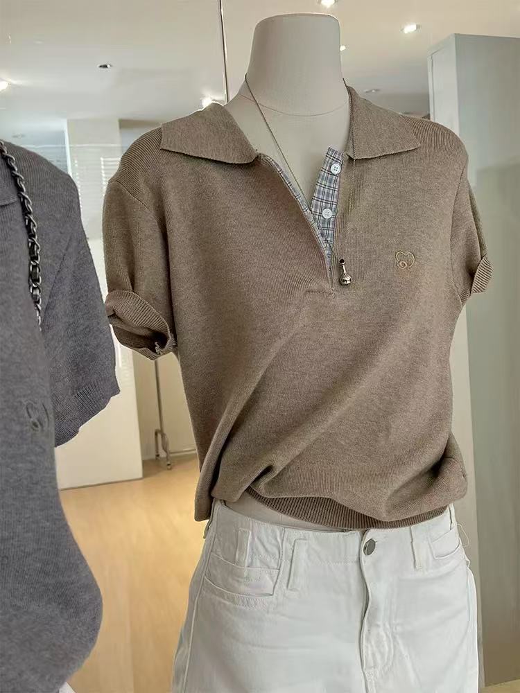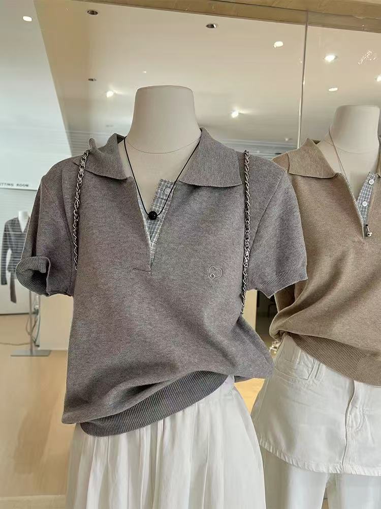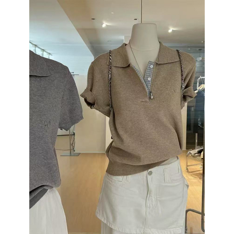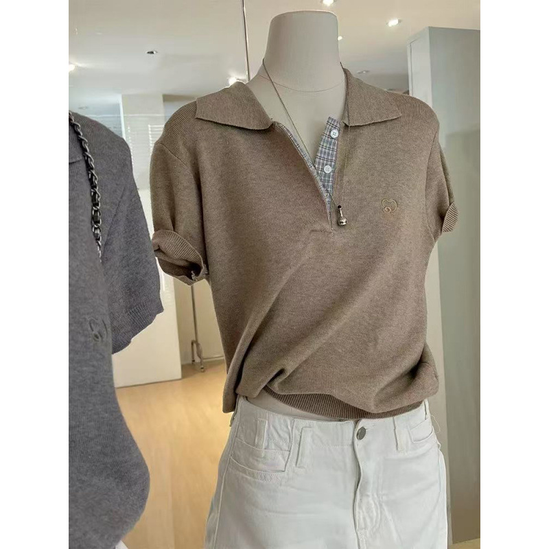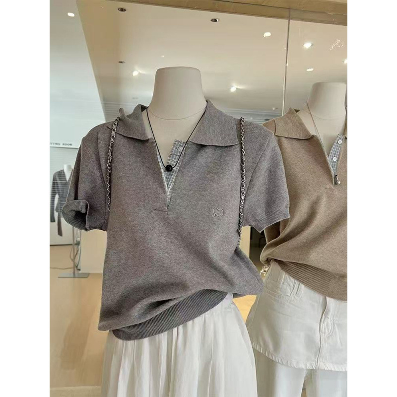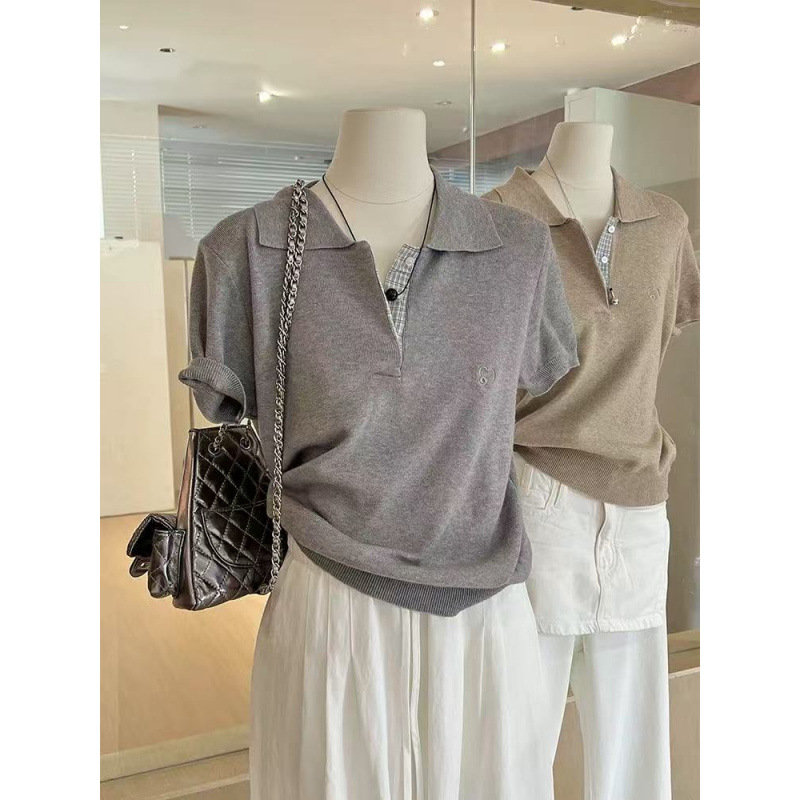 Женский трикотажный топ с коротким рукавом и воротником поло, новинка весны 2025 года, с вышивкой, клетчатый, шикарный, свободный, стройнящий, в корейском стиле