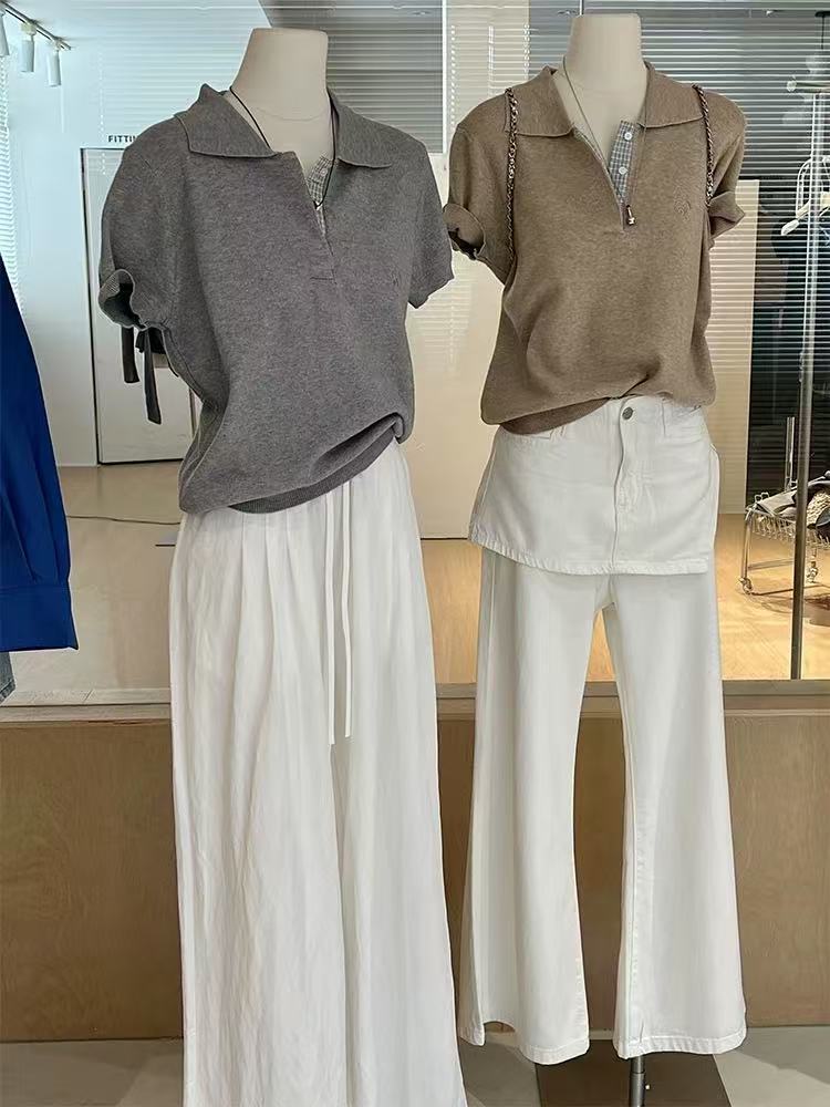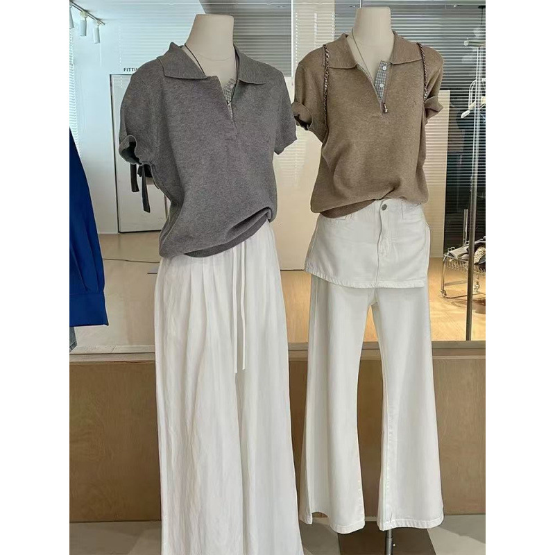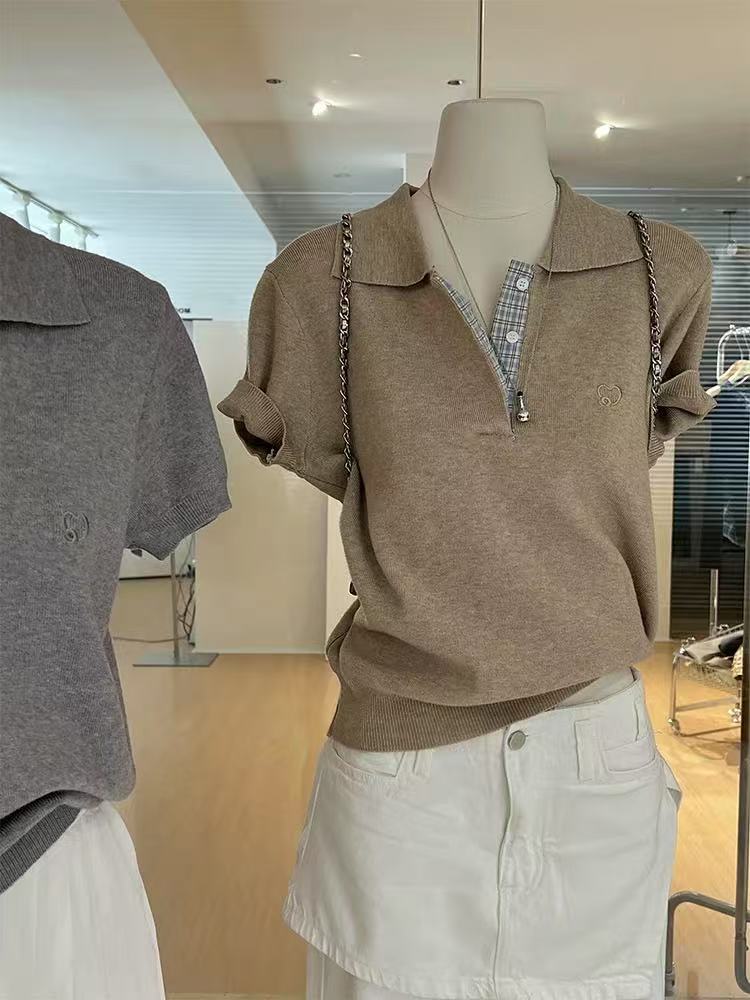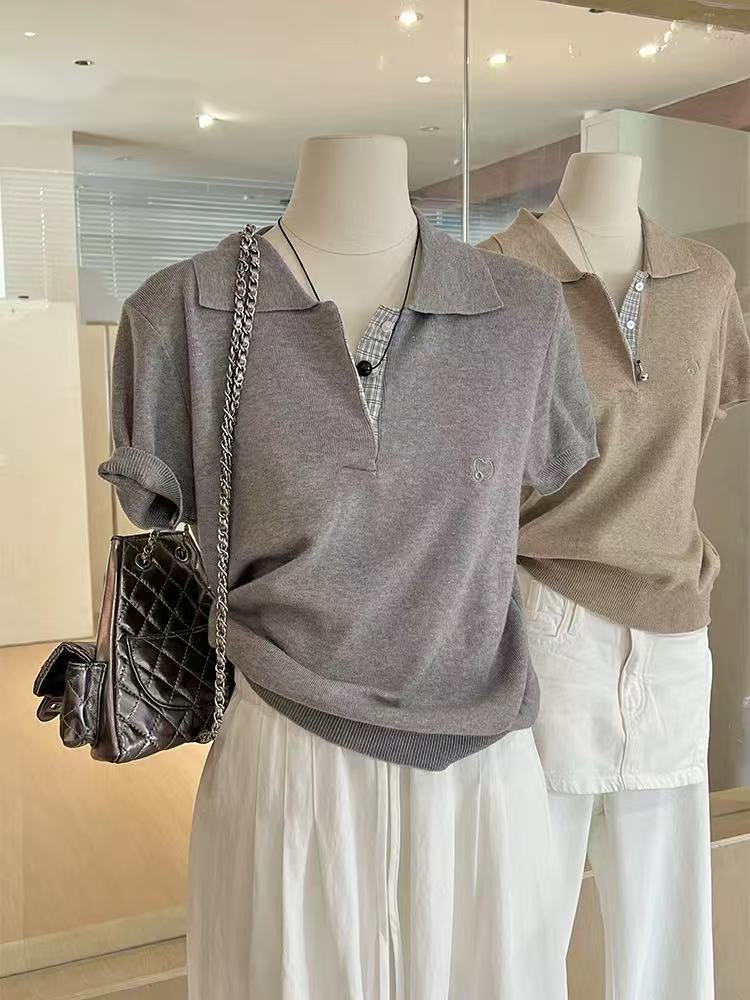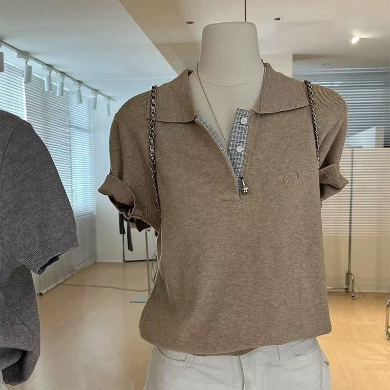 Женский трикотажный топ с коротким рукавом и воротником поло, новинка весны 2025 года, с вышивкой, клетчатый, шикарный, свободный, стройнящий, в корейском стиле