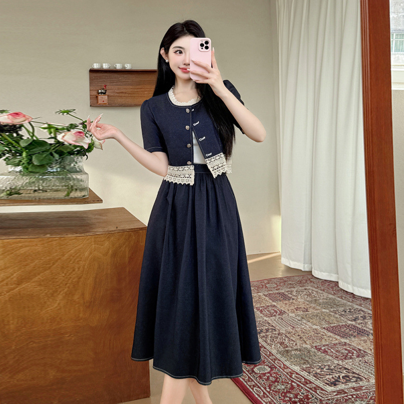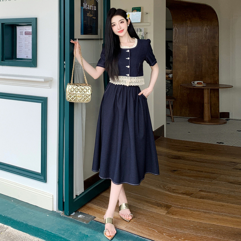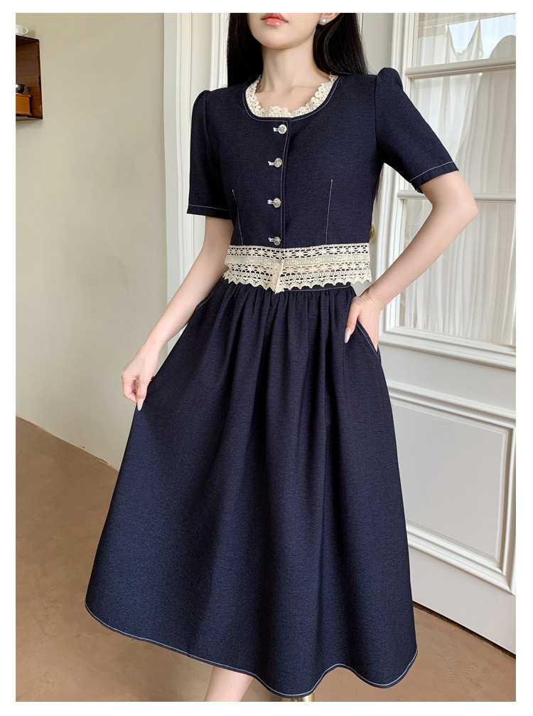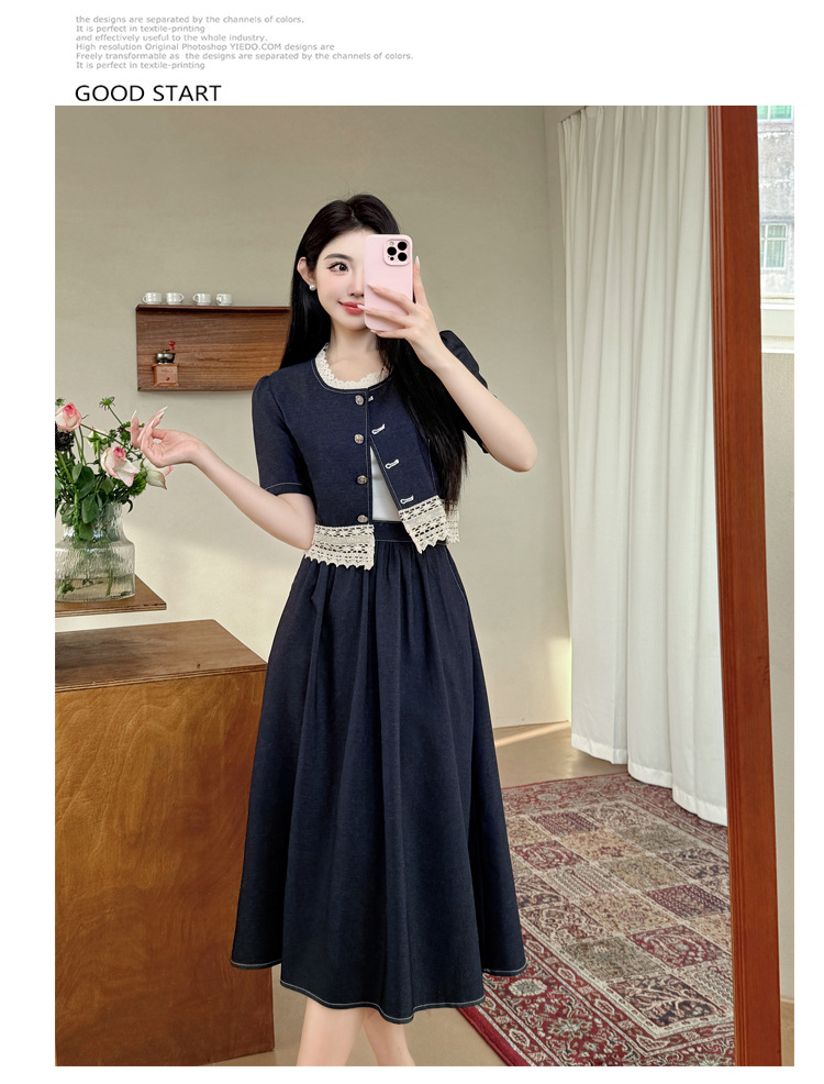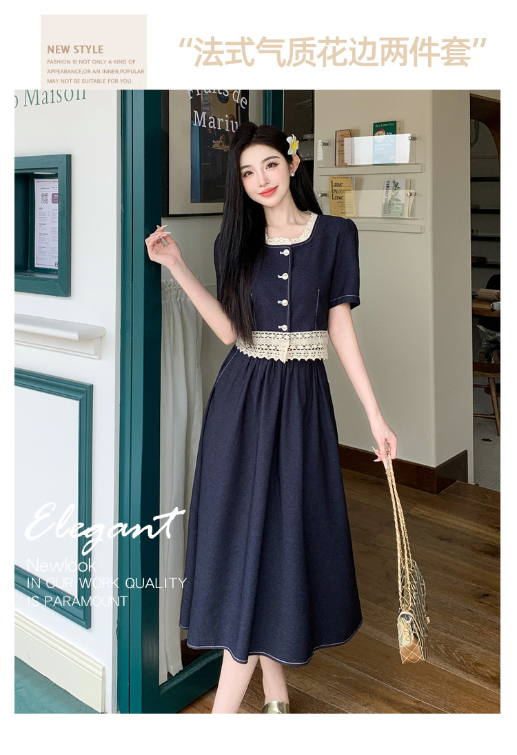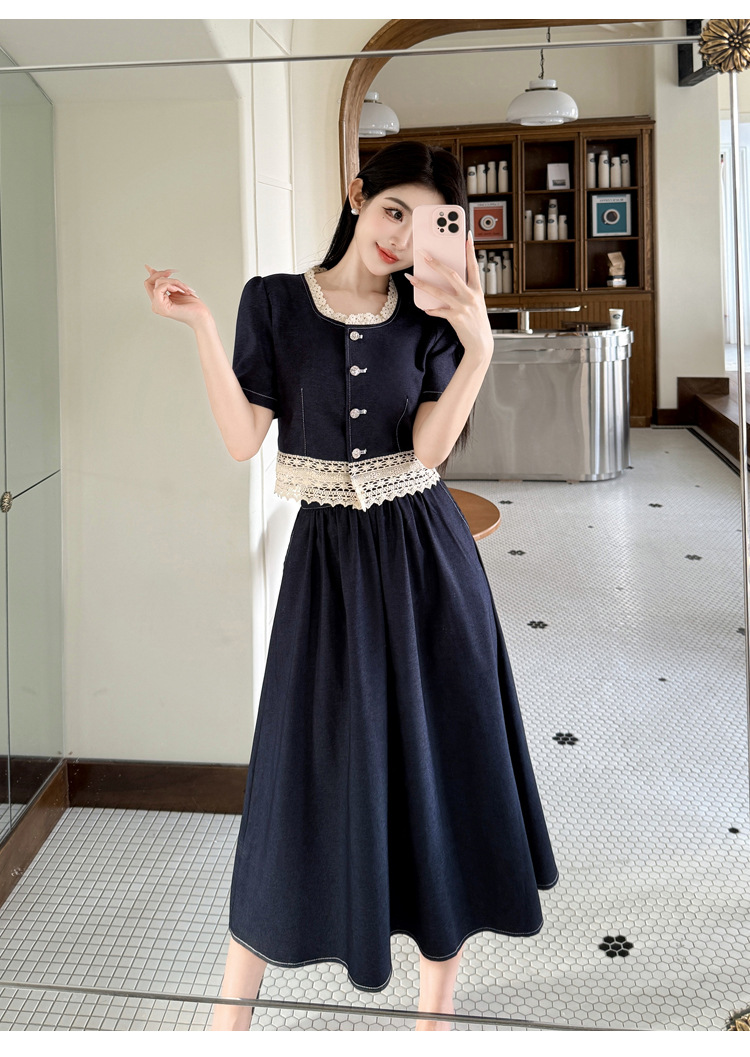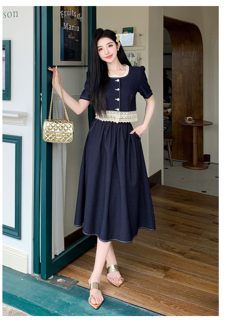 Настоящая фотография летнего комплекта из двух предметов: короткий топ и юбка из тенсельного денима с квадратным воротником и кружевом.