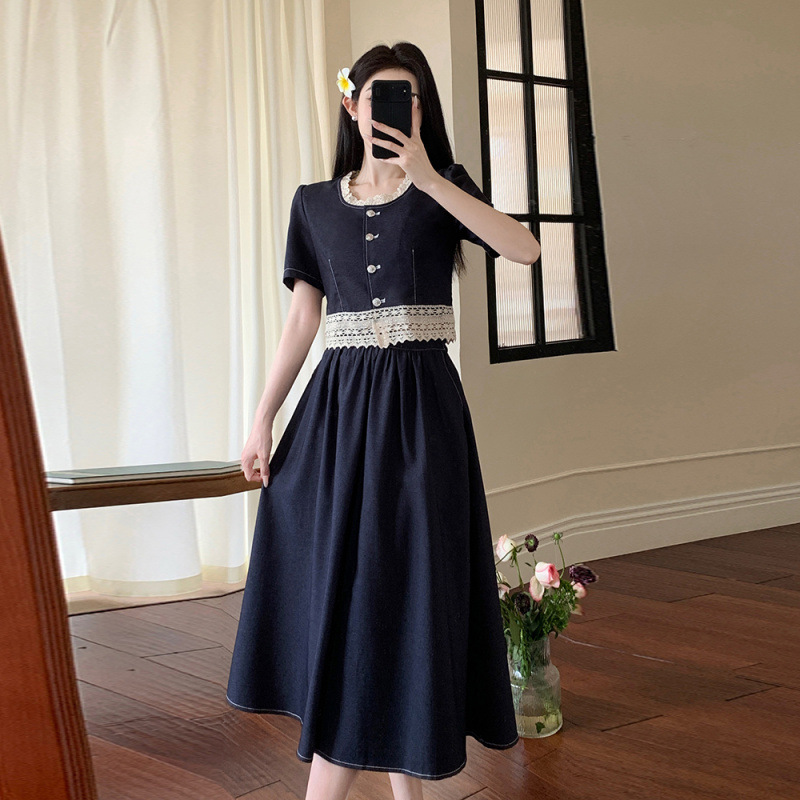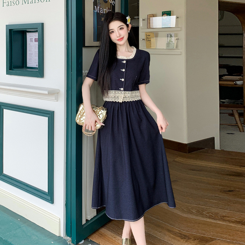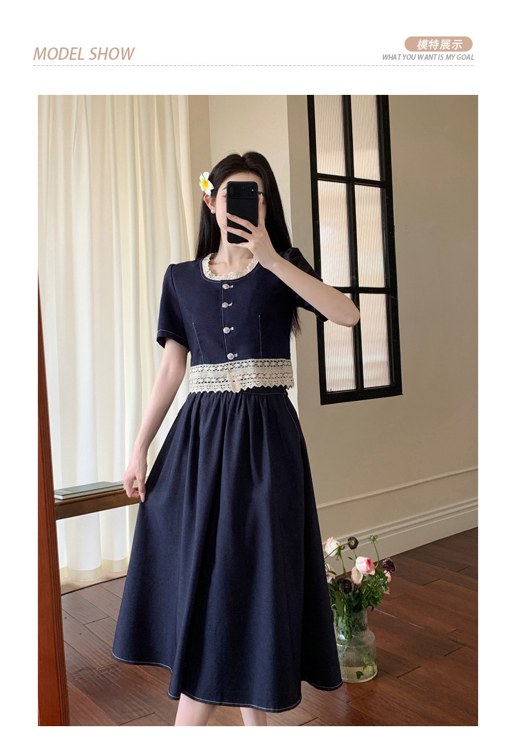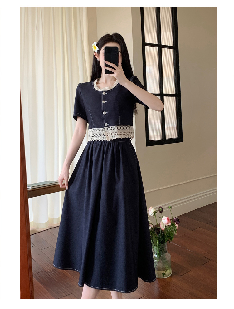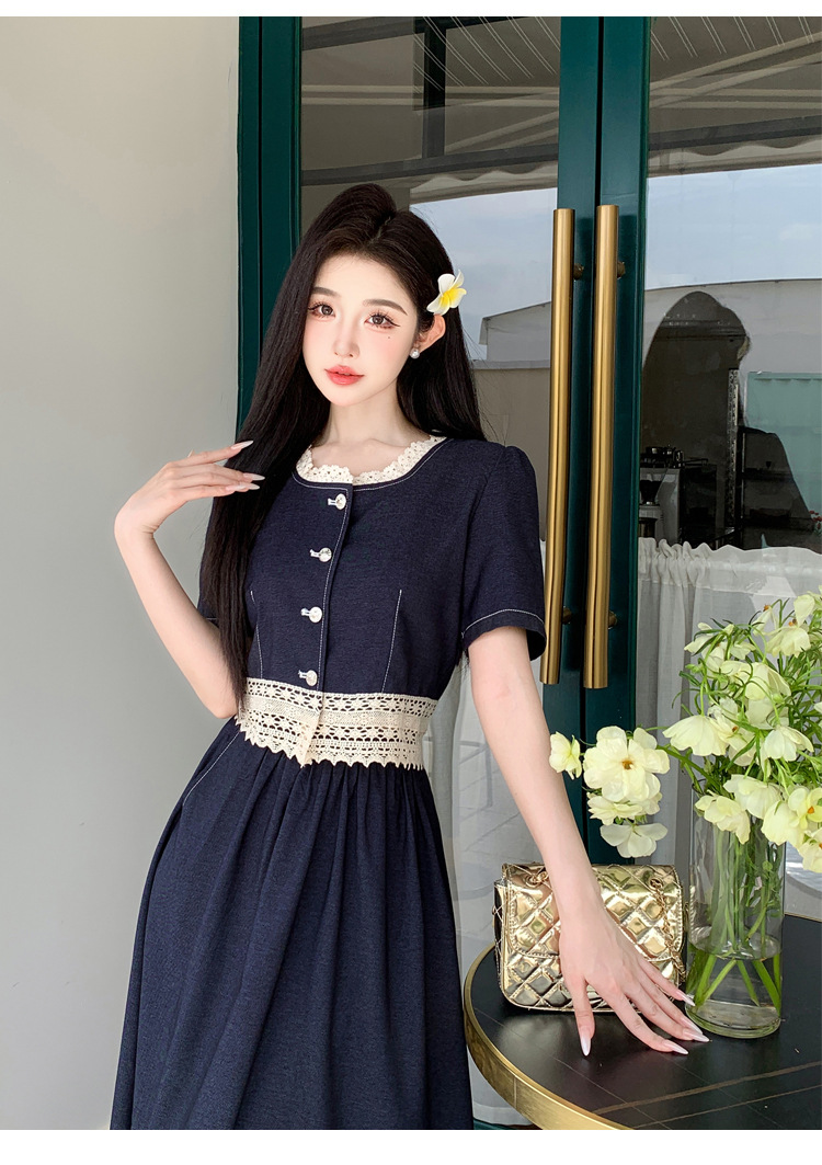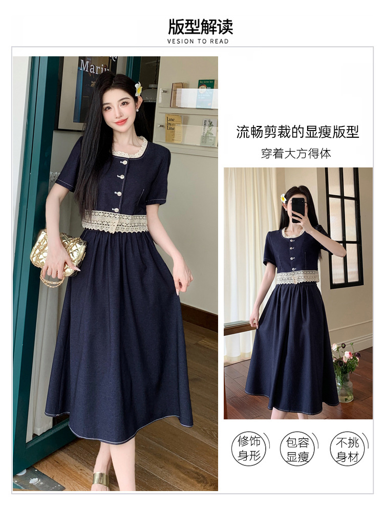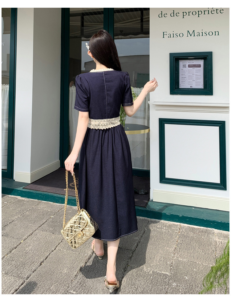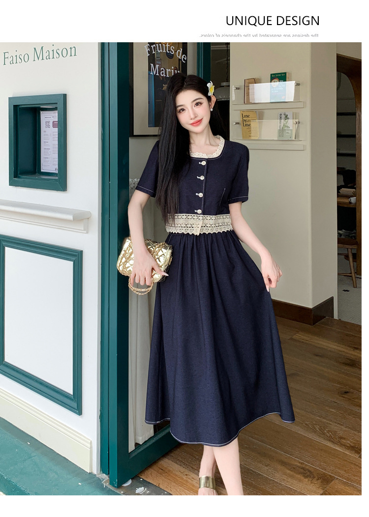 Настоящая фотография летнего комплекта из двух предметов: короткий топ и юбка из тенсельного денима с квадратным воротником и кружевом.