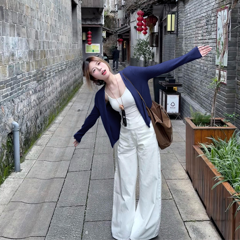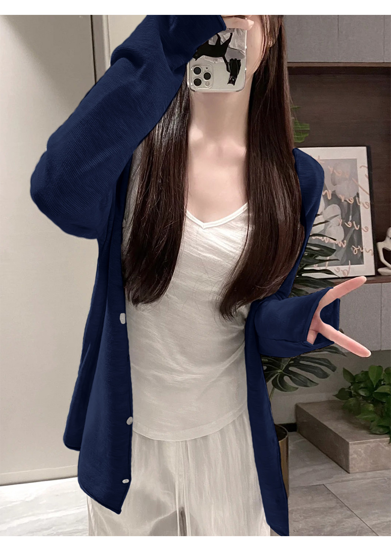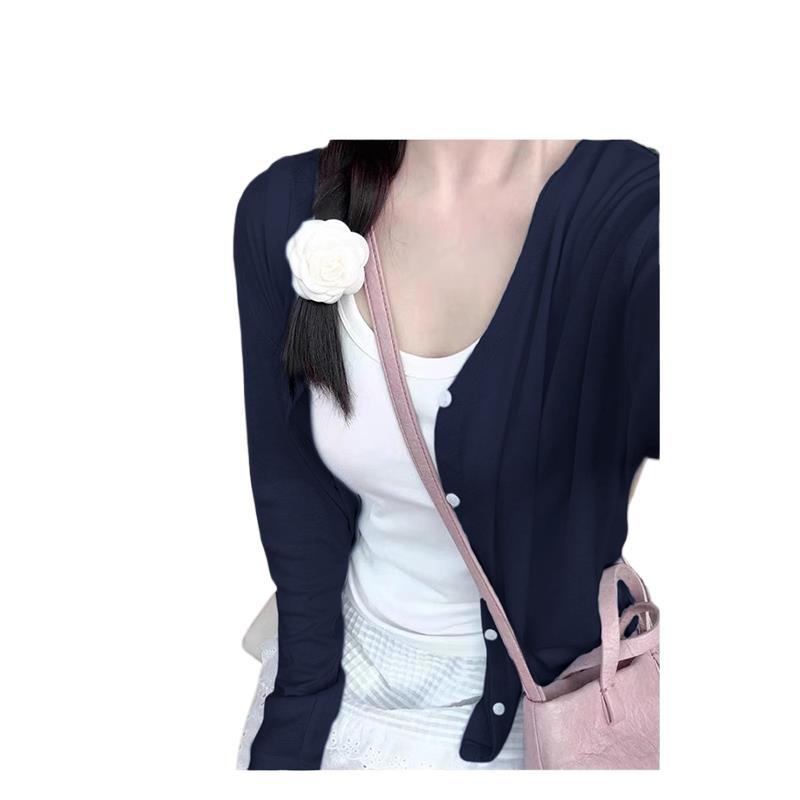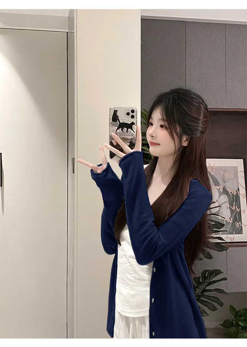 Темно-синий солнцезащитный кардиган с юбкой на подтяжках и летней блузкой, тюлевым топом, летней легкой курткой, тонким фасоном.