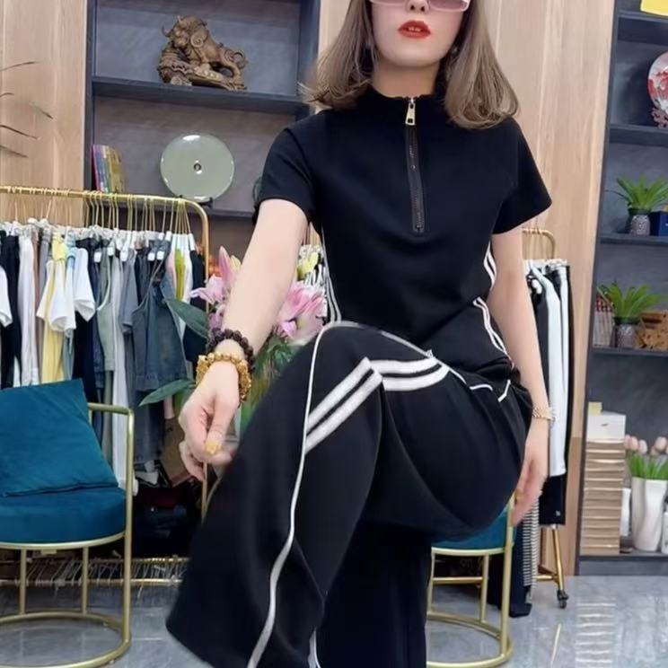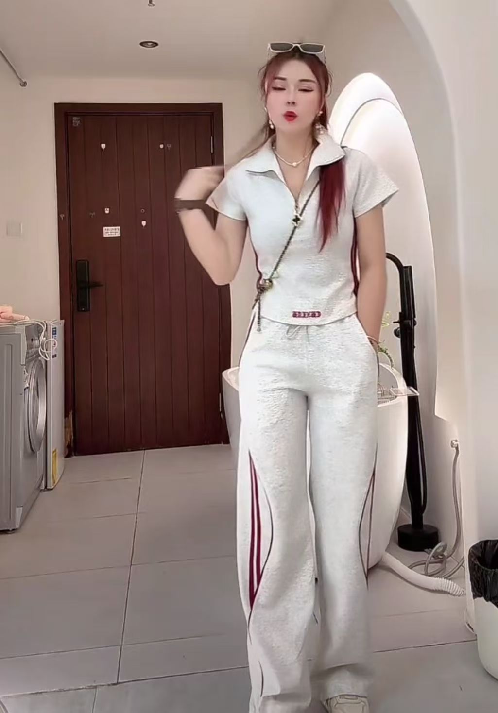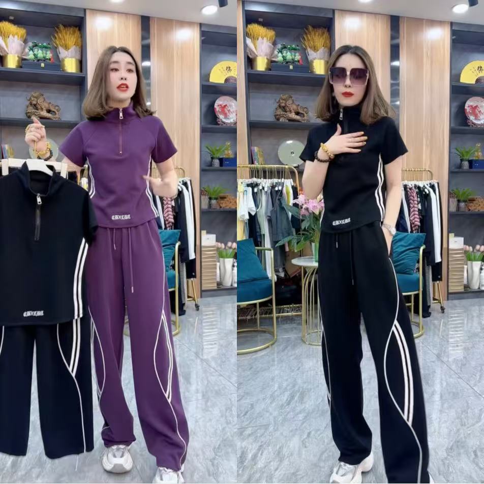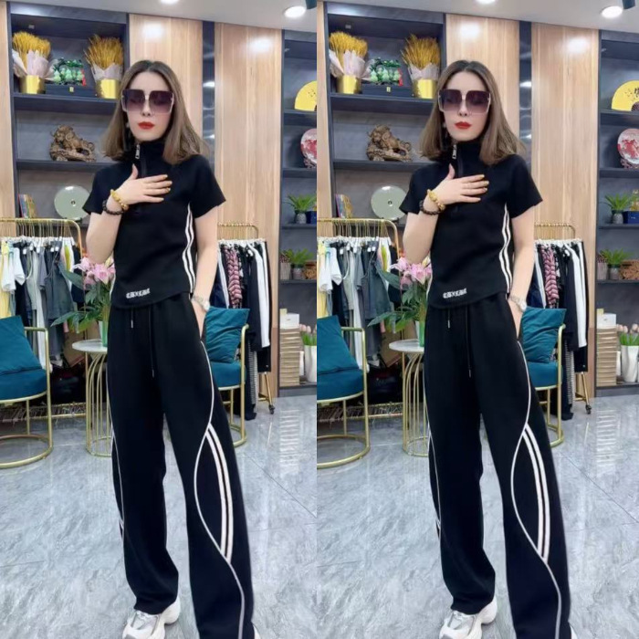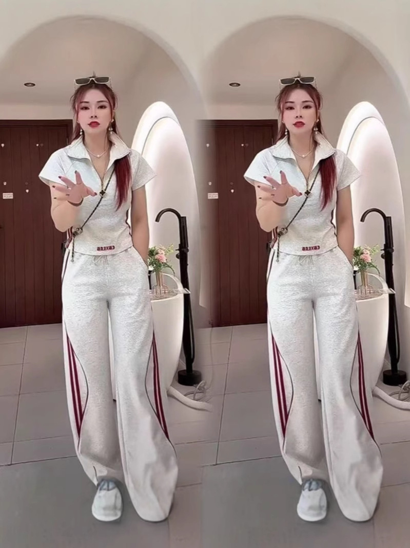 Летний спортивный костюм Salt series 2025, модная повседневная модель: топ с коротким рукавом и полузастежкой, широкие брюки, комплект из двух предметов.