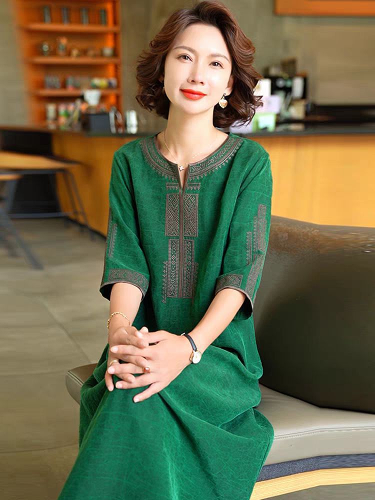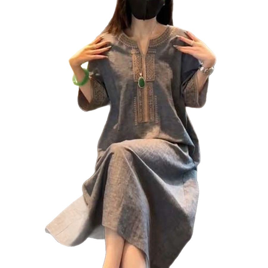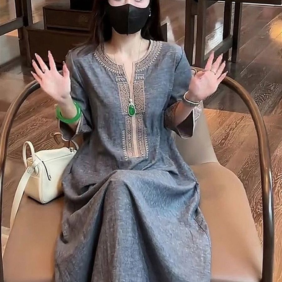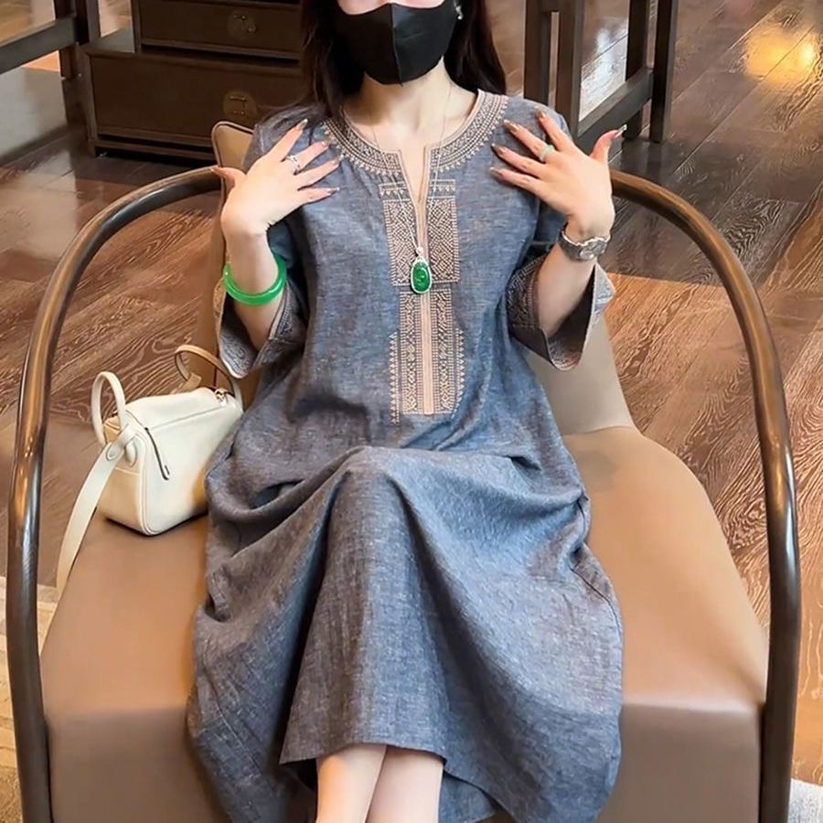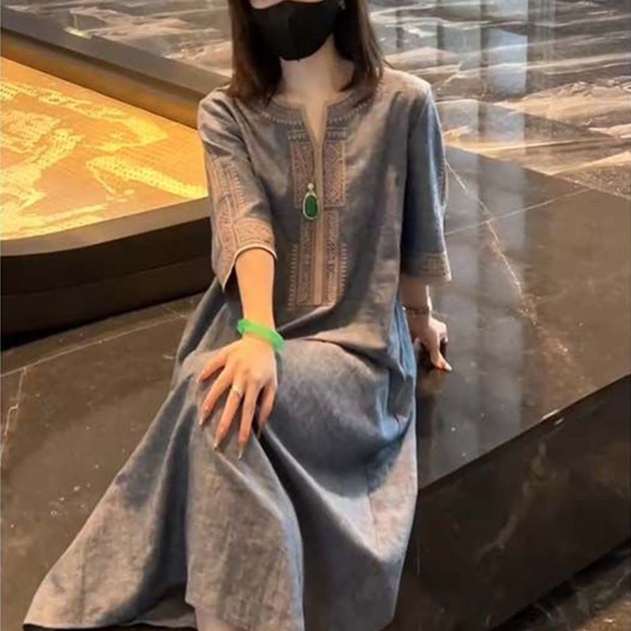 Новое китайское платье в национальном стиле с принтом, V-образным вырезом, для женщин, лето 2025, свободного кроя, стройнящее, повседневное, элегантное, длинная юбка