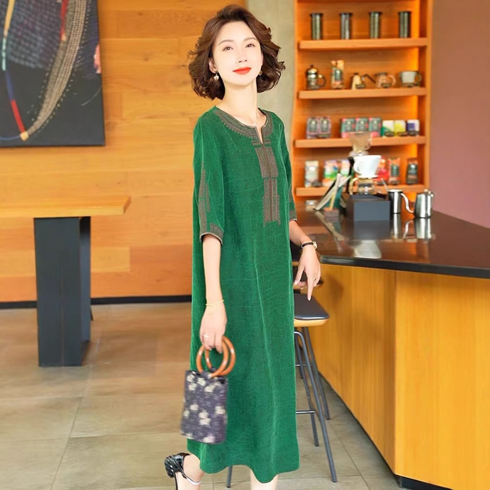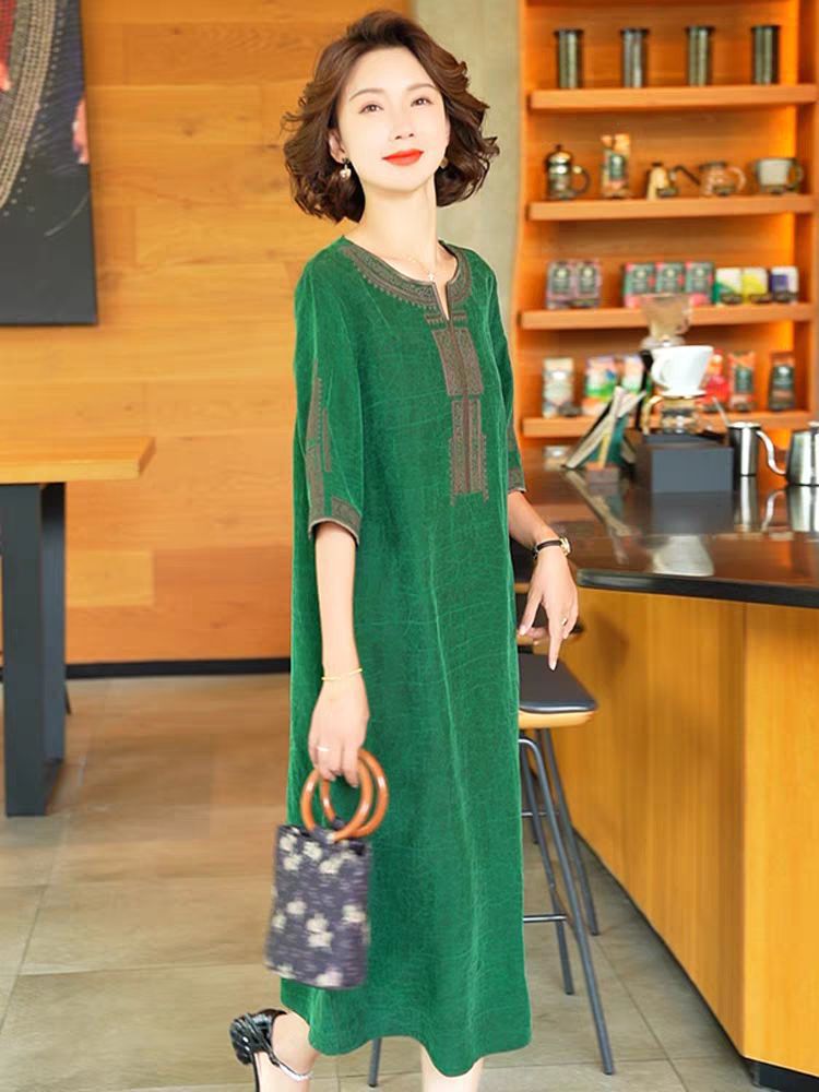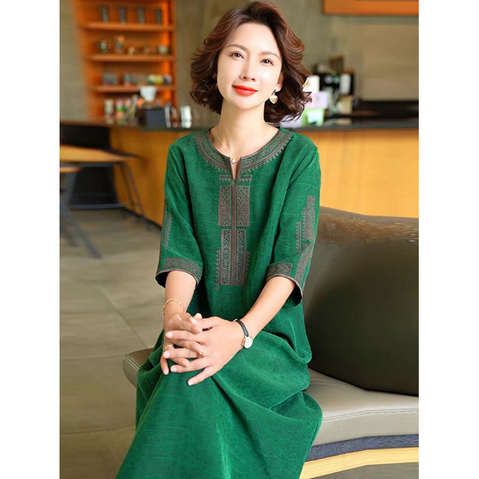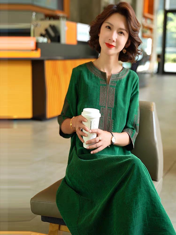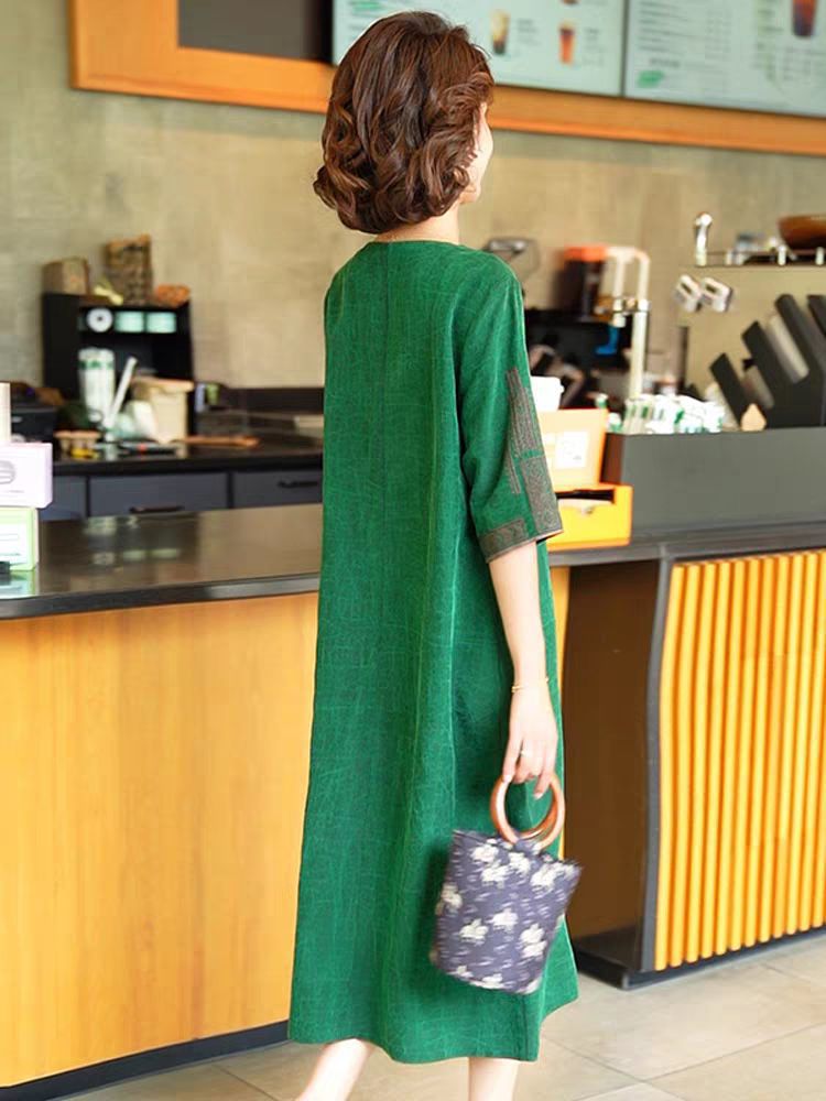 Новое китайское платье в национальном стиле с принтом, V-образным вырезом, для женщин, лето 2025, свободного кроя, стройнящее, повседневное, элегантное, длинная юбка