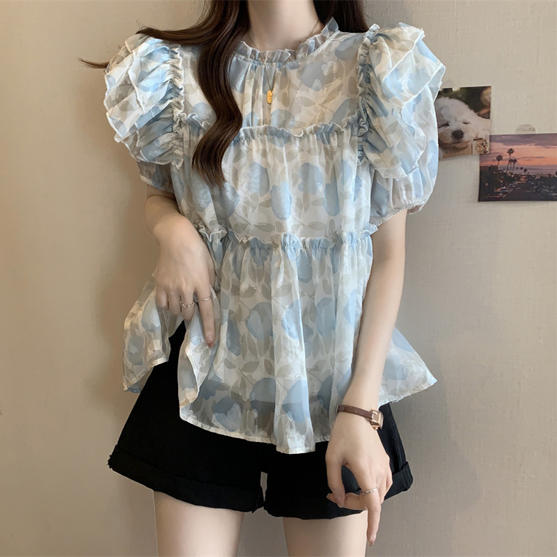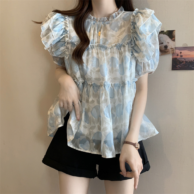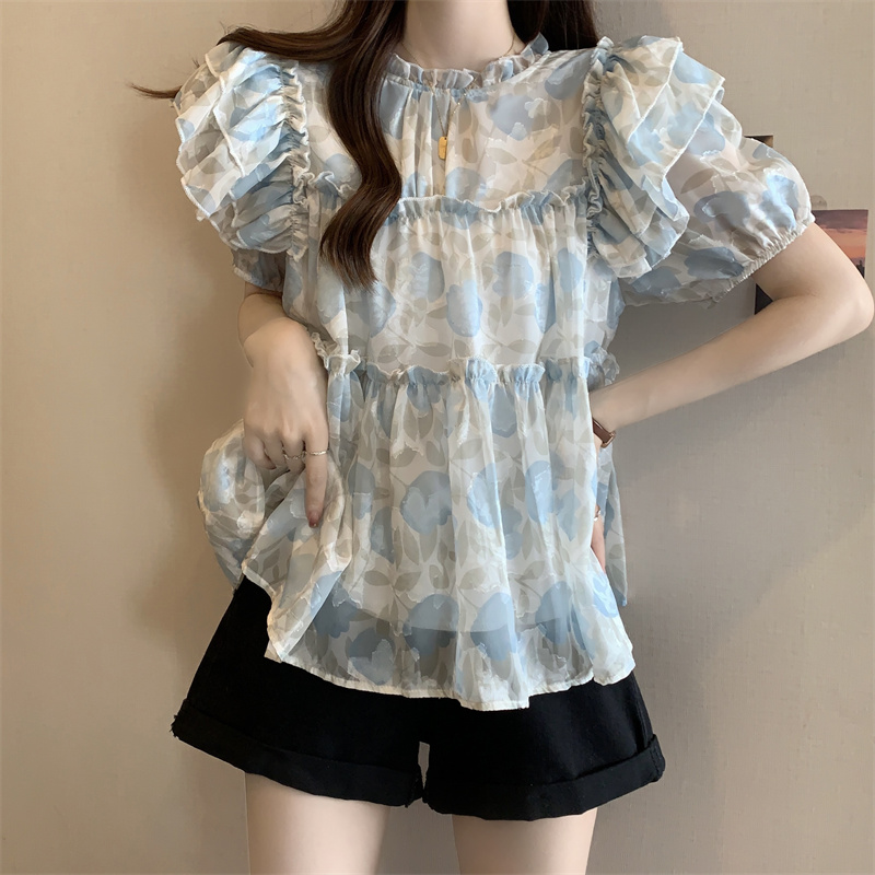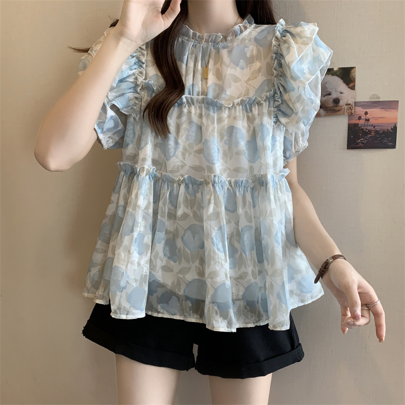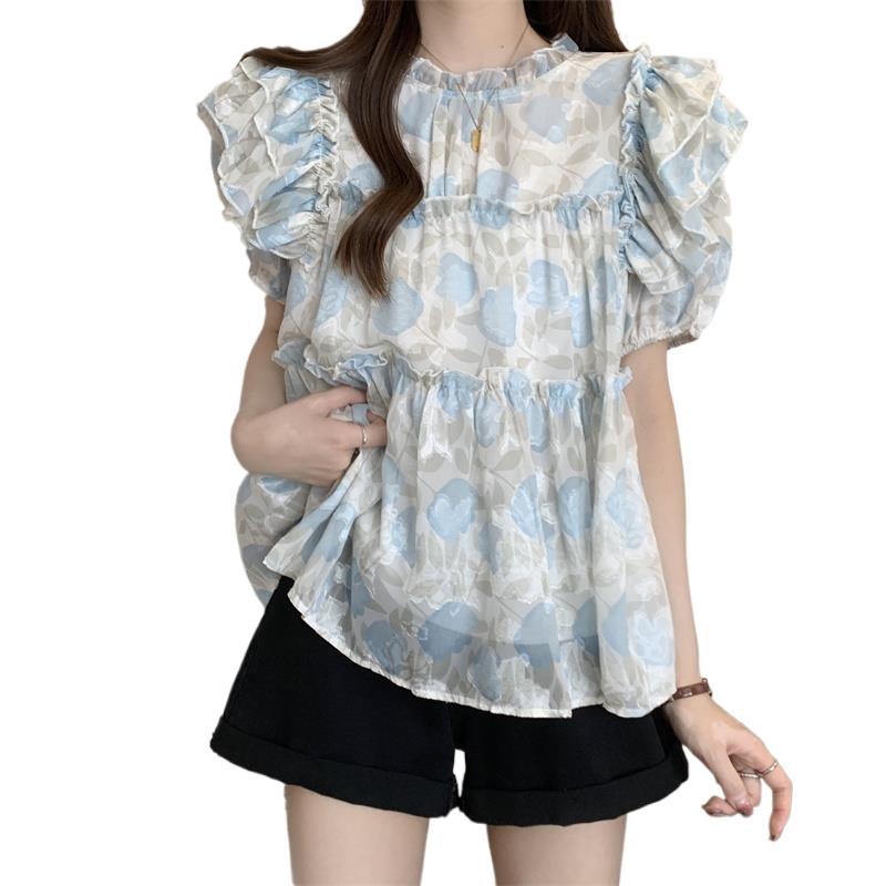 Женская шифоновая рубашка больших размеров с рюшами и пышными рукавами, женская летняя рубашка для полных мм, милый утягивающий топ с цветочным принтом