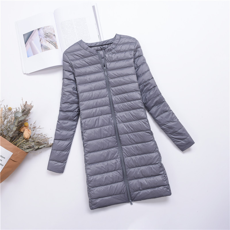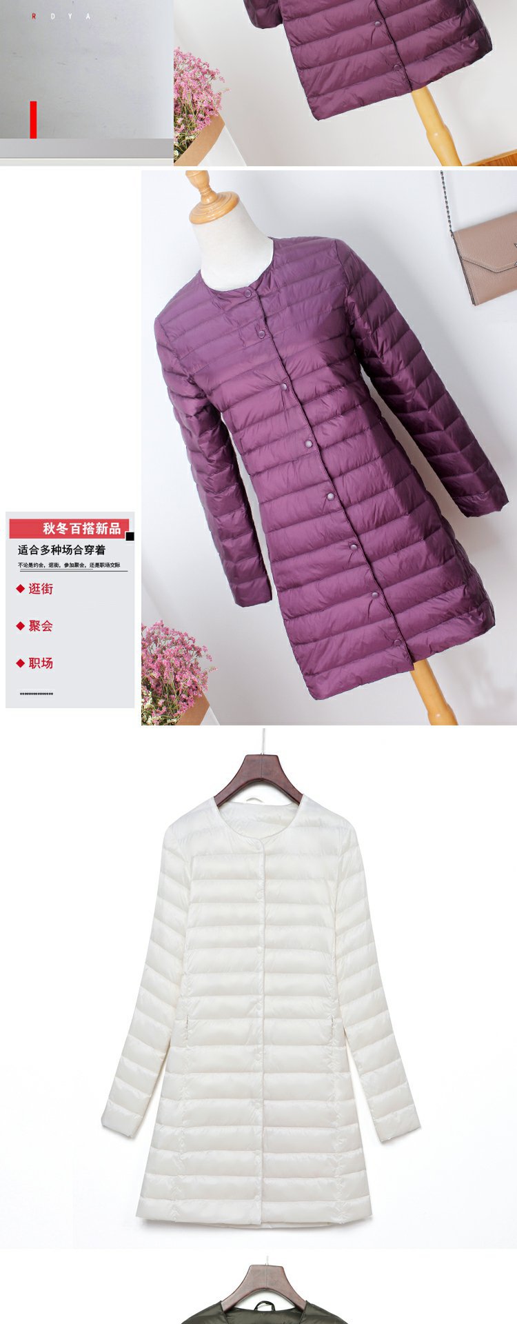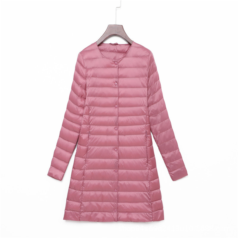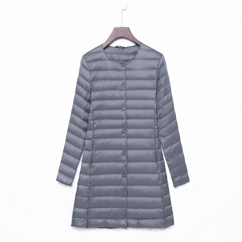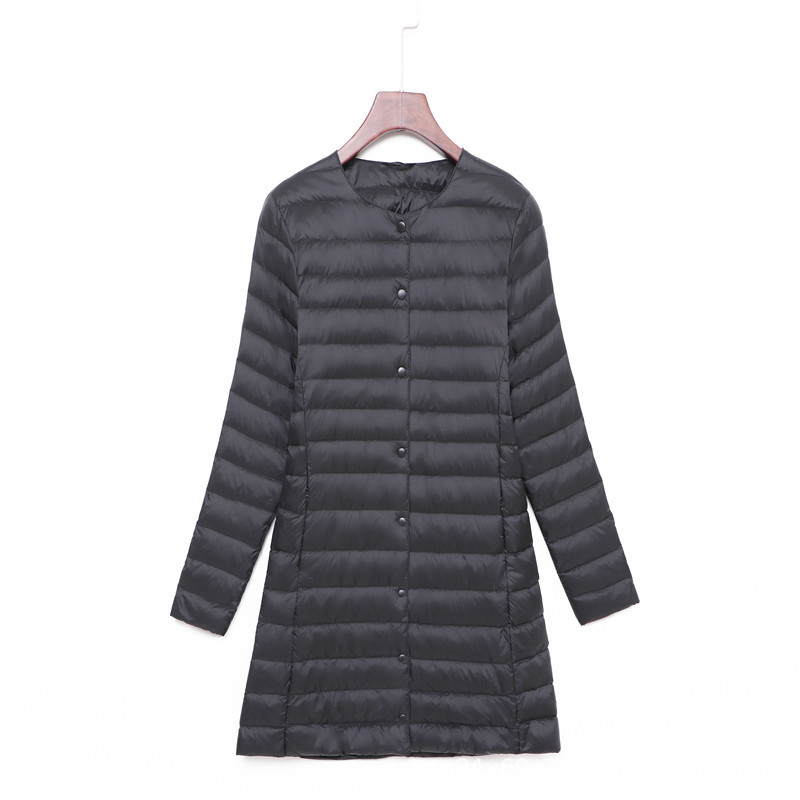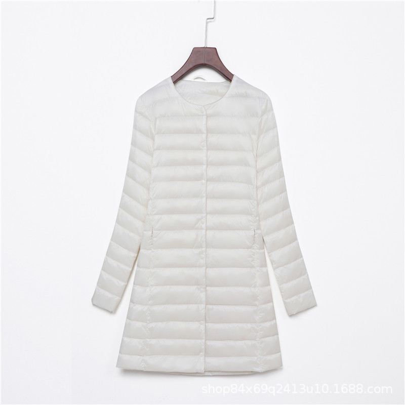 Новый женский пуховик, легкий, средней длины, модный корейский стиль, утягивающий белый утиный пух, кнопка, круглый вырез, теплое пальто с внутренней подкладкой.