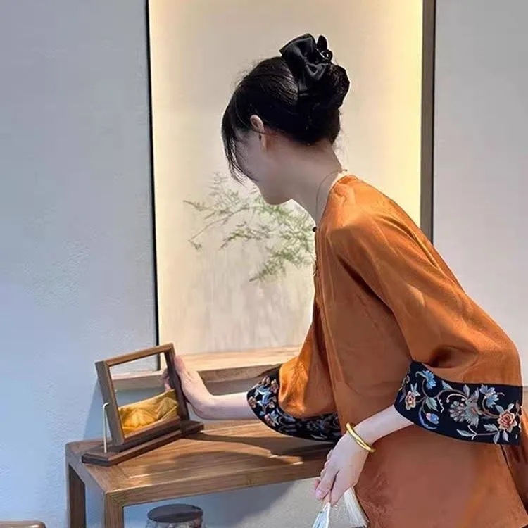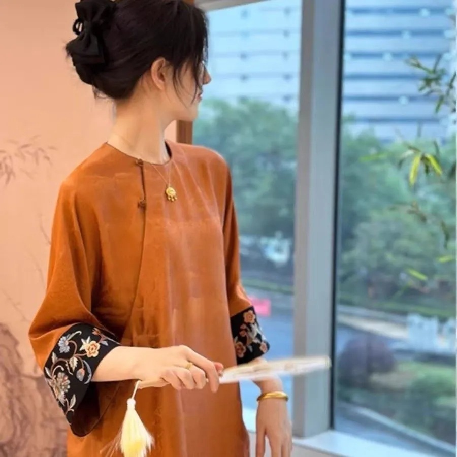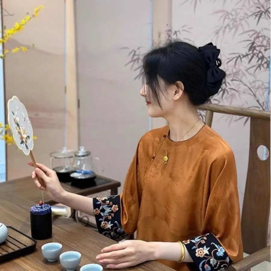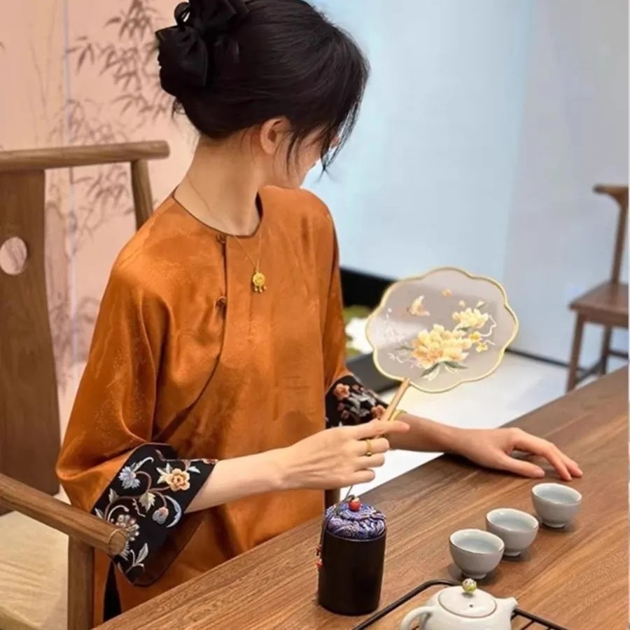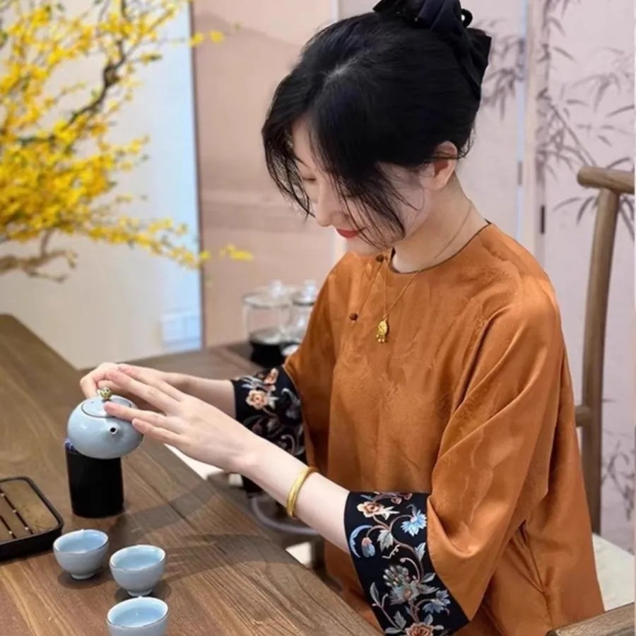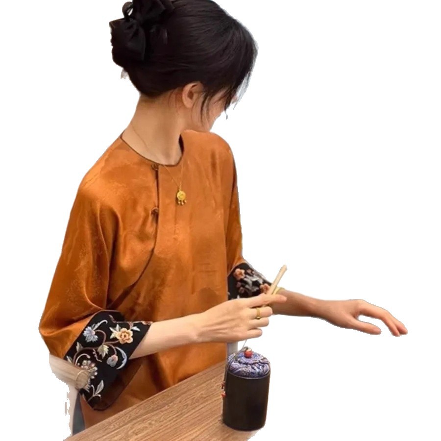 2025 новый новый китайский свободный элегантный топ с рукавом три четверти в стиле Тан, оранжевая жаккардовая рубашка для женщин на весну и лето
