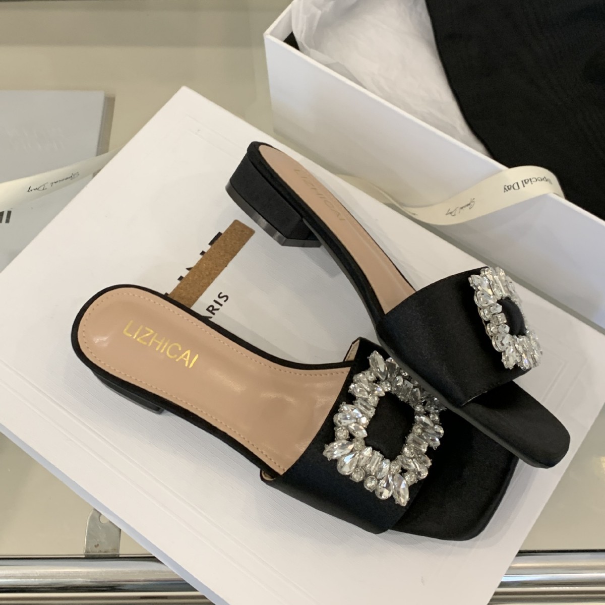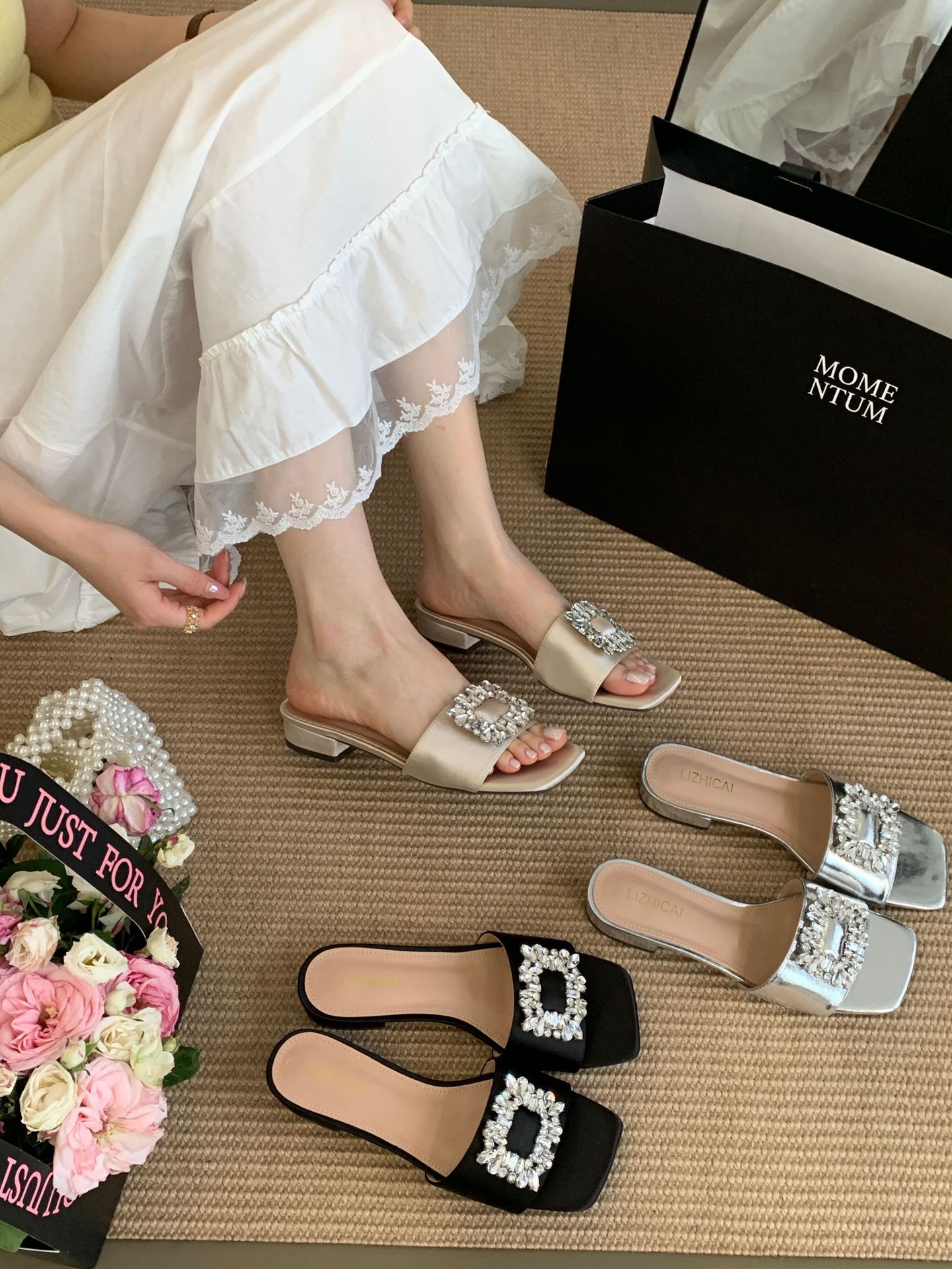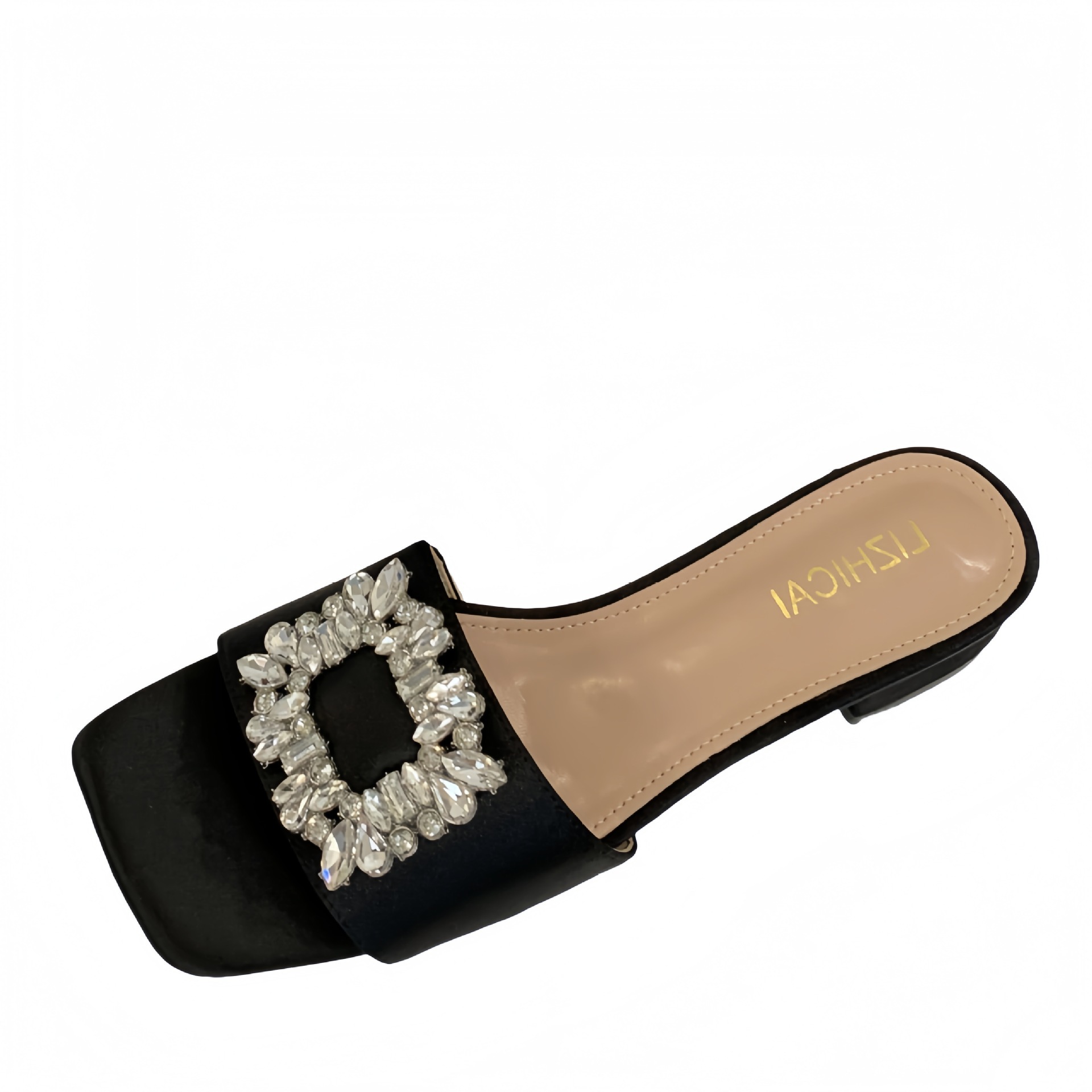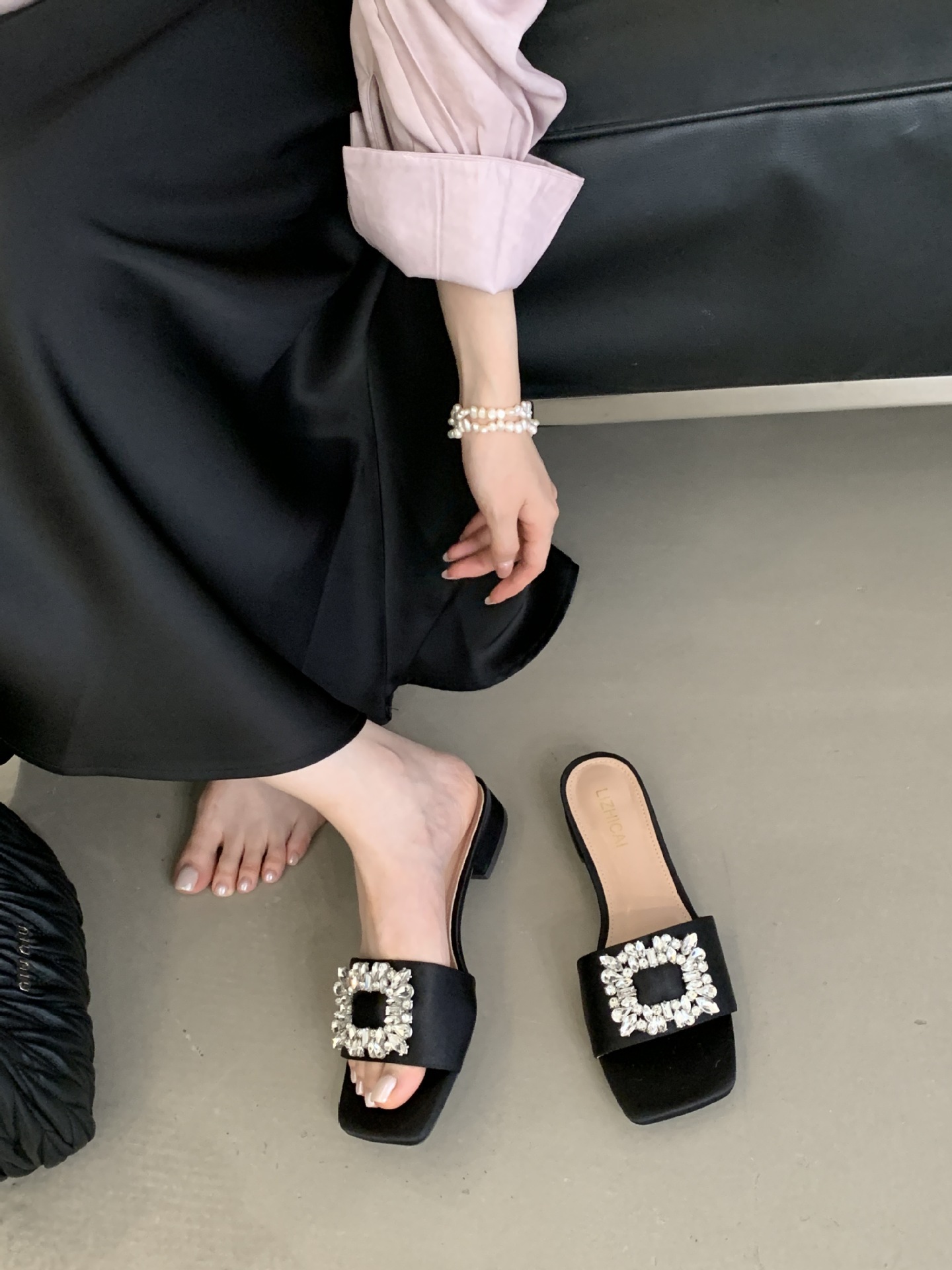 Женские босоножки на толстом каблуке 300-3~см, французский дизайн, высококачественные стразы, квадратный открытый носок, для улицы, лето 2025, новая модель