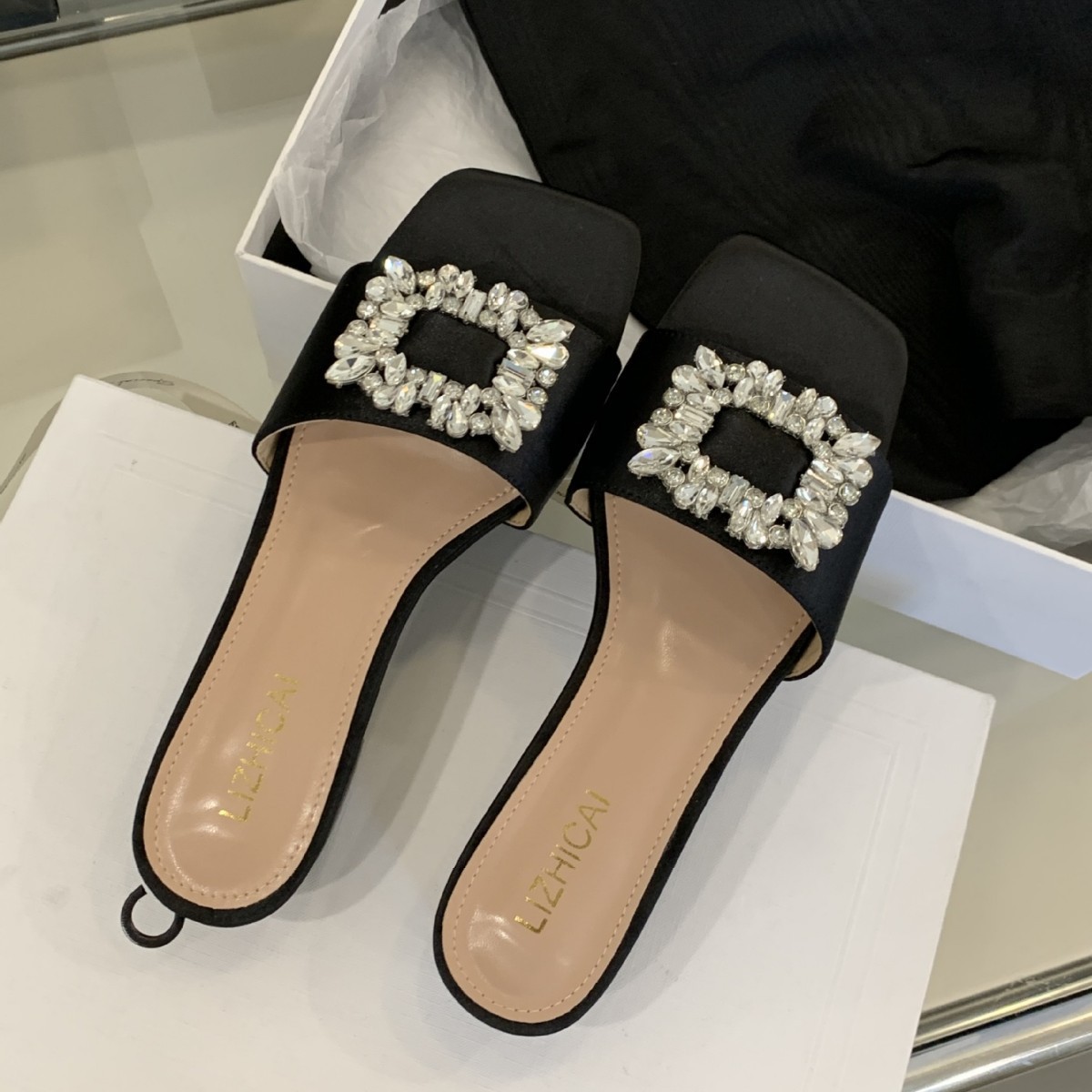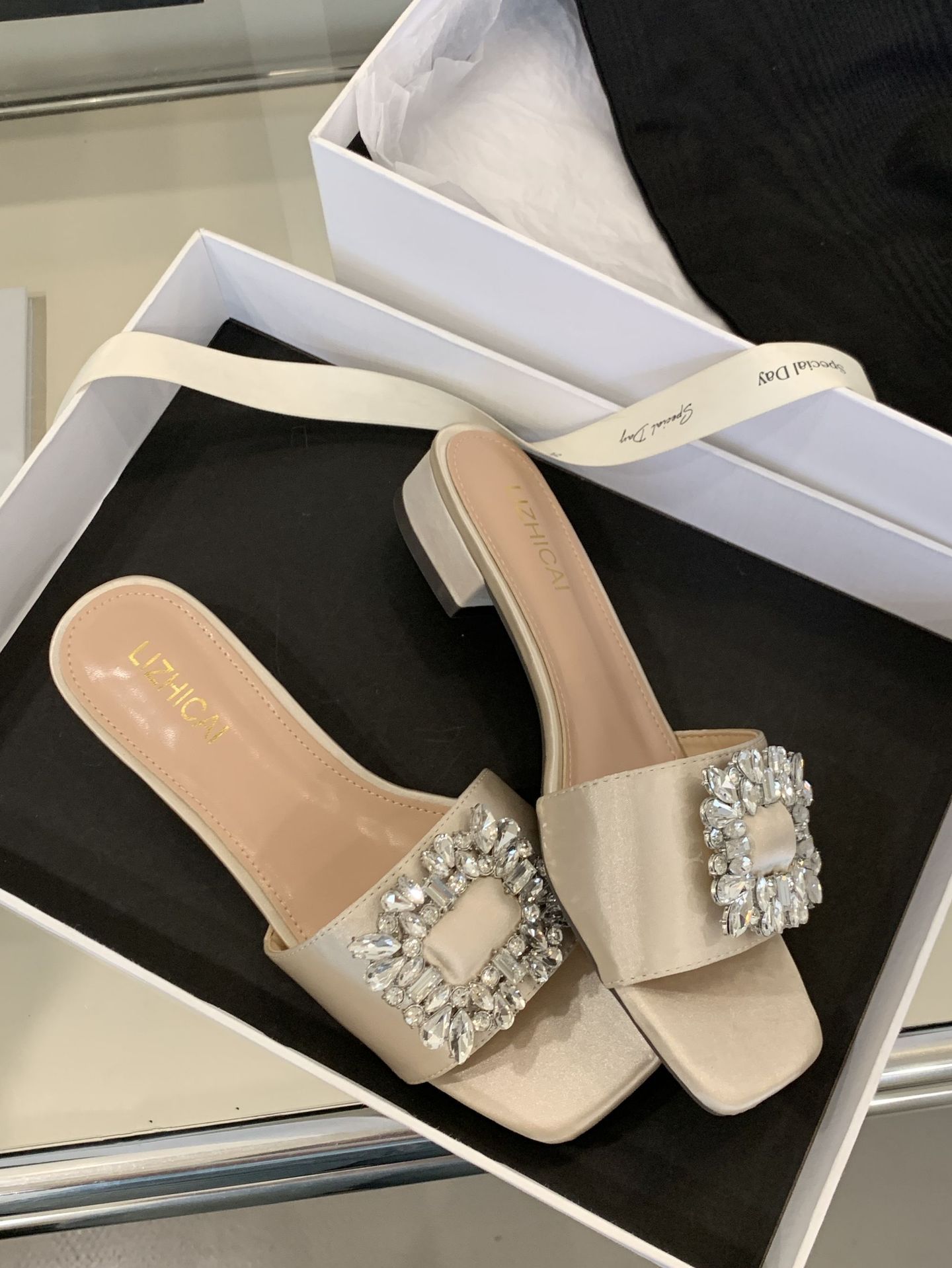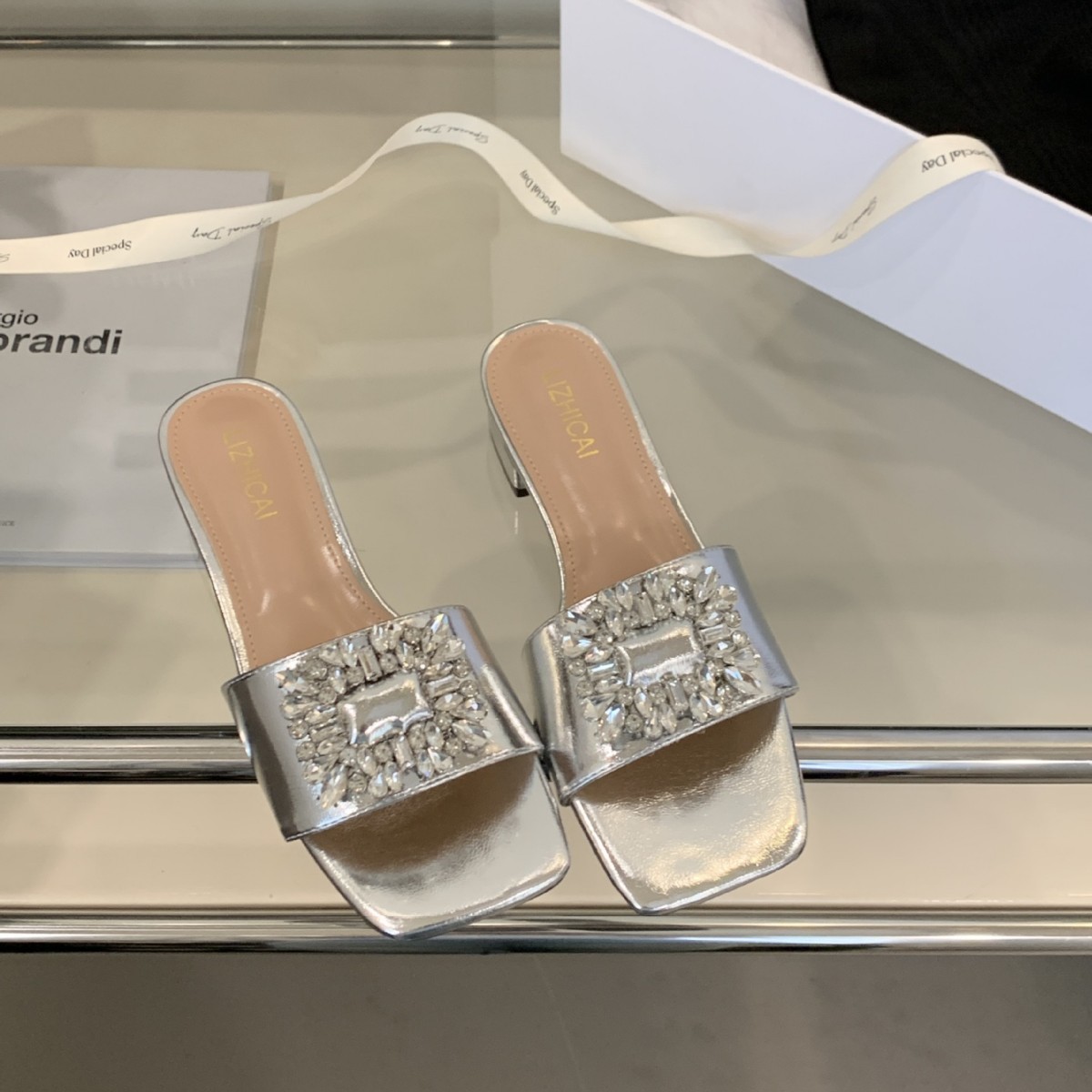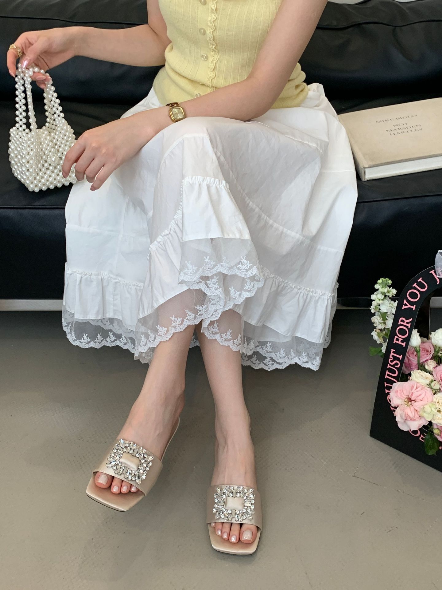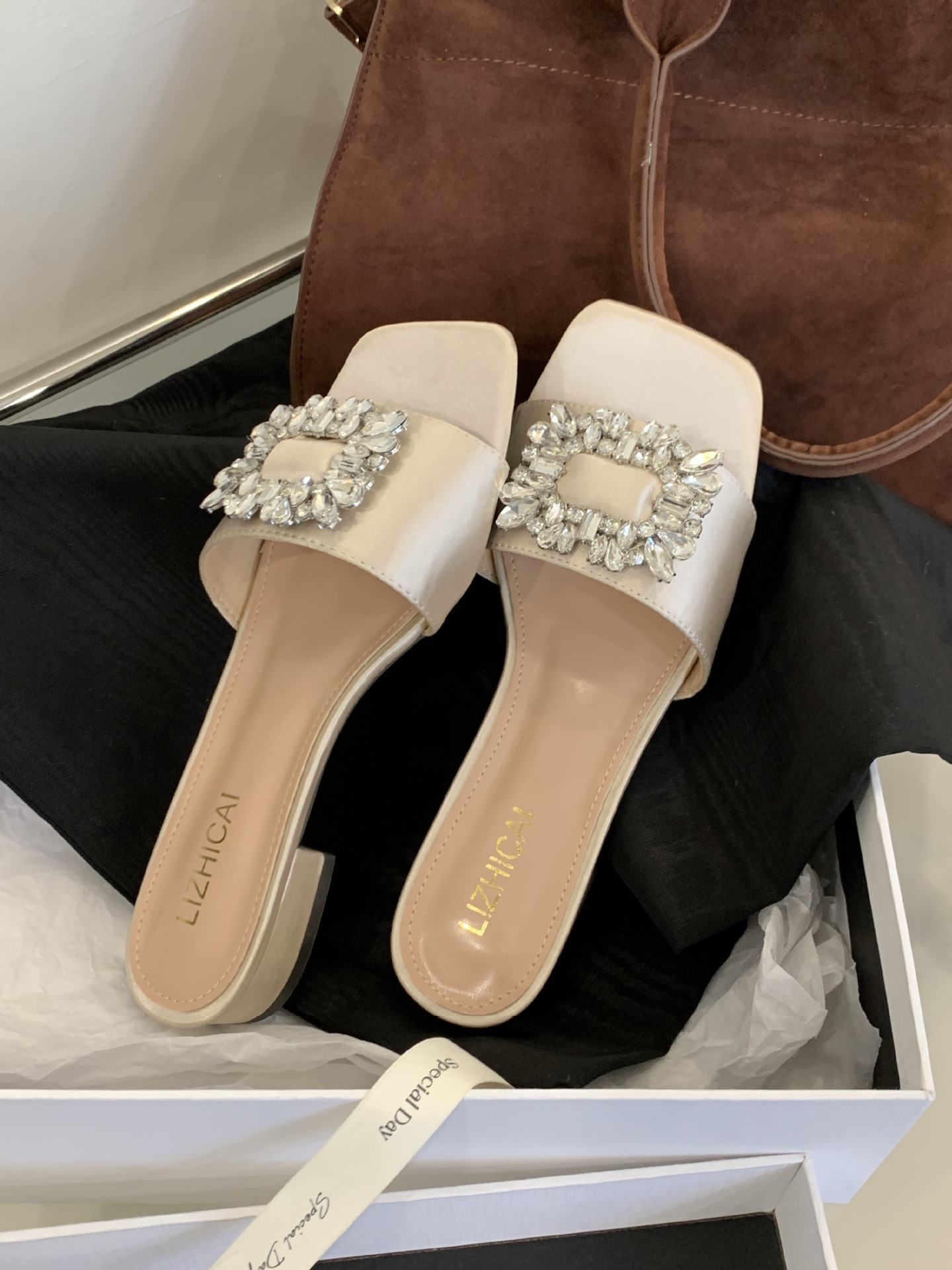 Женские босоножки на толстом каблуке 300-3~см, французский дизайн, высококачественные стразы, квадратный открытый носок, для улицы, лето 2025, новая модель