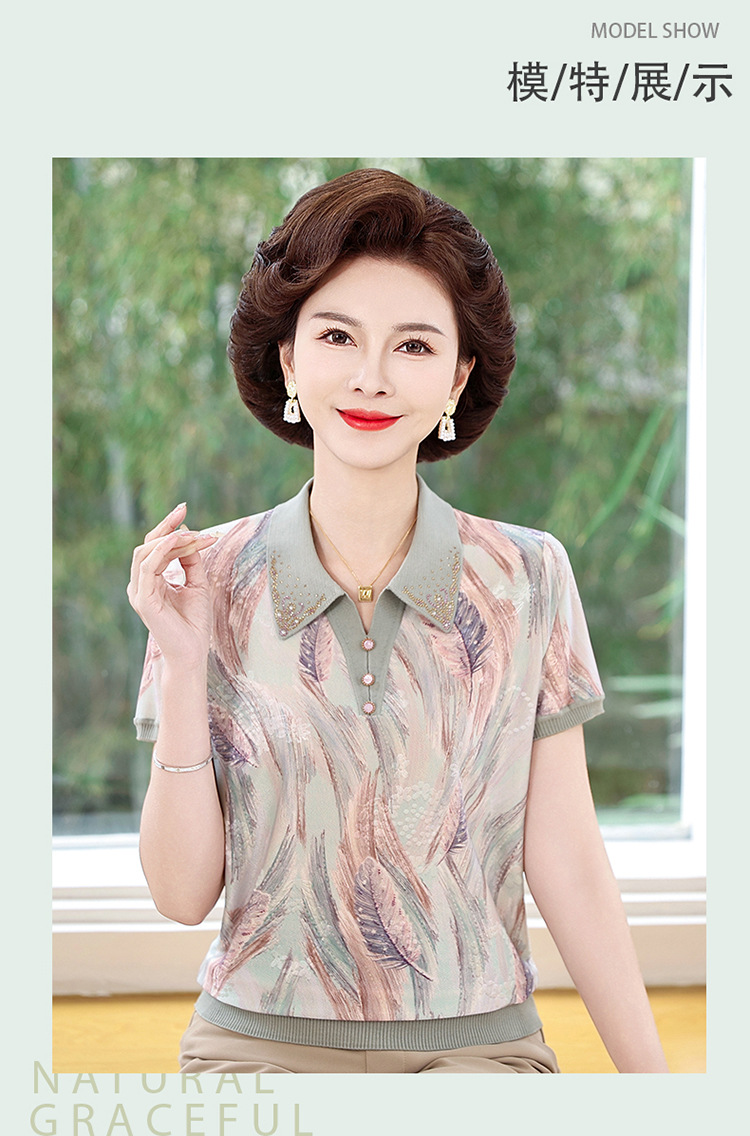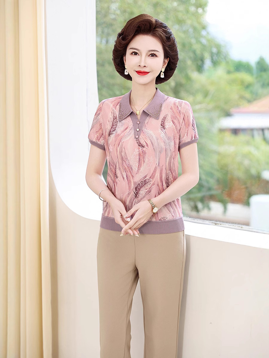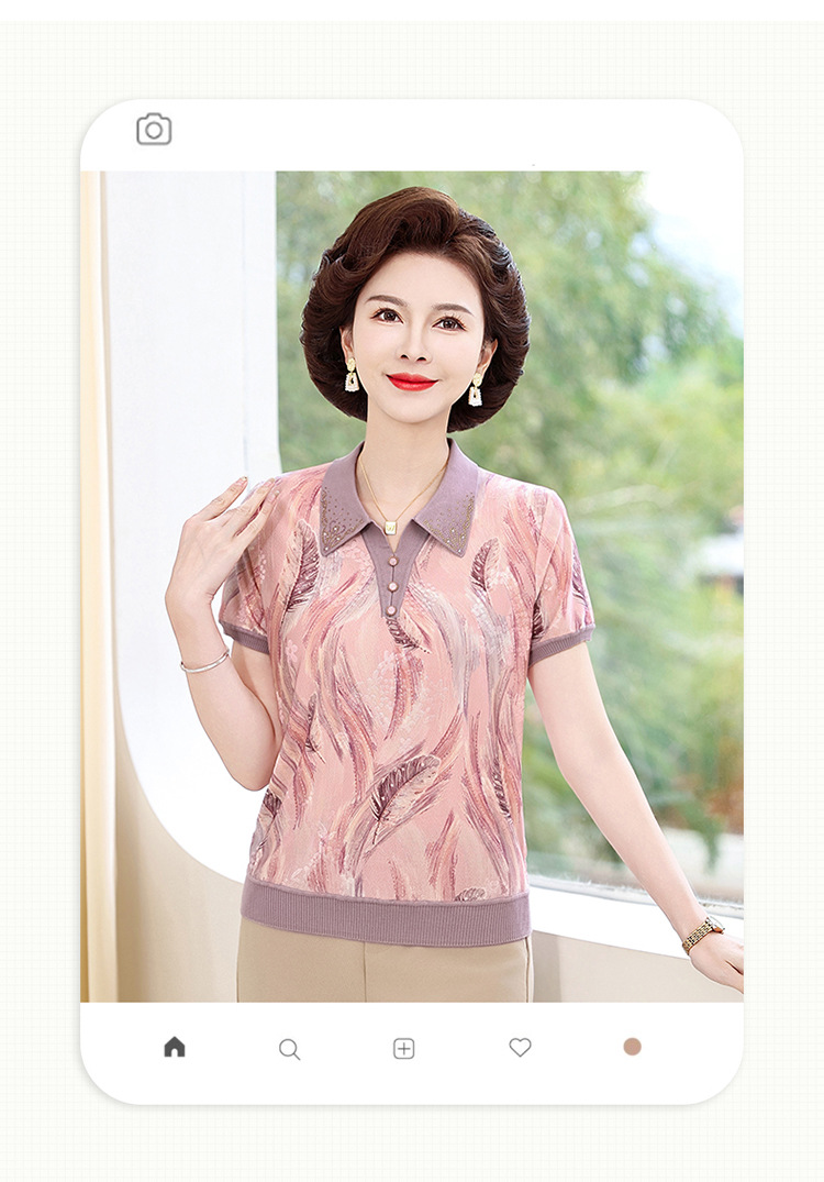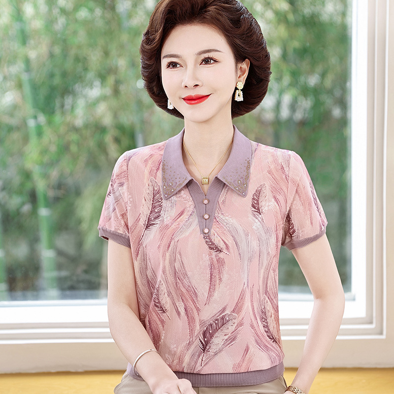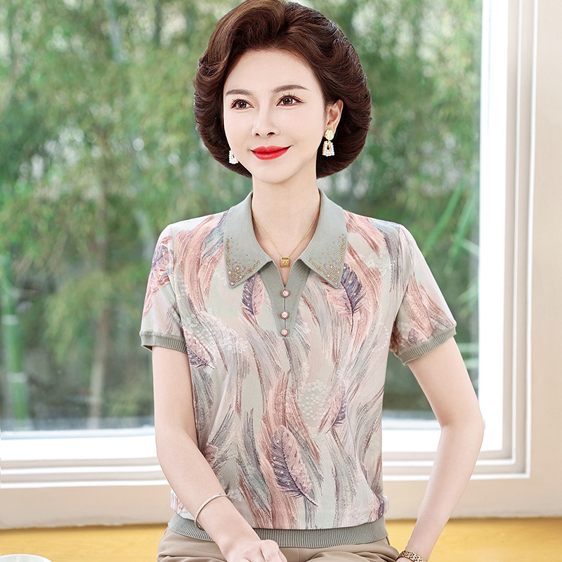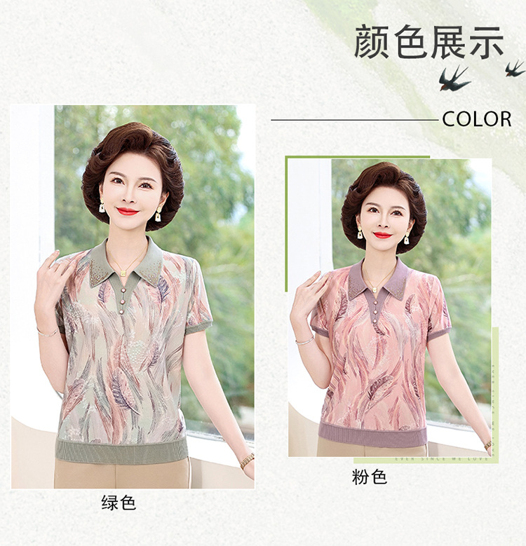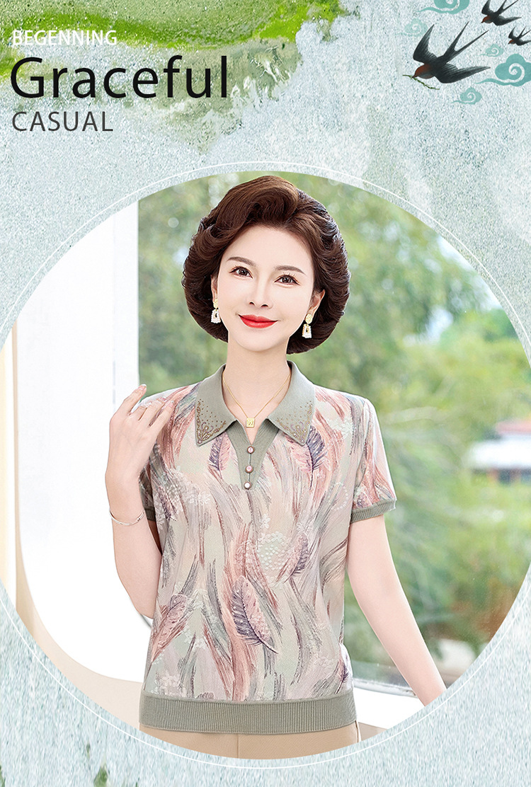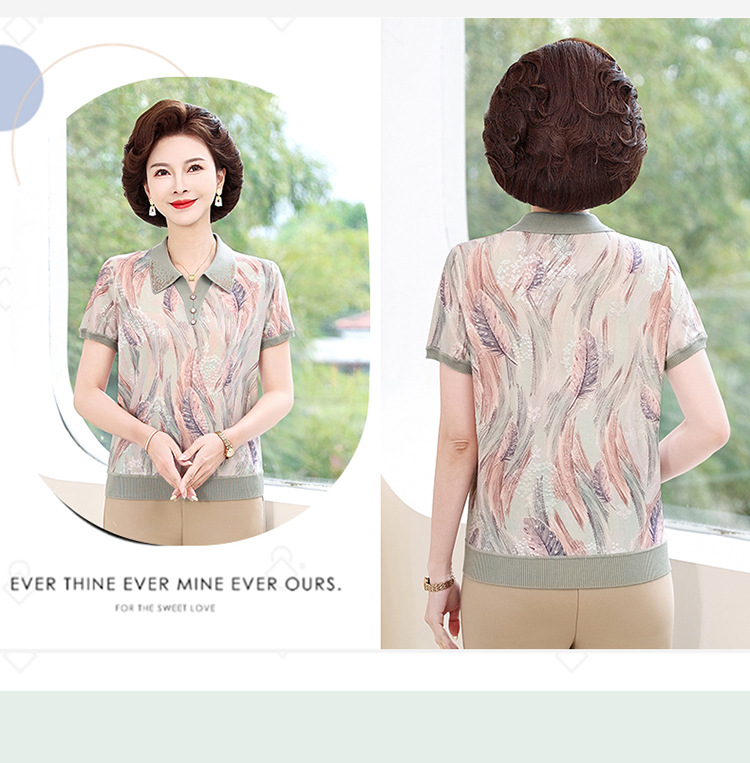 Новая летняя футболка с короткими рукавами и лацканами для мамы, модный тонкий топ из ледяного шелка большого размера для женщин среднего и пожилого возраста с принтом
