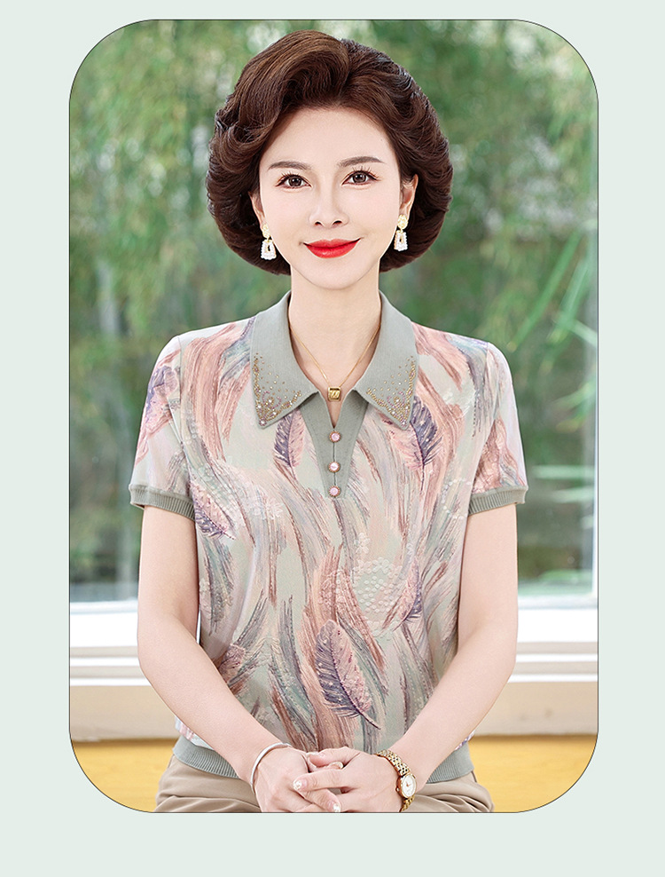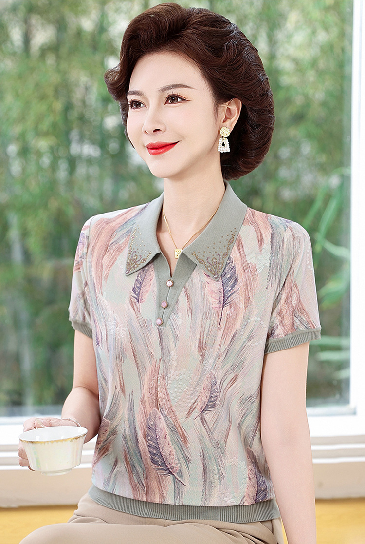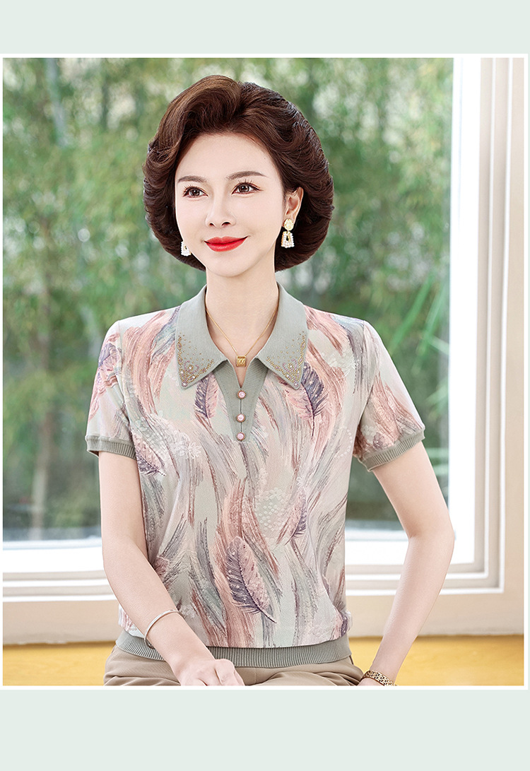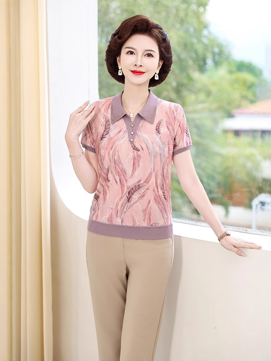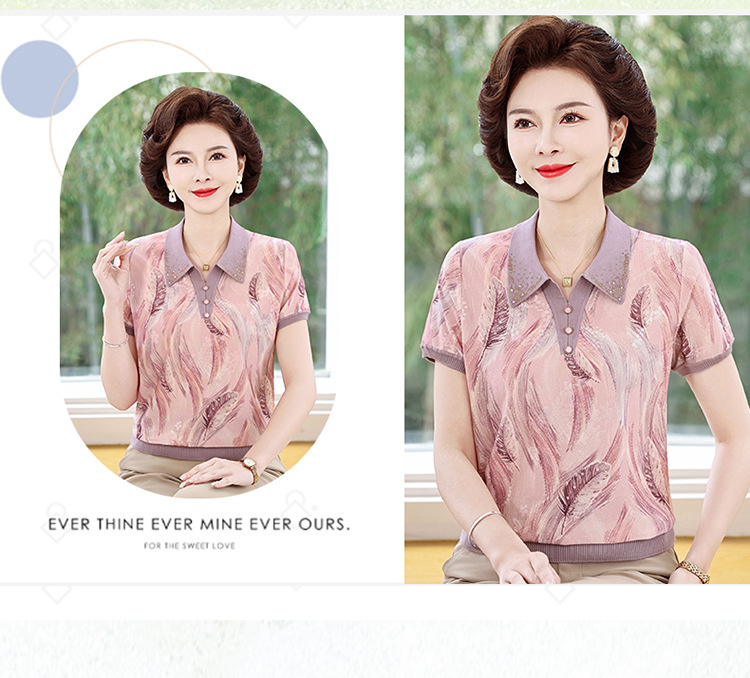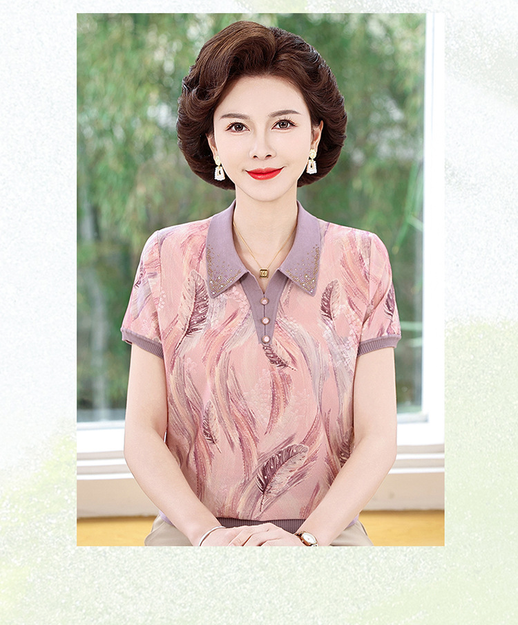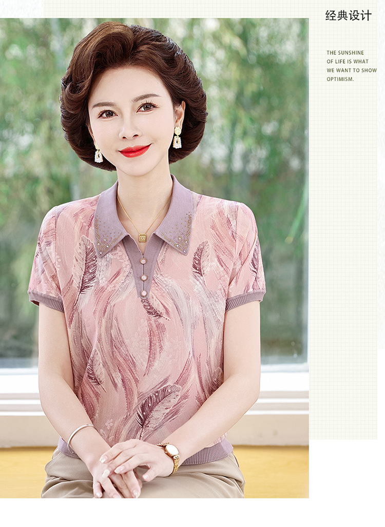 Новая летняя футболка с короткими рукавами и лацканами для мамы, модный тонкий топ из ледяного шелка большого размера для женщин среднего и пожилого возраста с принтом
