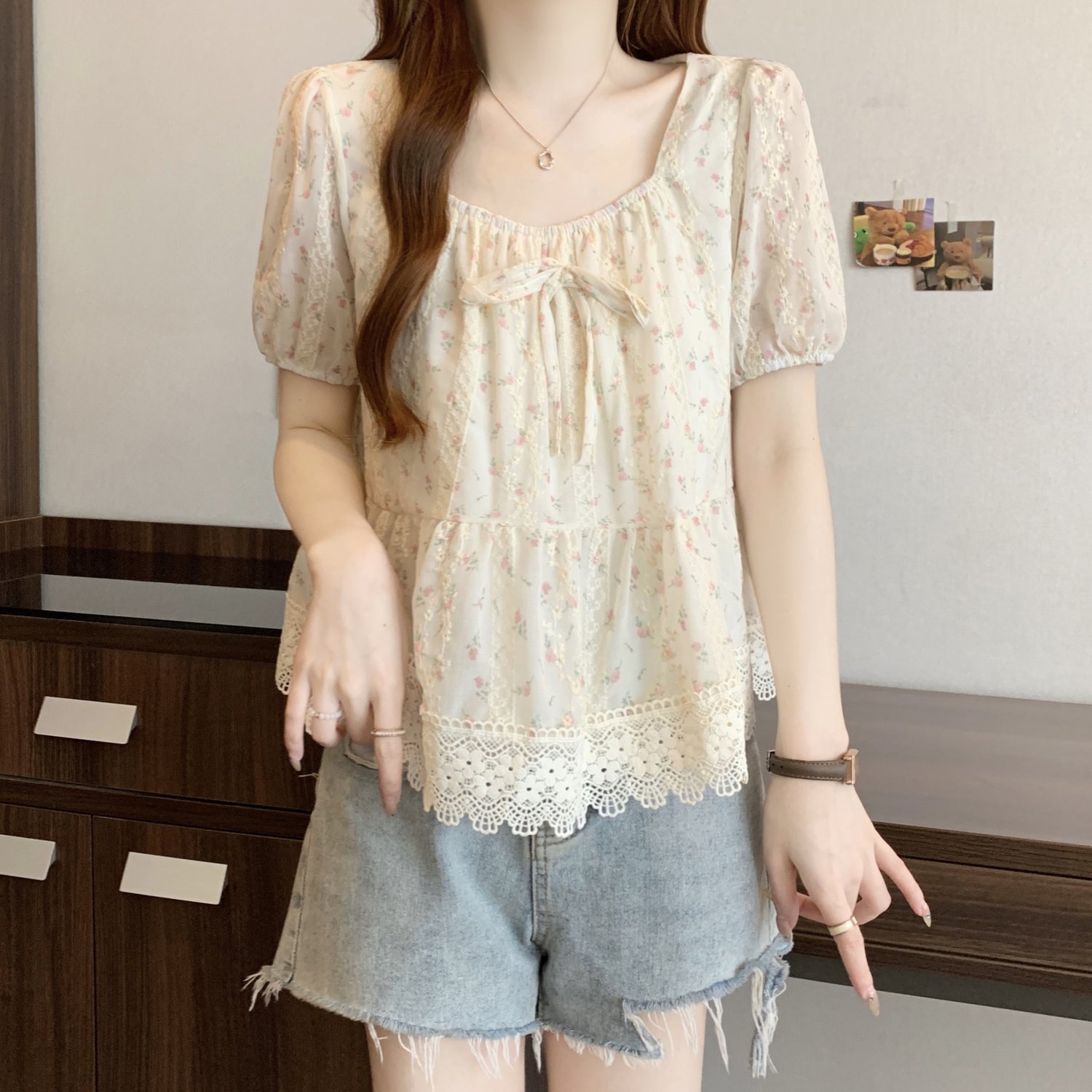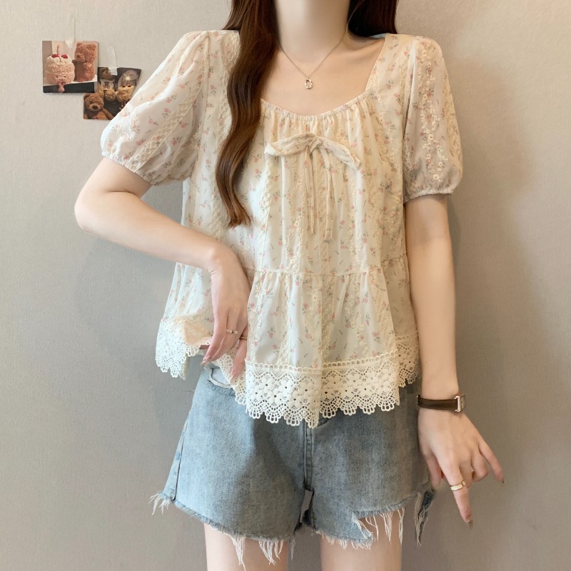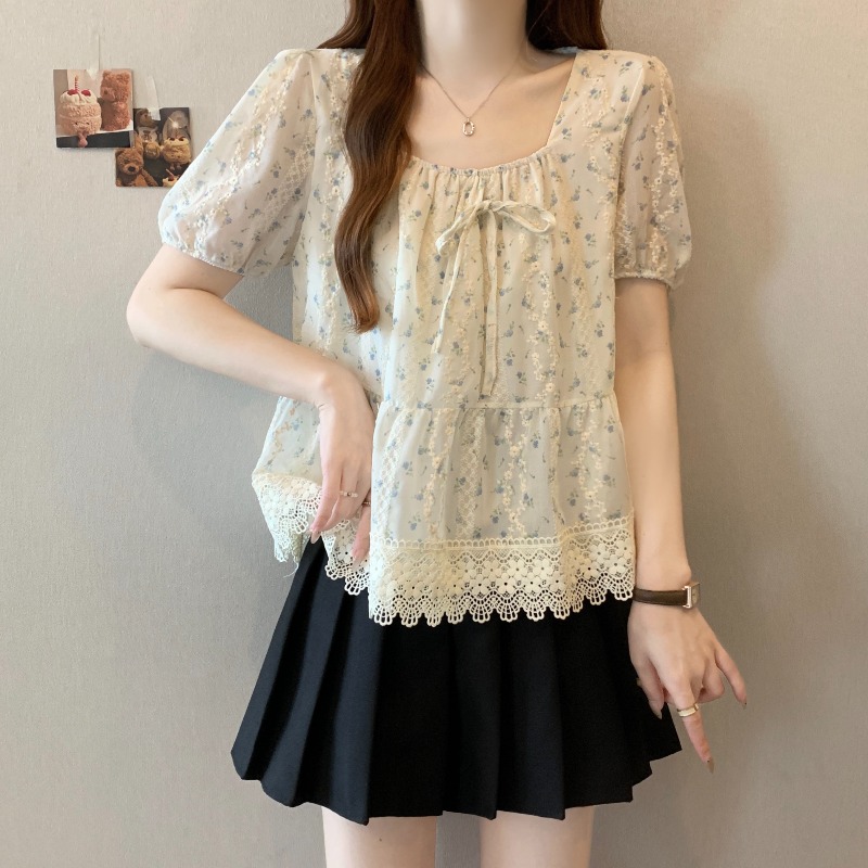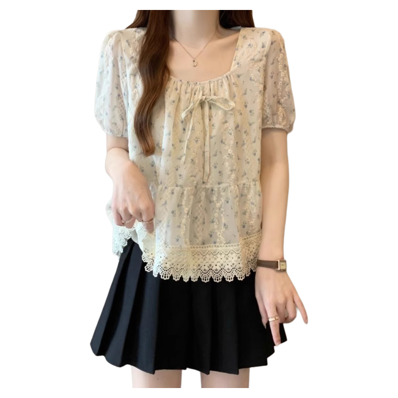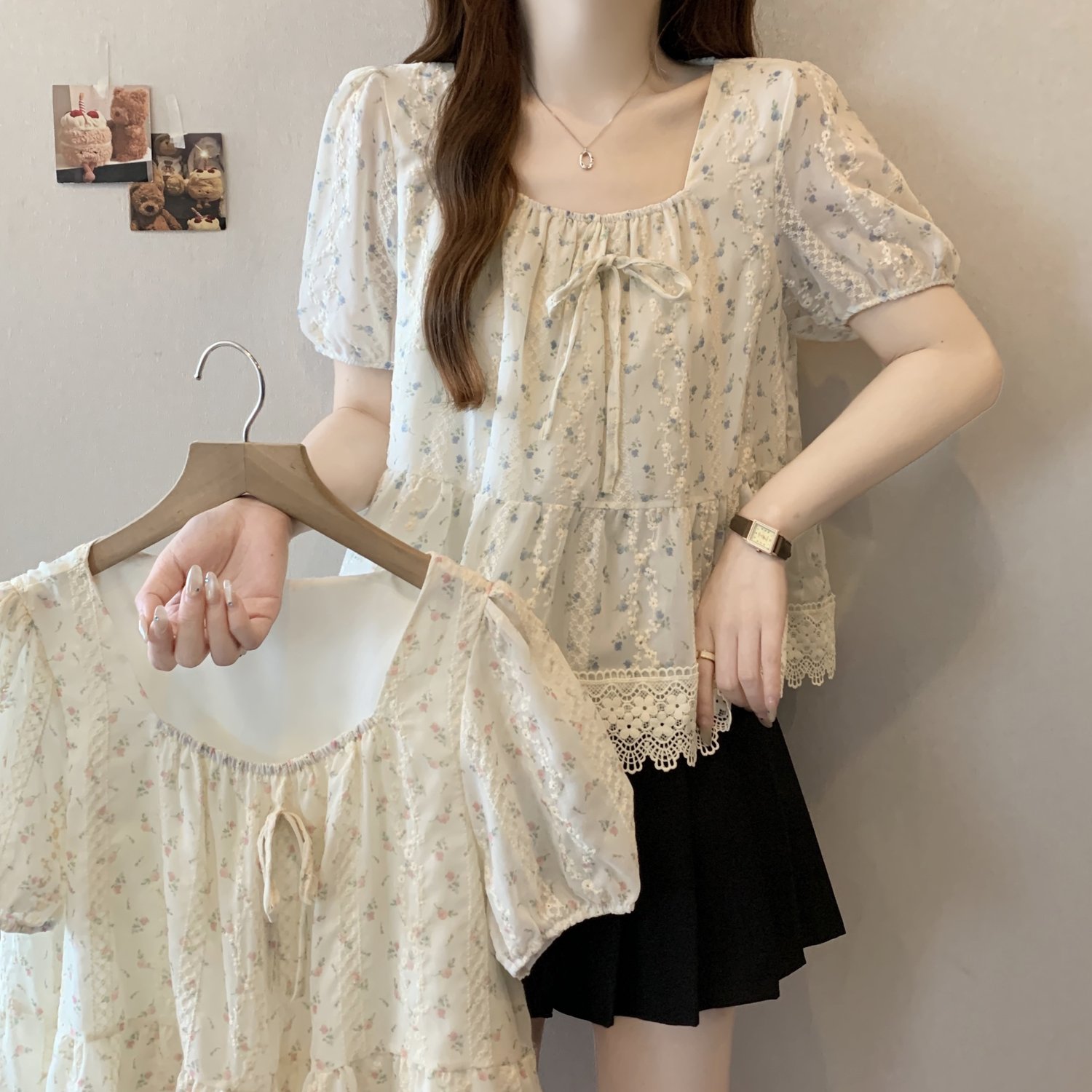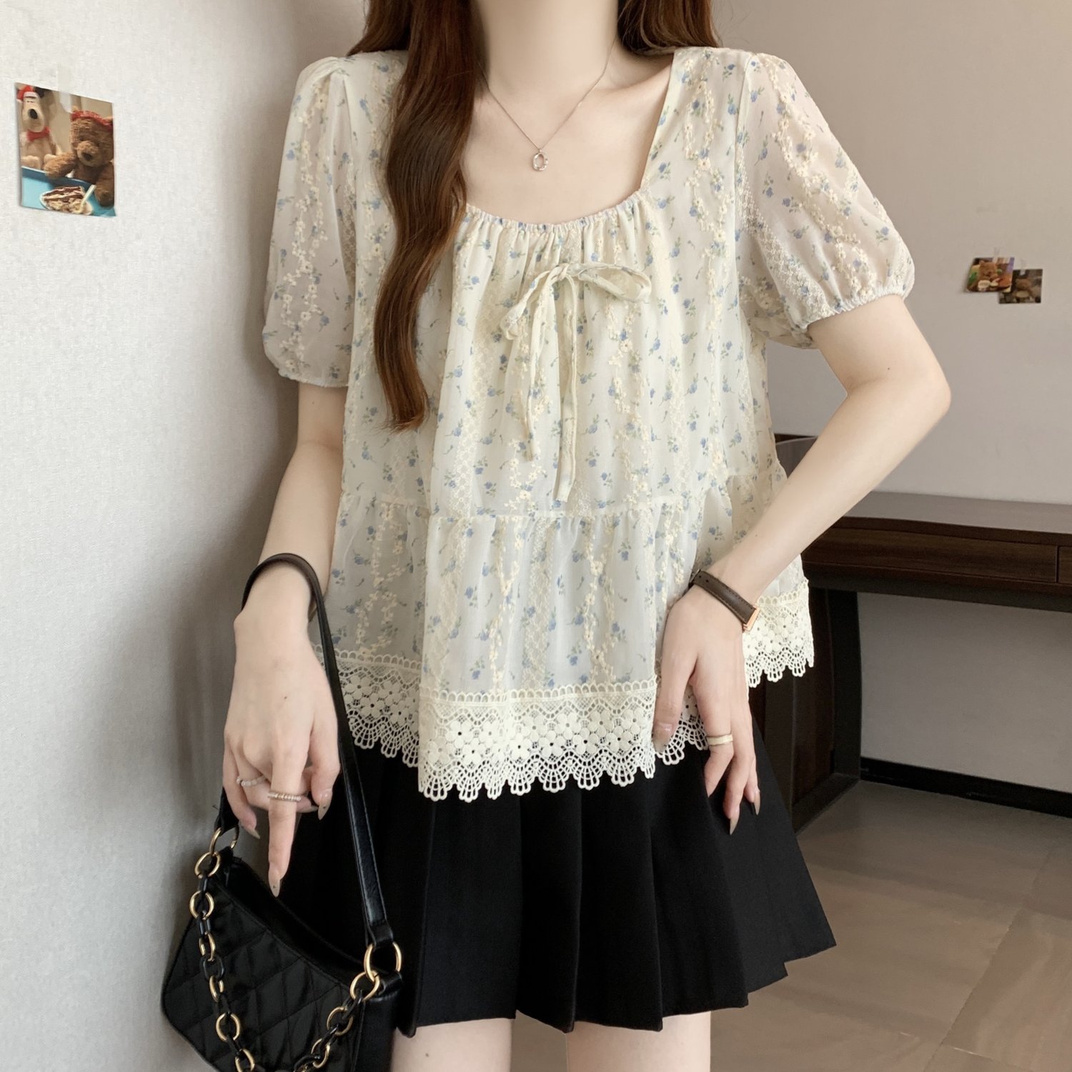 Французская шифоновая рубашка с квадратным вырезом и цветочным принтом и короткими рукавами для женщин, летняя рубашка больших размеров, красивый топ-кукла, закрывающий живот