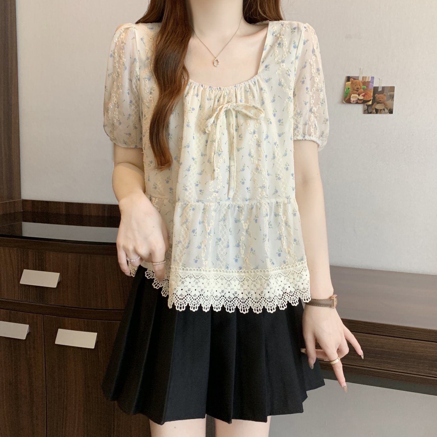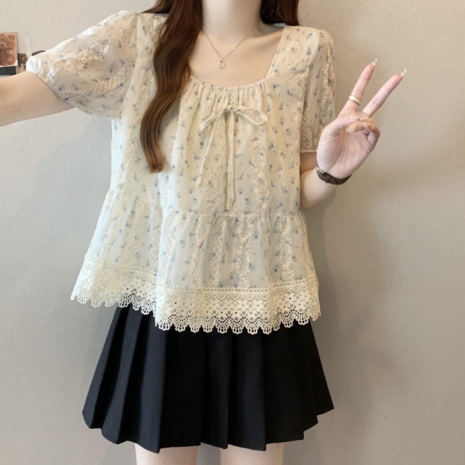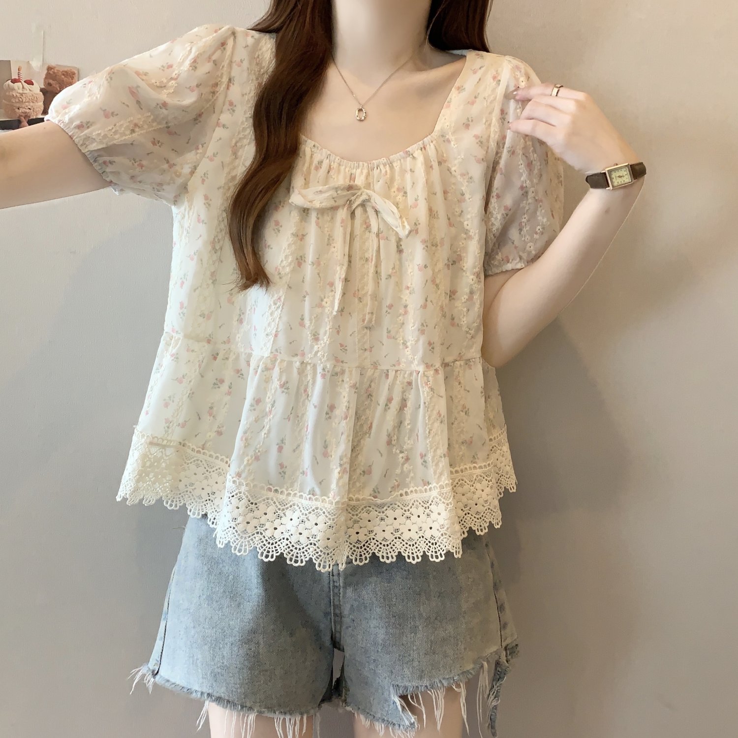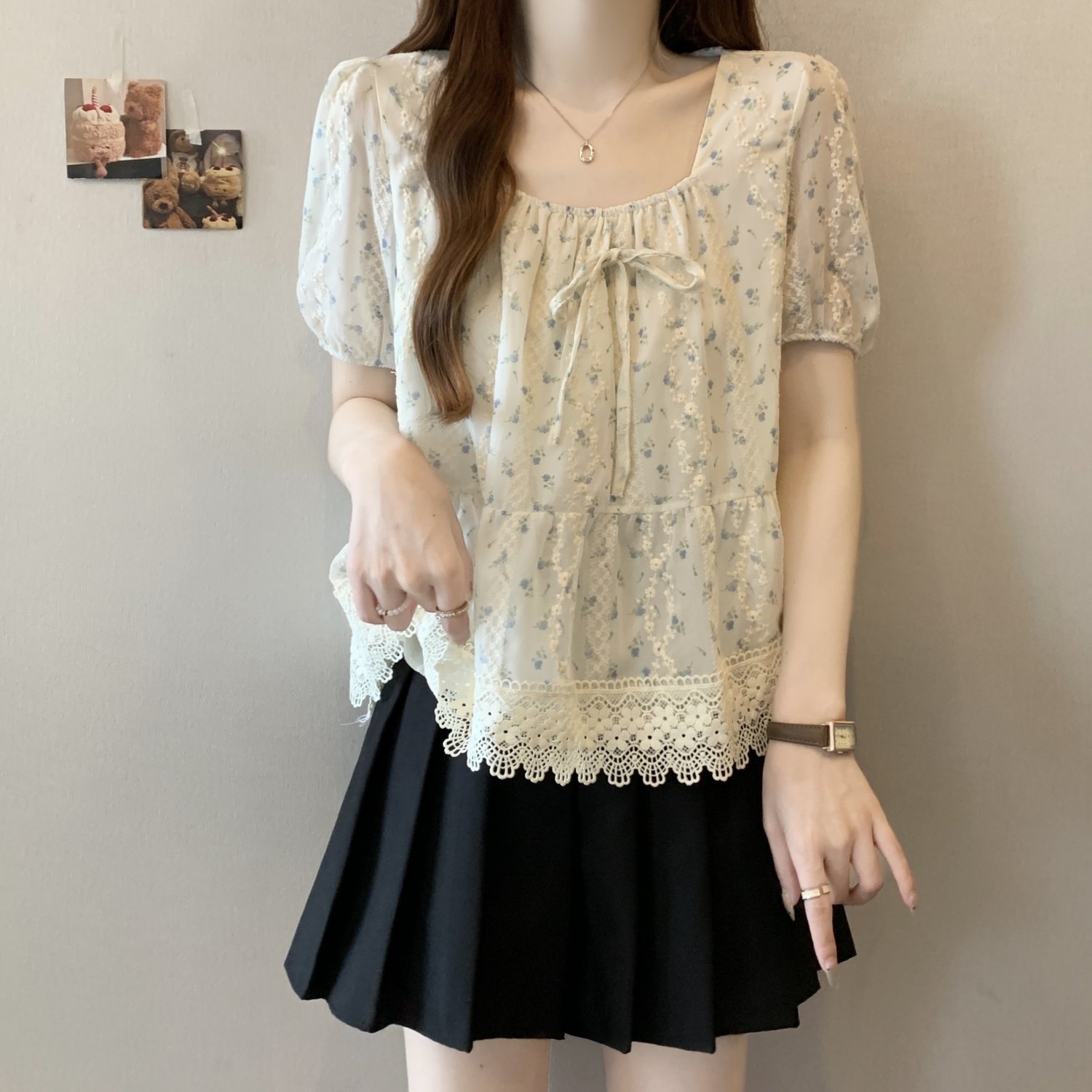 Французская шифоновая рубашка с квадратным вырезом и цветочным принтом и короткими рукавами для женщин, летняя рубашка больших размеров, красивый топ-кукла, закрывающий живот