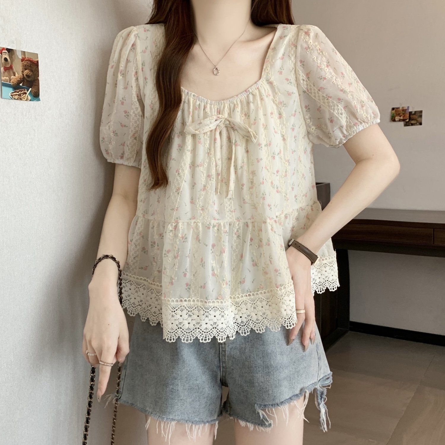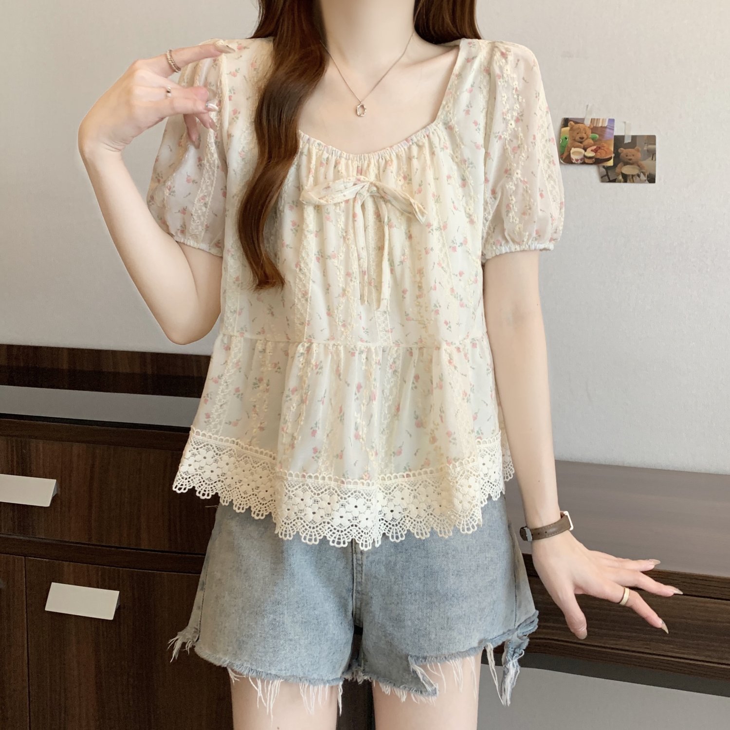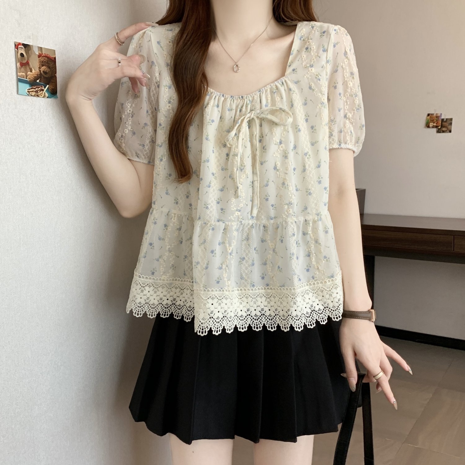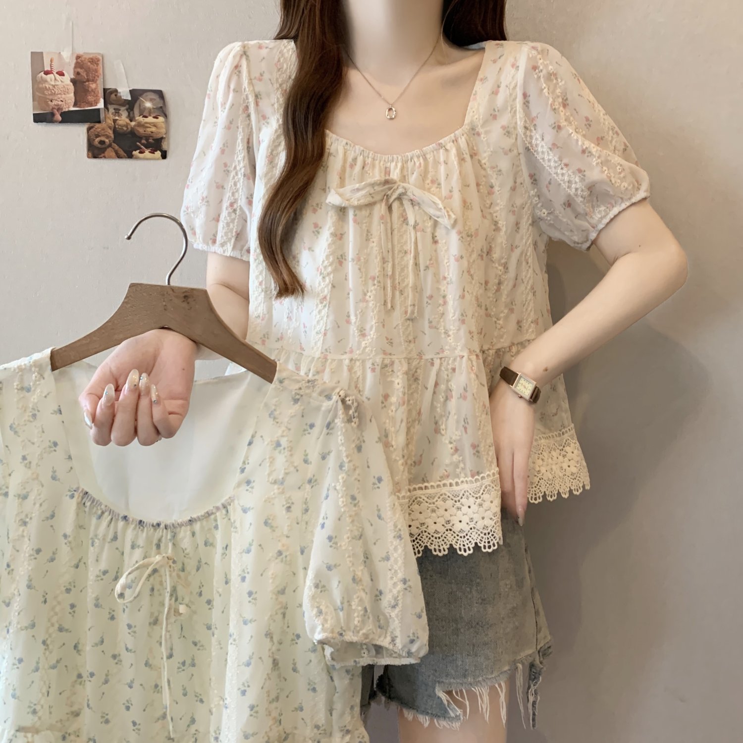 Французская шифоновая рубашка с квадратным вырезом и цветочным принтом и короткими рукавами для женщин, летняя рубашка больших размеров, красивый топ-кукла, закрывающий живот
