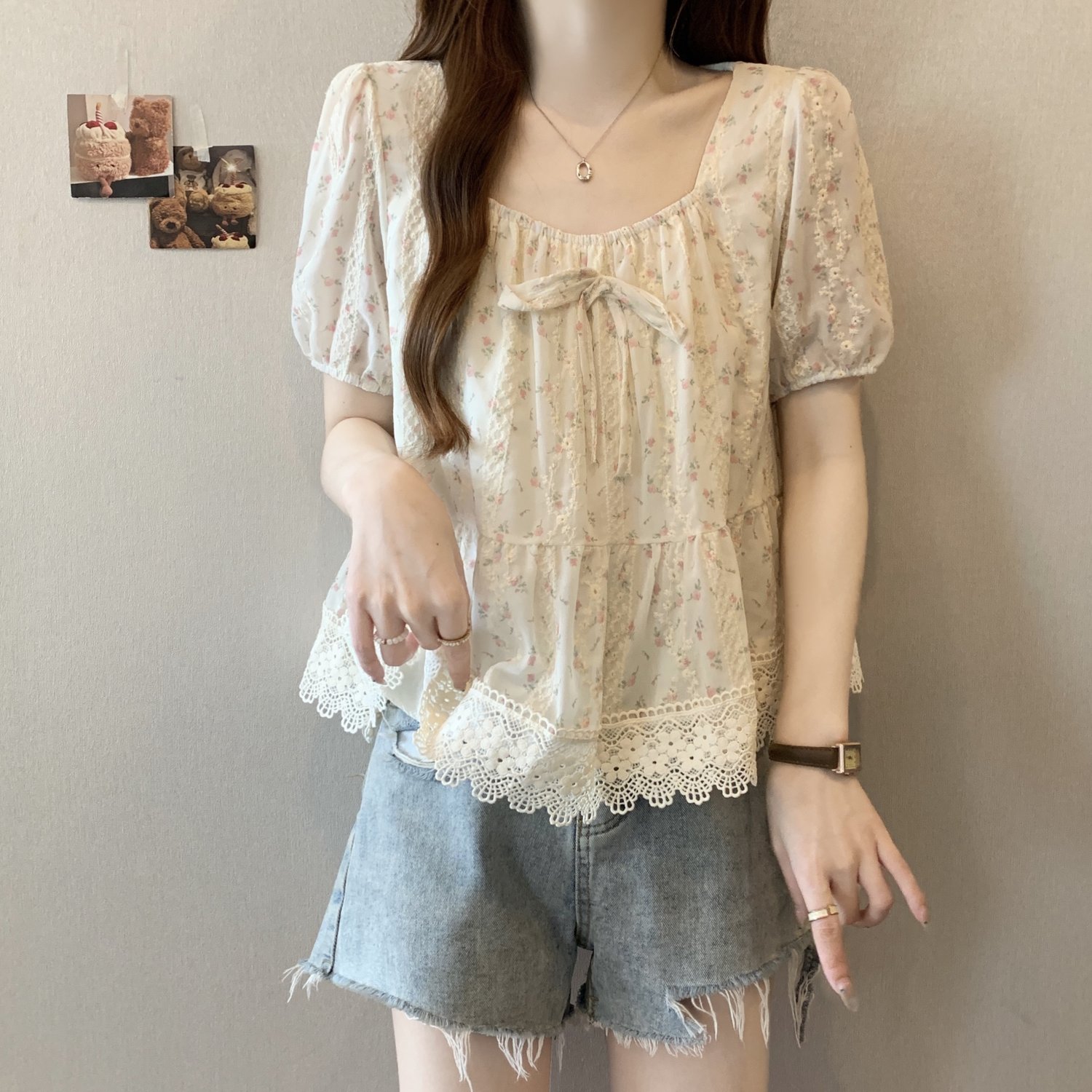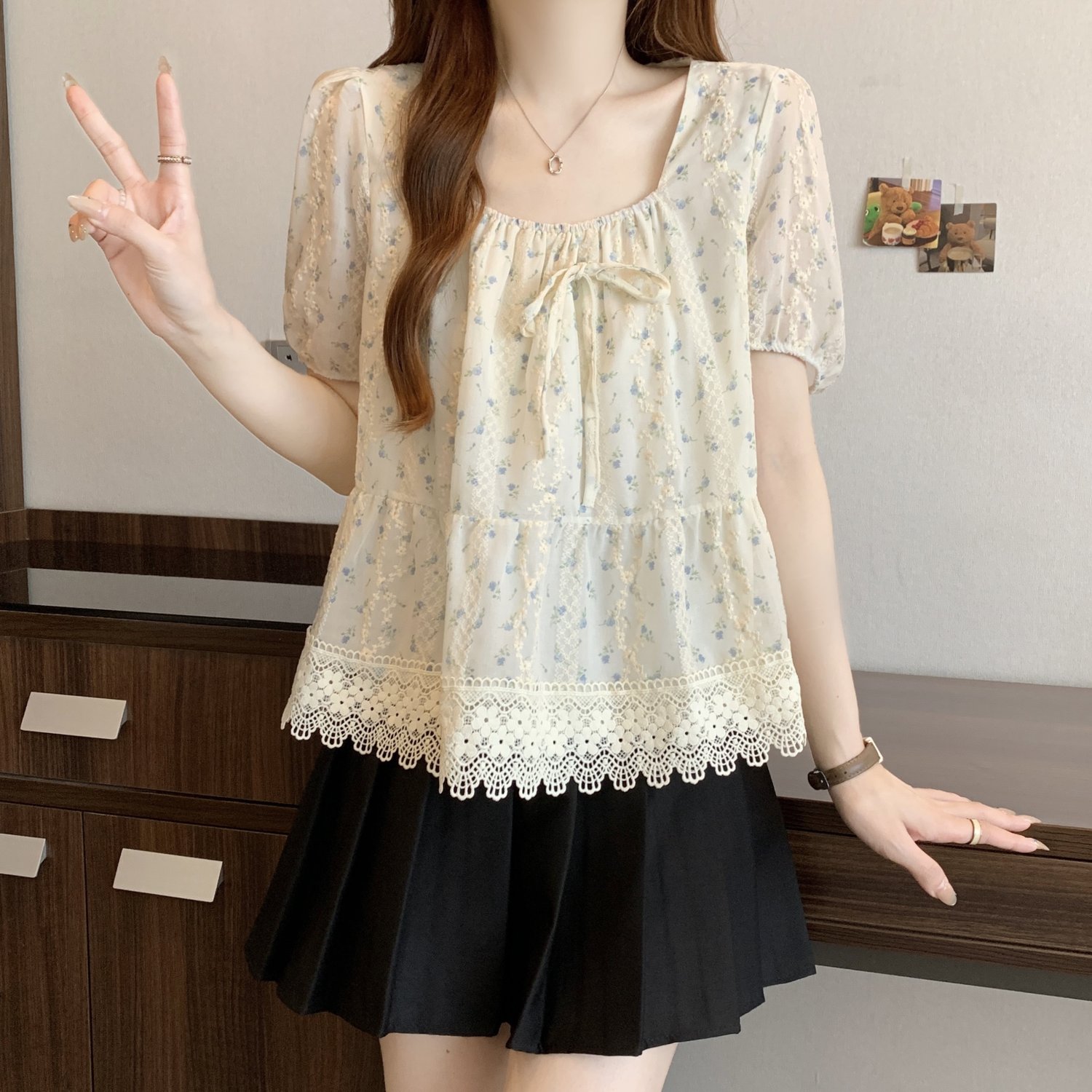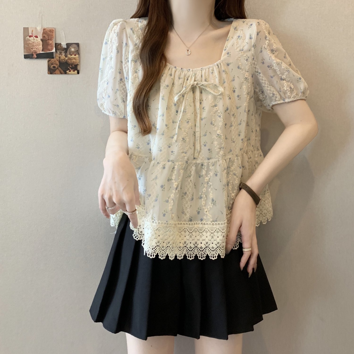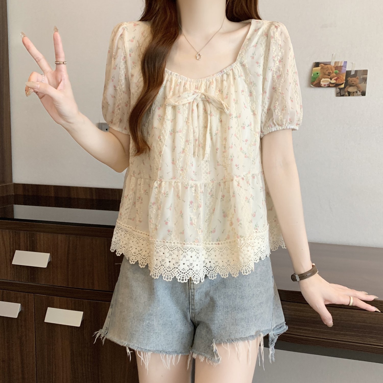 Французская шифоновая рубашка с квадратным вырезом и цветочным принтом и короткими рукавами для женщин, летняя рубашка больших размеров, красивый топ-кукла, закрывающий живот