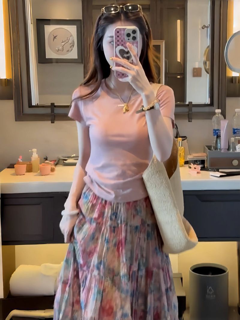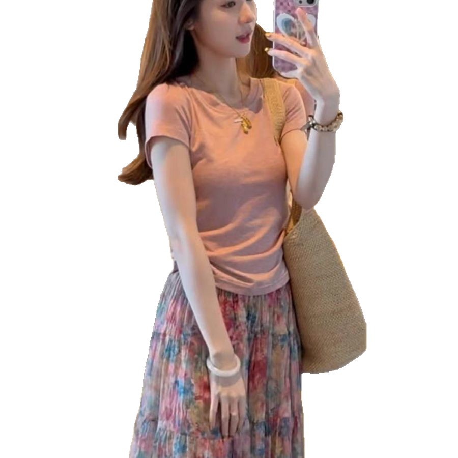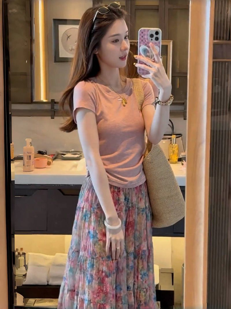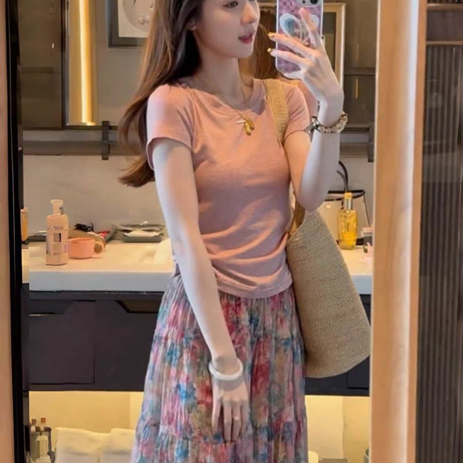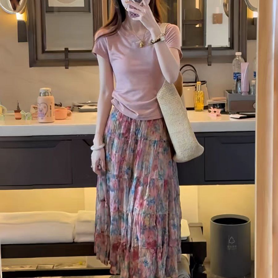 Красивый летний костюм для женщин 2025, новый стиль, нежный стиль, модная футболка с коротким рукавом, юбка с цветочным принтом, комплект из двух предметов